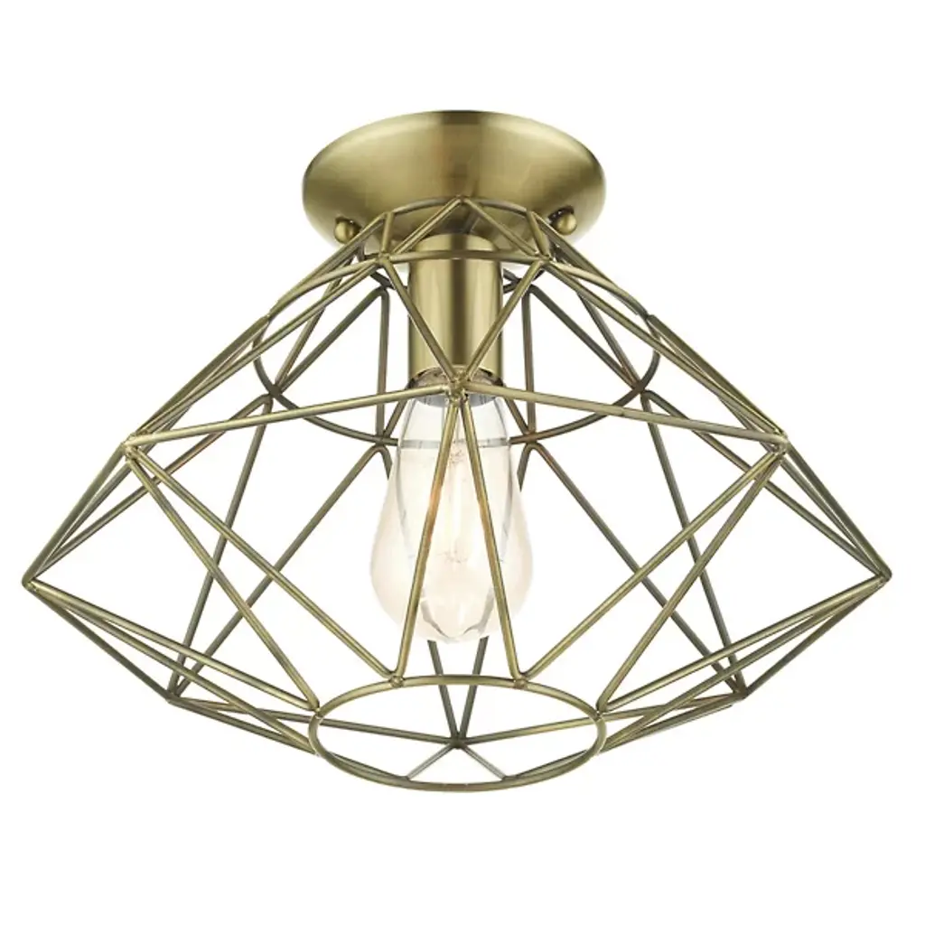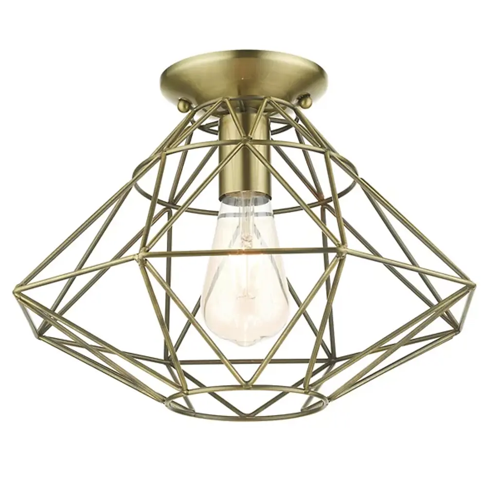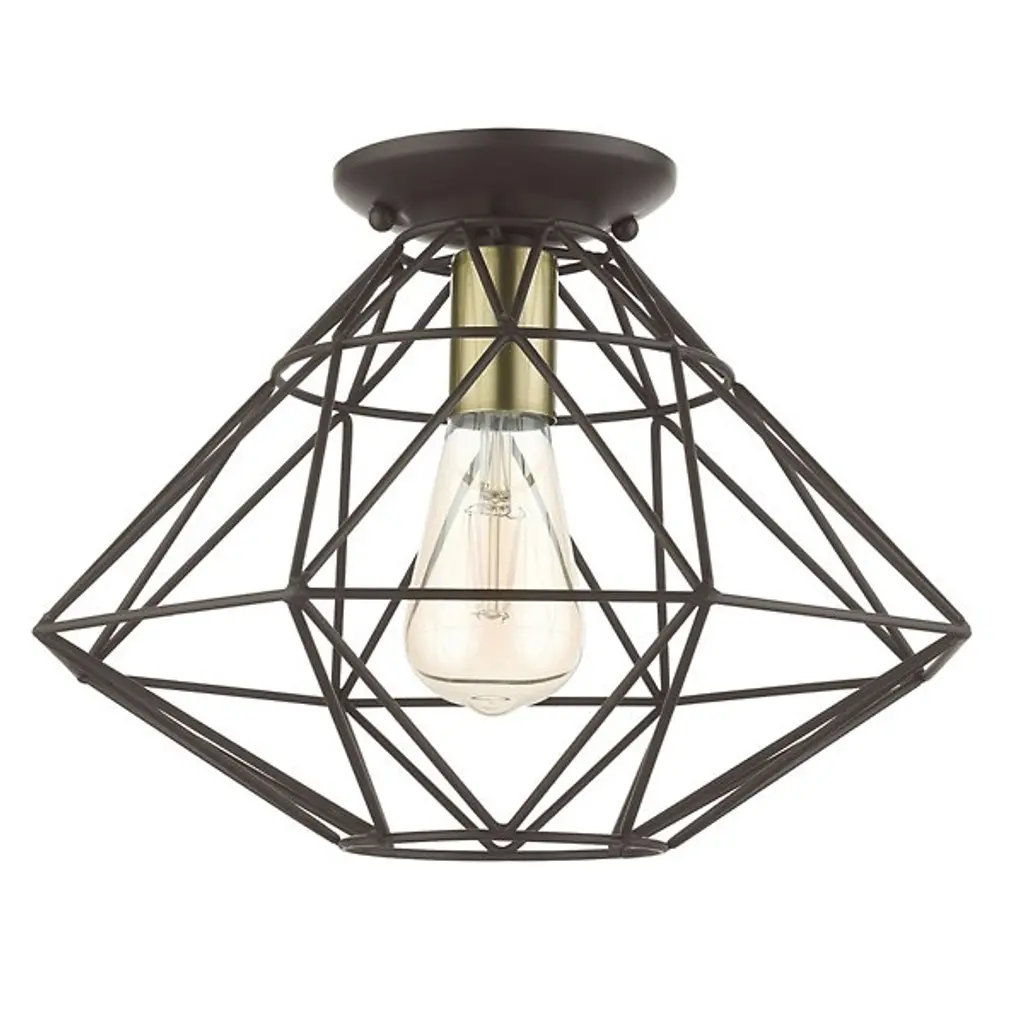 A dazzling diamond realized with pure geometry. The Trent Flushmount from Alder & Ore steps up the contemporary, high-design aesthetic of the home as a piece of functional sculpture. It sits tight to the ceiling with a low-profile canopy. The flush mount offers an impactful visual even with the lights off. Artisans hand-weld the caged structure from a bevy of dynamic shapes. Its shapes come together to create an elegant, inverted diamond, underscored by its open feeling. The open passages of the diamond showcase the delightful bulb. The flush mount turns on to create a filling glow and a wondrous silhouette.