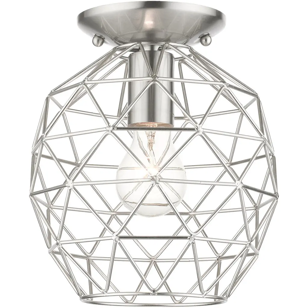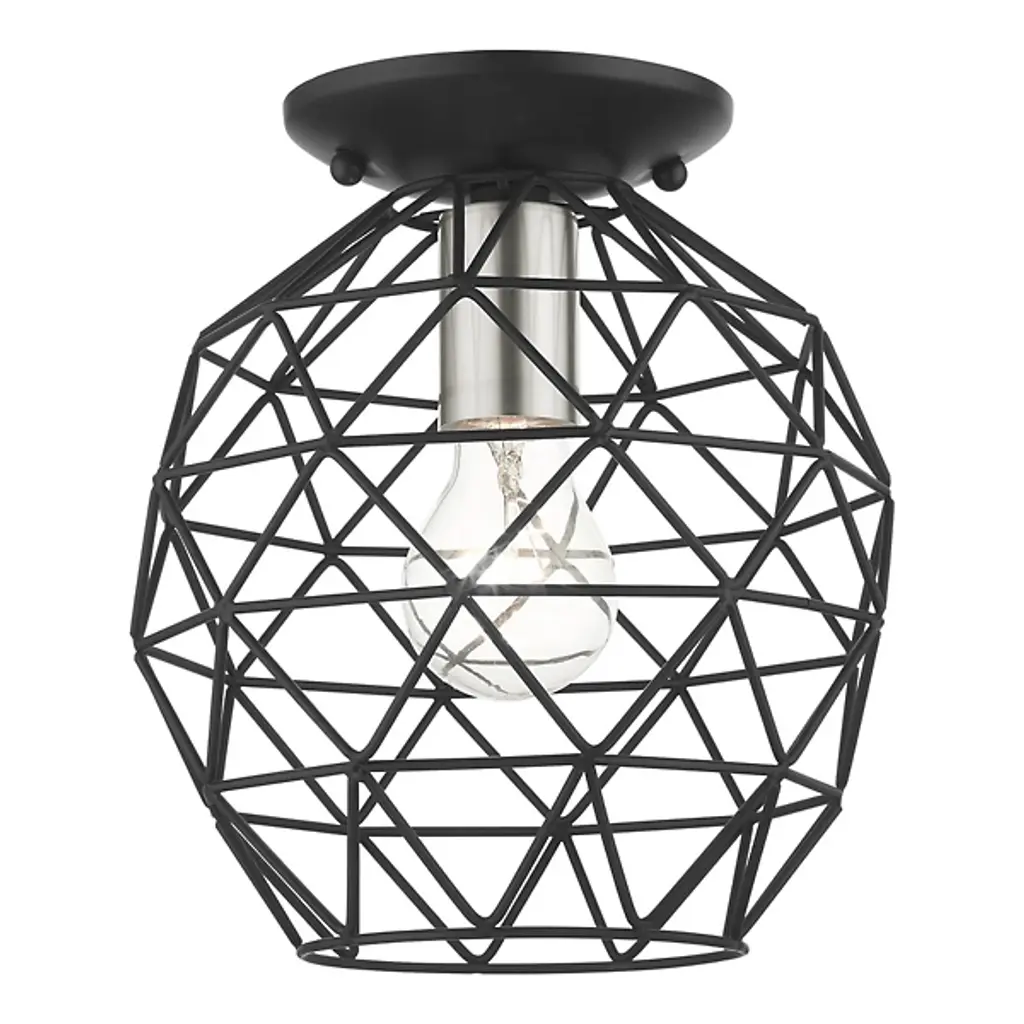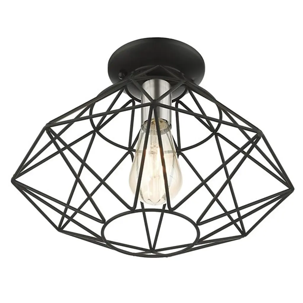 A dazzling diamond realized with pure geometry. The Trent Flushmount from Alder & Ore steps up the contemporary, high-design aesthetic of the home as a piece of functional sculpture. It sits tight to the ceiling with a low-profile canopy. The flush mount offers an impactful visual even with the lights off. Artisans hand-weld the caged structure from a bevy of dynamic shapes. Its shapes come together to create an elegant, inverted diamond, underscored by its open feeling. The open passages of the diamond showcase the delightful bulb. The flush mount turns on to create a filling glow and a wondrous silhouette.