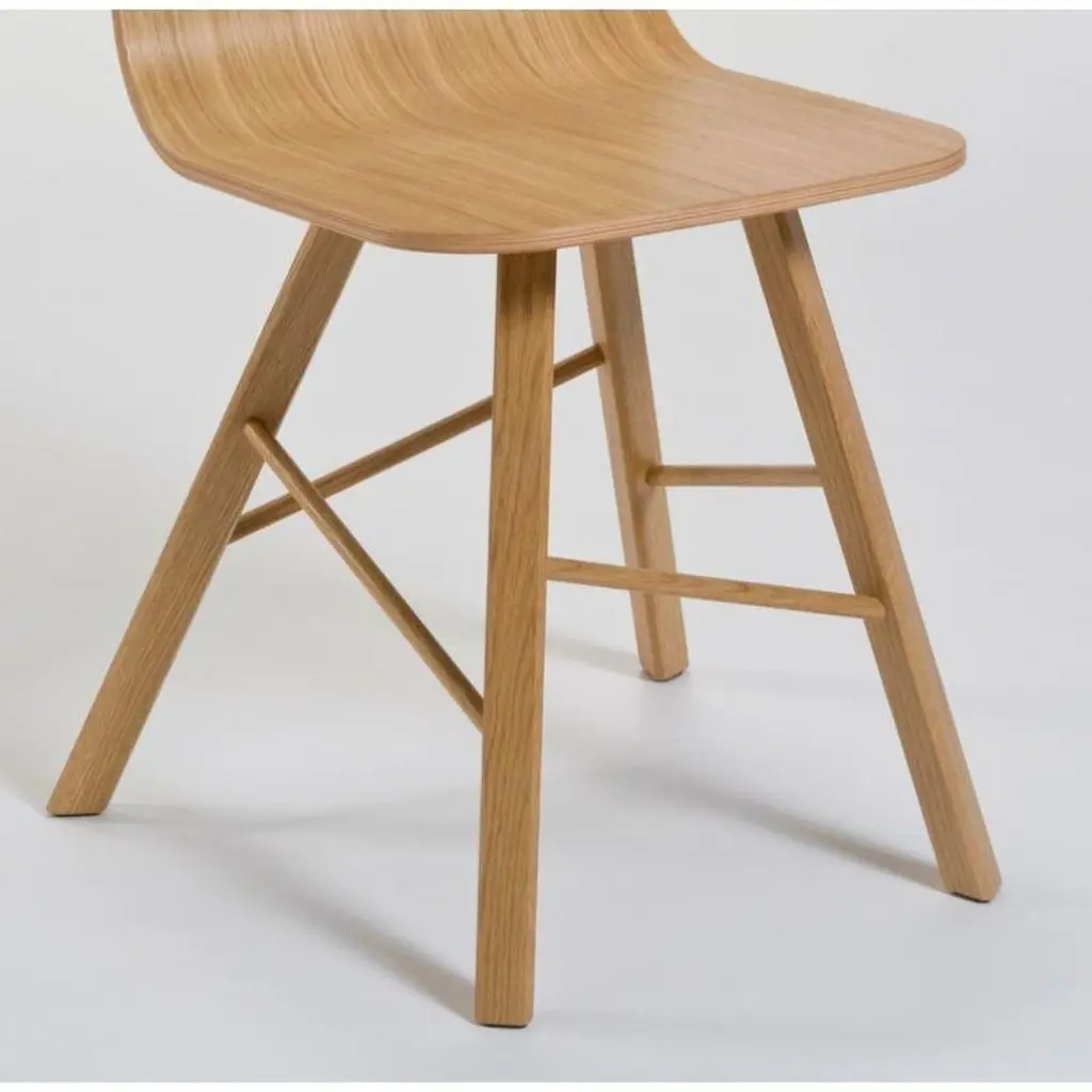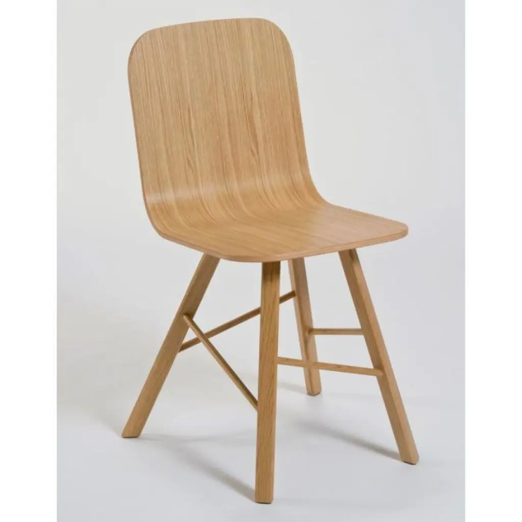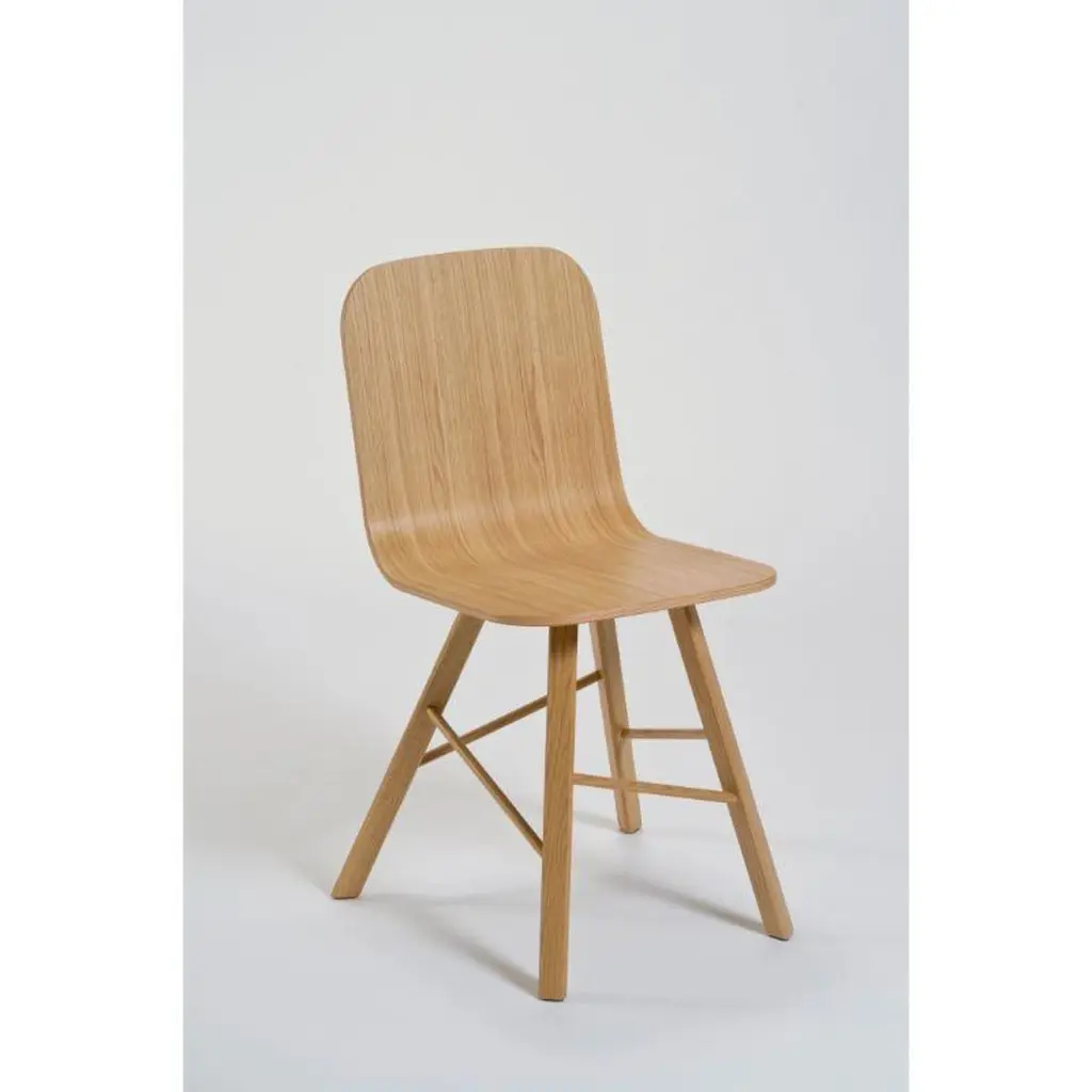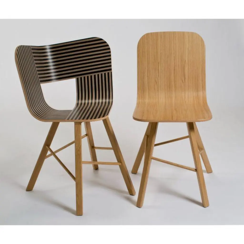 Tria simple oak by Colé Italia by Colé Italia with Lorenz & KazDimensions: H 82.5, D 52, W 58 cmMaterials: Plywood Chair; 4 Legs Solid Oak BaseAlso Available: Tria; 3 Legs, with Cussion, Black, Gold, Simple, Stool, UpholsteredOur iconic chair designed by German duo Lorenz + Kaz. Tria is a table chair, at the same time many people place it asa sculpture, as ornament in an entrance, a bedroom or in a living room. It recalls the impossible forms of Dutch graphicartist and engraver Maurits Escher, defining itself in a game of twists and elusive leak. The corolla-shaped shell can beused in two different seating positions, center or side, in this case with one armrest. The shell is composed of three equal elements in bent plywood assembled together and veneered with a special wood finishing ivory/ black stripes.It is also available in veneered oak, natural or stained open pore in different colors, as well as customized colors (min. 4units). Available with 3 or 4 solid wood legs, or 4 metal legs in different finishings. For a better back comfort if you useTria chair in center position, for dining or studying, you can add a back cushion specially designed for it, upholsteredand coated with a wide range of fabrics.Colé is a young Italian design brand, with a high-end production 100% made in Italy. Born from the experience of Matteo De Ponti, architect, who grew up in one of the most outstanding Milanese design families, and the artistic sensibility of Laura Macagno, degree in Economics and passionate of art and design. Our mission is to create design icons, beautiful and comfortable pieces that can stand the test of time, furnishing houses of international and sophisticated clients, and realized with craftsmanship, thus unique. “We love objects which own deep roots, excellent quality, and a strong evocative power. Archetypal forms dressed with new beauty without losing their classical composure”.Our expressive research is inspired by the utopian force of Italian eminences grises architects and designers of the ’50s, the Scandinavian design, the Bauhaus, ethnic handcraft and houses of famous writers of the XX century, all different as a style but united by the intense soul of those who worked and lived there.
