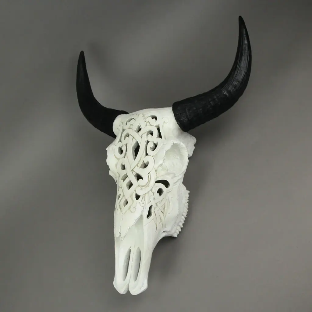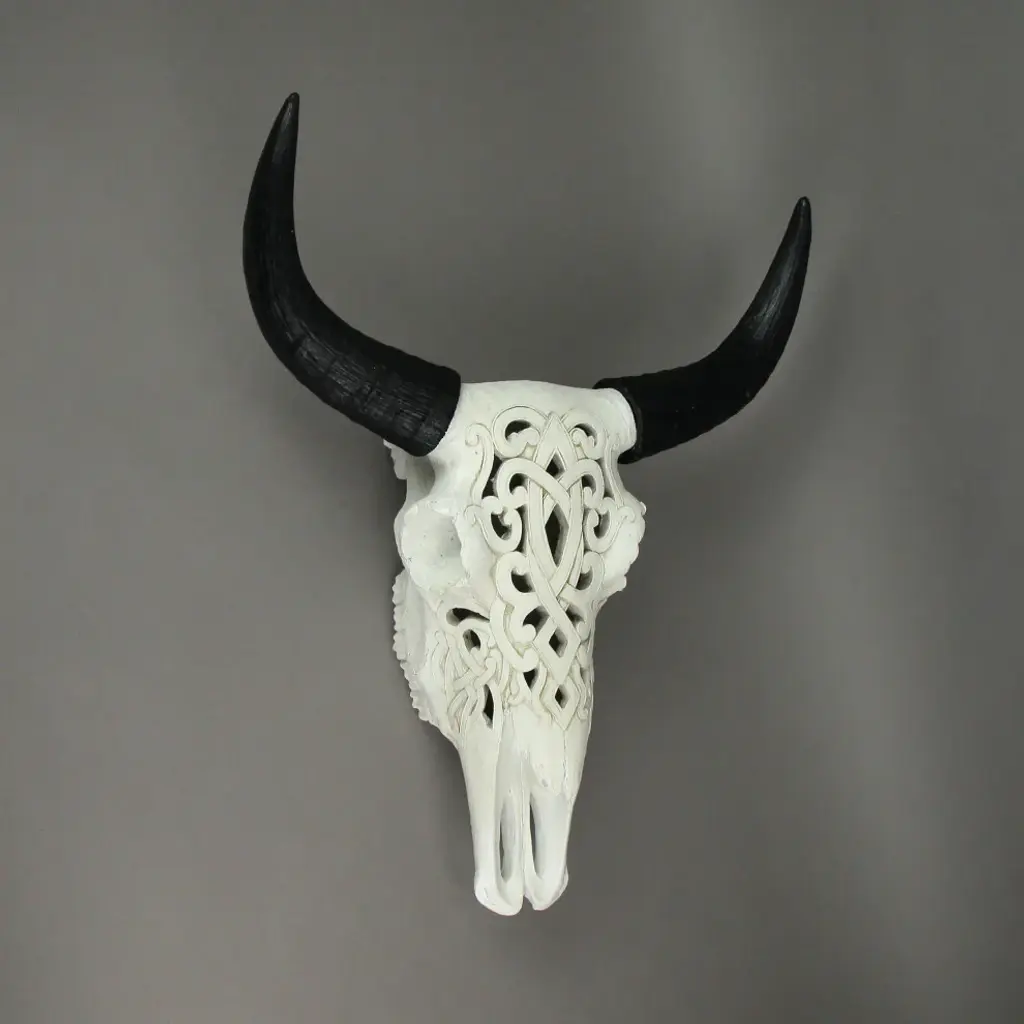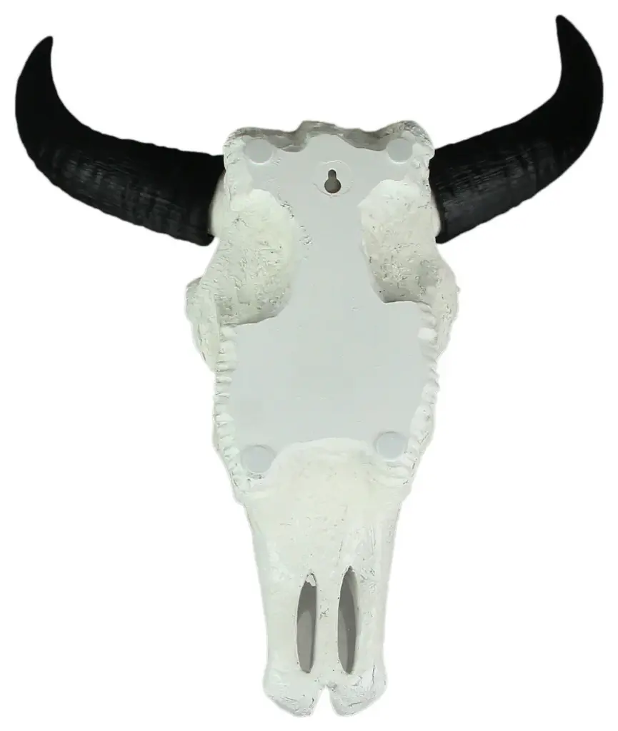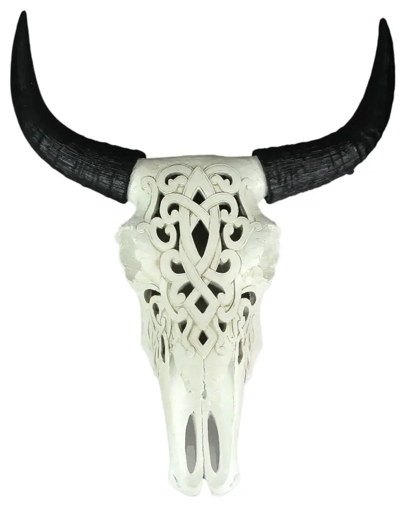 OVERALL SIZE - 19 Inches High, 16 Inches Long, 6.5 Inches DeepDURABLE MATERIAL - Crafted of High Quality Polyresin For Years of Maintenance Free DisplayUNIQUE FINISH - Hand Painted AccentsEASY TO INSTALL - Keyhole Hanger on BackWESTERN DECOR - Adds an Old West Touch to Any RoomFeaturing an intricate and beautifully carved cut-out tribal design, this replica steer skull is an amazing sculpture with an artisan feel you''ll be proud to hang. This 19-inch high, 16-inch wide, 6.5-inch deep skull is expertly cast in resin, and hand-painted in white, with black horns. The aged finish gives the appearance of real bone, yet is 100% animal friendly! This wall hanging is a wonderful gift that any Western decor lover is sure to admire!