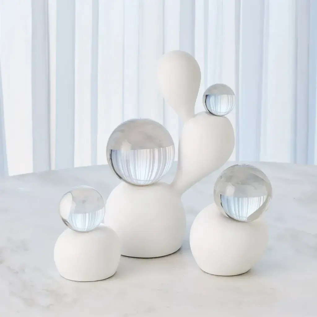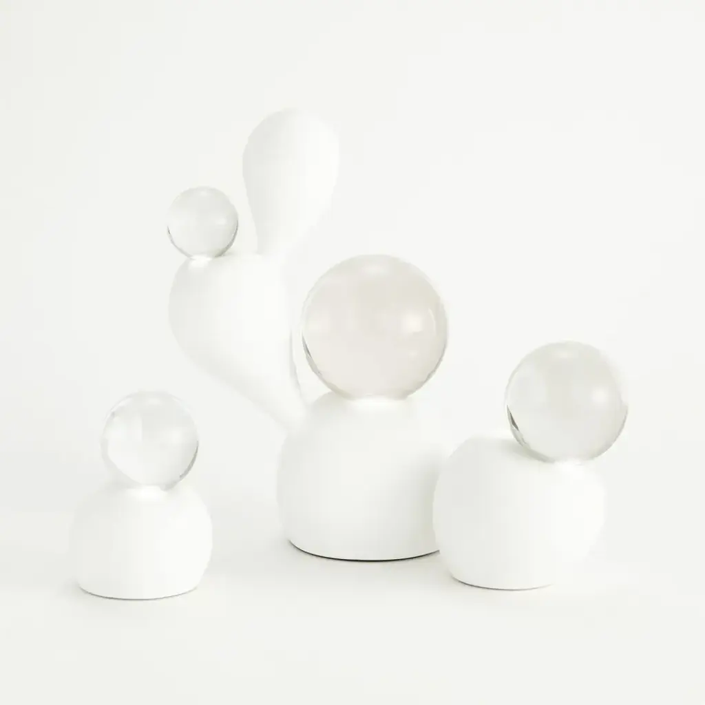 The Meringue Sculptures are whimsical pieces of art constructed of plaster with a white finish and crystal spheres. From a fashion forward perspective, Global Views offers accessories, furniture, statement lighting, and an assortment of rugs and mirrors to add beauty and joy to your home.