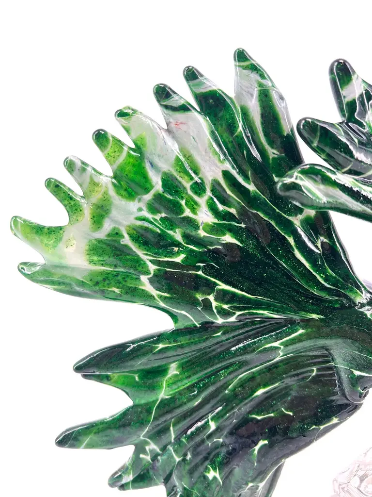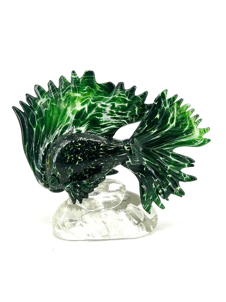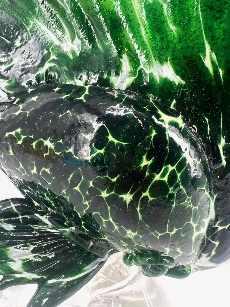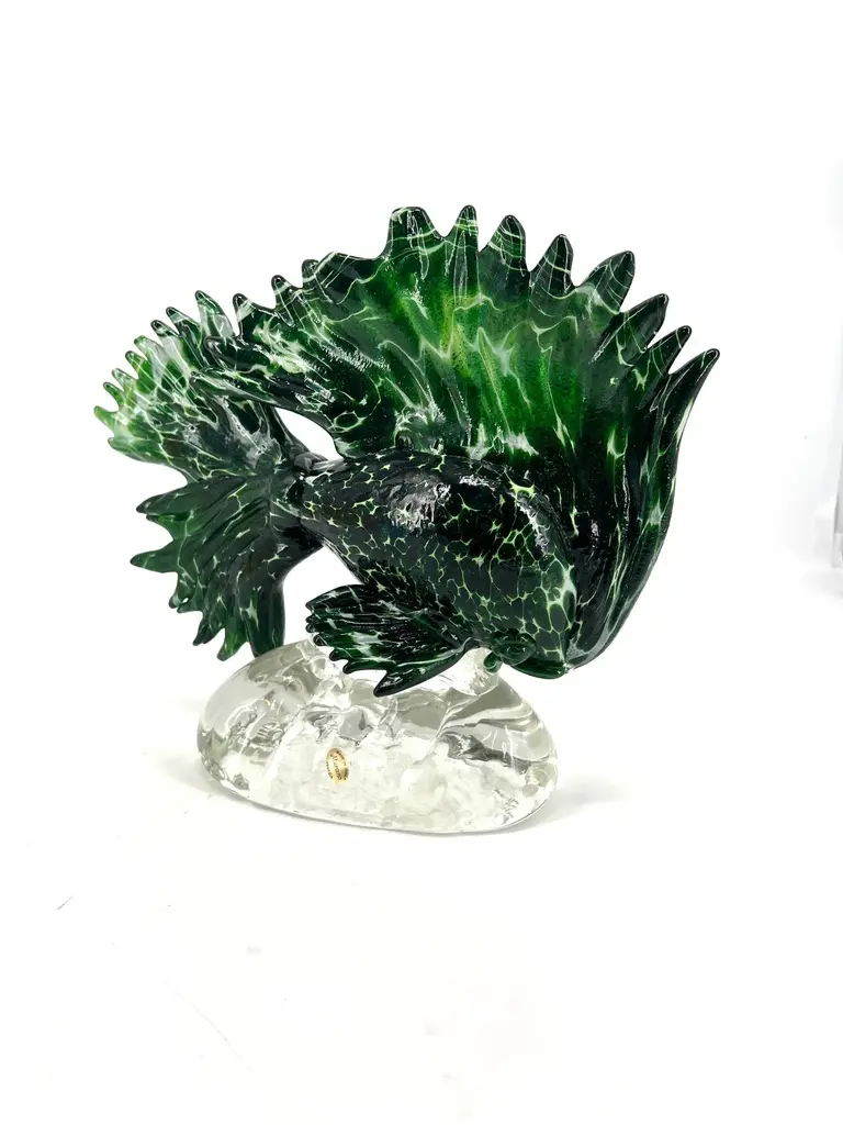 Tropical Fish Sculpture in Murano Glass This magnificent tropical fish sculpture was created by hand by a famous master, one of the most renowned Murano artists. The sculpture represents an elegant and fascinating tropical fish, capturing the essence of marine life in a unique work of art. The sculpture has a height of approximately 32 centimeters, a width of approximately 33 centimeters and a depth of approximately 12 centimeters, making it an impressively sized piece that will stand out in any setting. Its balanced proportions and meticulous detail give the sculpture a dramatic presence. Made of Murano glass with the use of green aventurine, this sculpture is an example of craftsmanship and technical mastery. Green aventurine gives the fish a shimmering and iridescent appearance, evoking the iridescence and beauty of the seabed. The white spots on the sculpture add realistic details, creating a fascinating contrast with the emerald green. The sculpture is accompanied by a certificate of originality. This certificate authenticates the work as a Murano artisan product and attests to its quality and uniqueness. Labeled by Maker,Labeled with Country of Origin