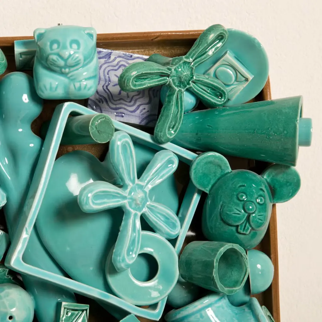 An array of ceramic accoutrements depicts a microcosm of life. Handcrafted flawlessly, this turquoise wall sculpture is a great example of the "pop and humoristic" vision of master ceramist Roberto Cambi.