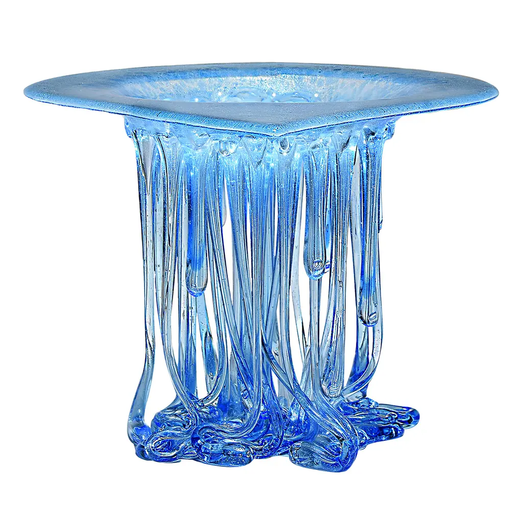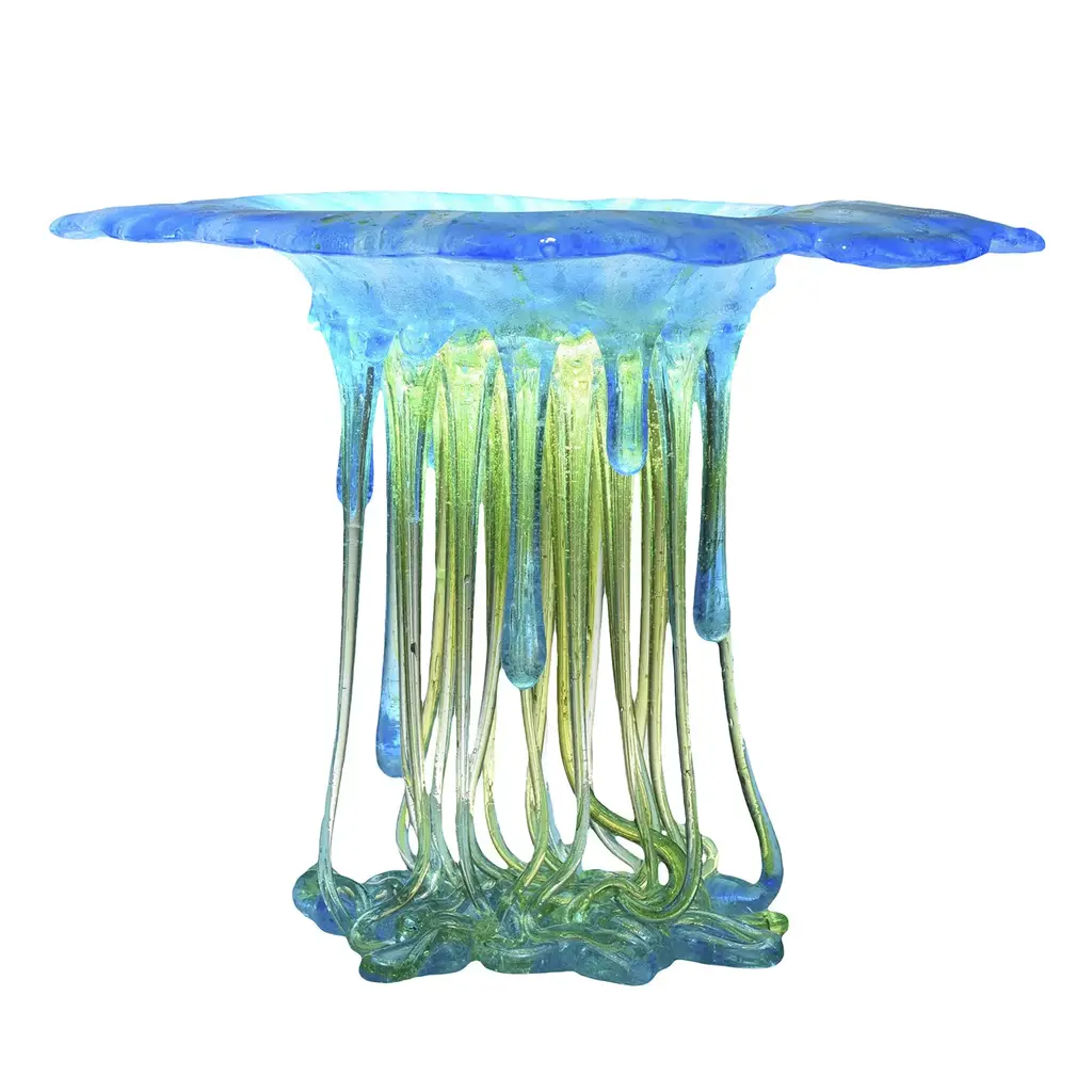 This gorgeous, unique turquoise-colored sculpture is made from beautiful Murano glass from photoluminescent materials fused at high temperatures. The form of the sculpture, with its open, flowing top and drippings underneath, seems almost like an elegant jellyfish with its tentacles, perfect to decorate any home or office space. Thanks to photoluminescence, the product absorbs external ambient light, releasing it in dark or semi-dark conditions, thus self-illuminating for many hours and creating an evocative effect. The technique used does not allow for exact reproduction so the colors may vary.