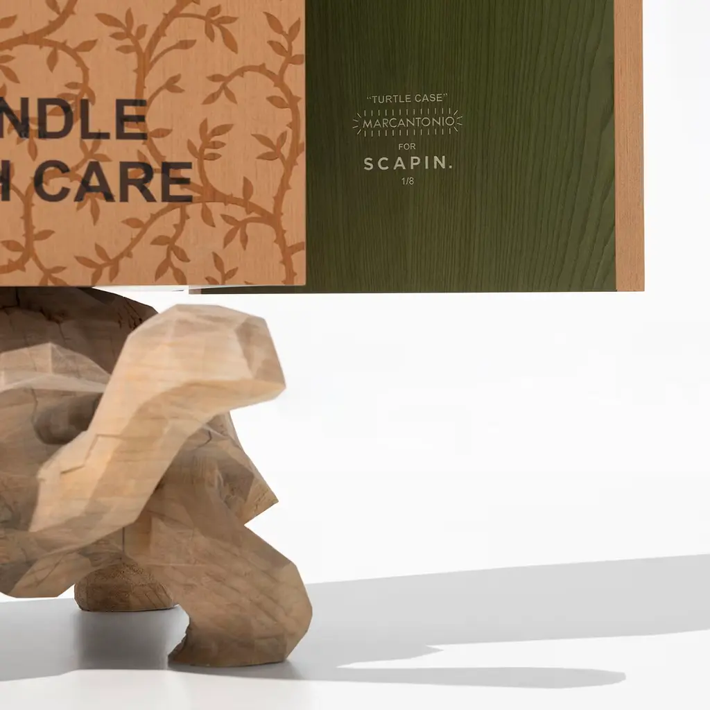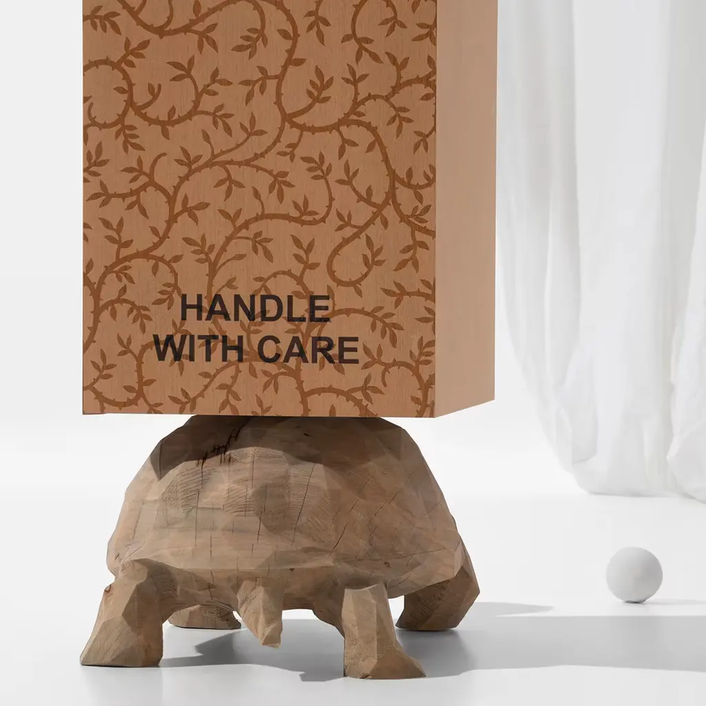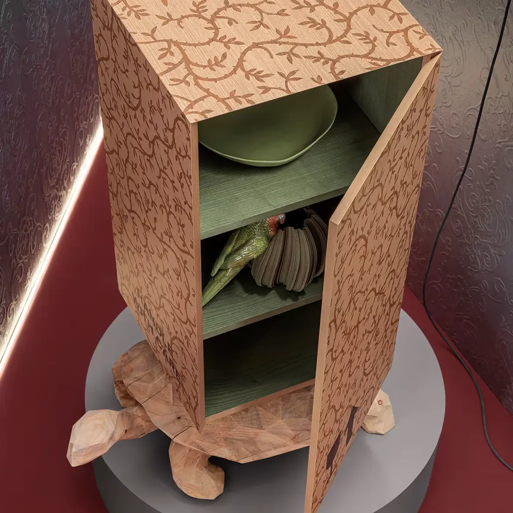 Part of the Wooderkammer Collection produced in a limited edition of only eight, this unconventional sculpture-cabinet is a statement-making piece composed of two contrasting elements. The turtle is entirely hand-carved from a single section of a tree trunk and supports a tall wooden case embellished with an exquisite inlay of sinuous branches executed entirely by hand. The interior is finished in olive green and the exterior features the fragile icon sign on one side, the artist logo and item number on the other, and "Handle with Care" in front.