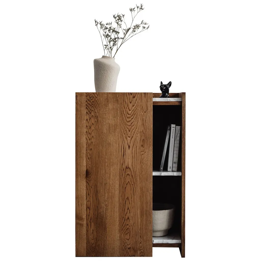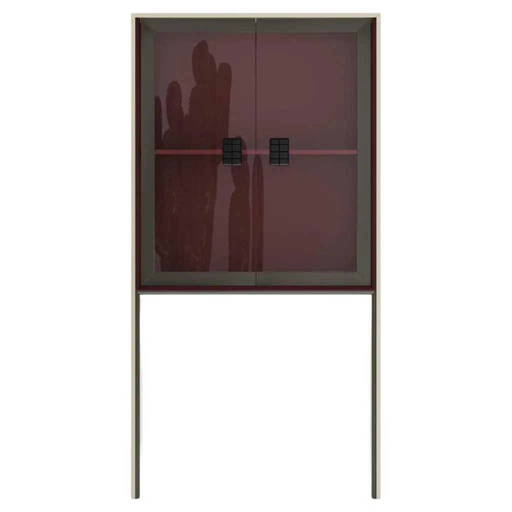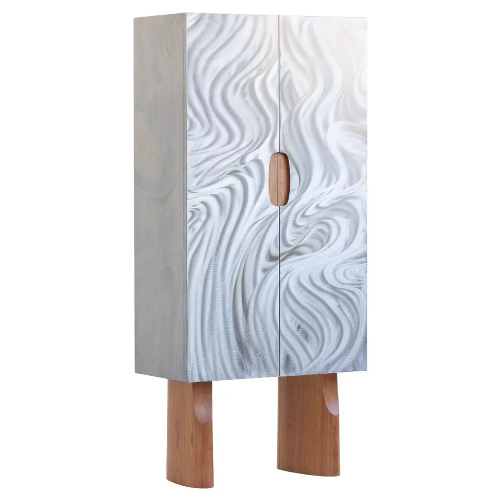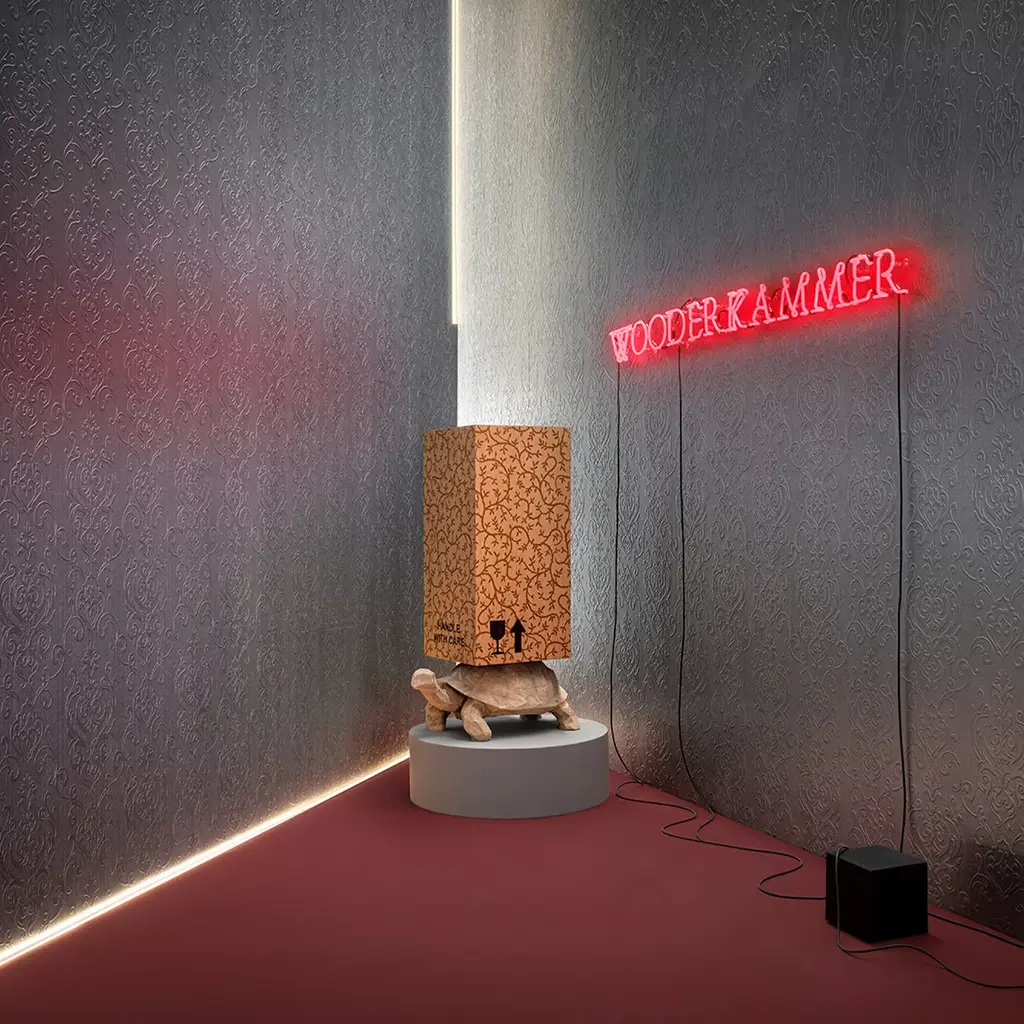 Part of the Wooderkammer Collection produced in a limited edition of only eight, this unconventional sculpture-cabinet is a statement-making piece composed of two contrasting elements. The turtle is entirely hand-carved from a single section of a tree trunk and supports a tall wooden case embellished with an exquisite inlay of sinuous branches executed entirely by hand. The interior is finished in olive green and the exterior features the fragile icon sign on one side, the artist logo and item number on the other, and "Handle with Care" in front.