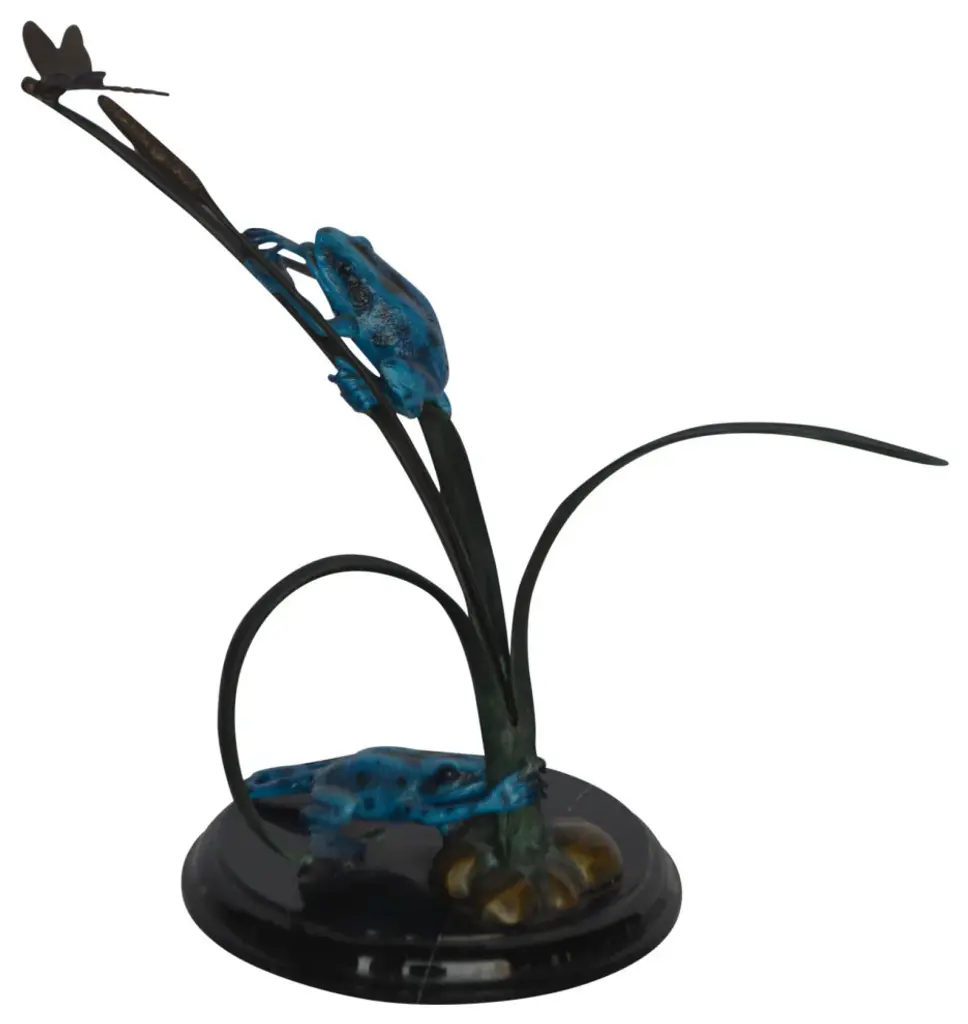 Two Blue Frogs Catching A Dragonfly Bronze Statue - Size: 14"l X 8"w X 12"h.