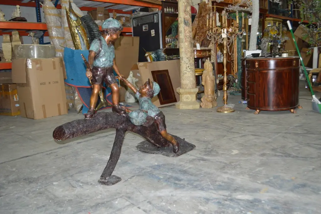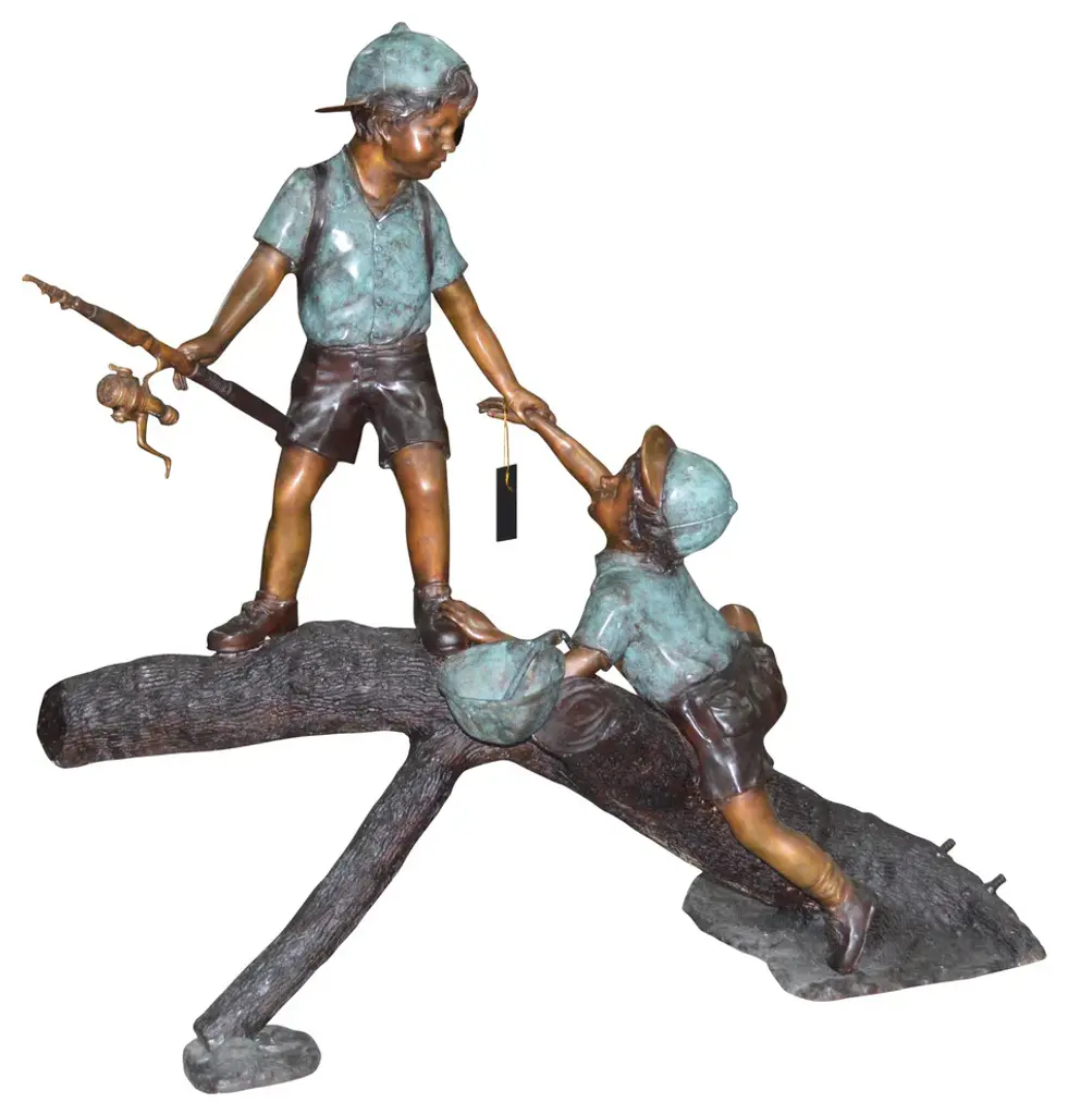 Two Boys Fishing On Tree Log Bronze Fountain - Size: 53"l X 25"w X 47"h.