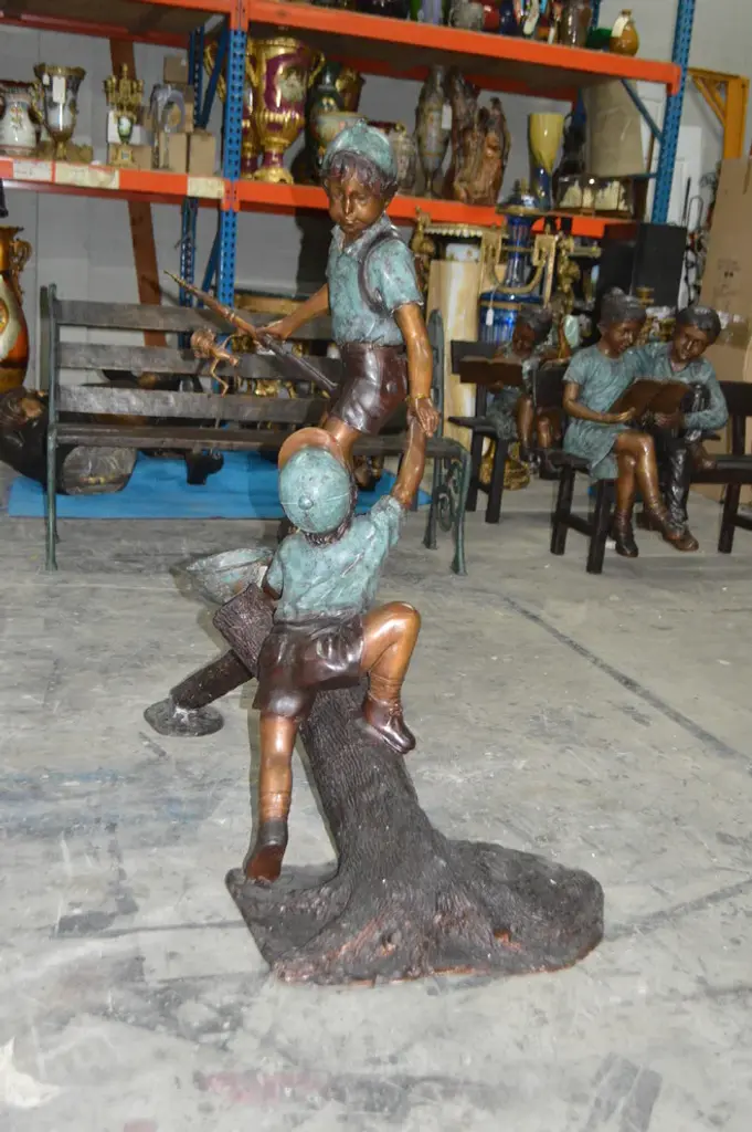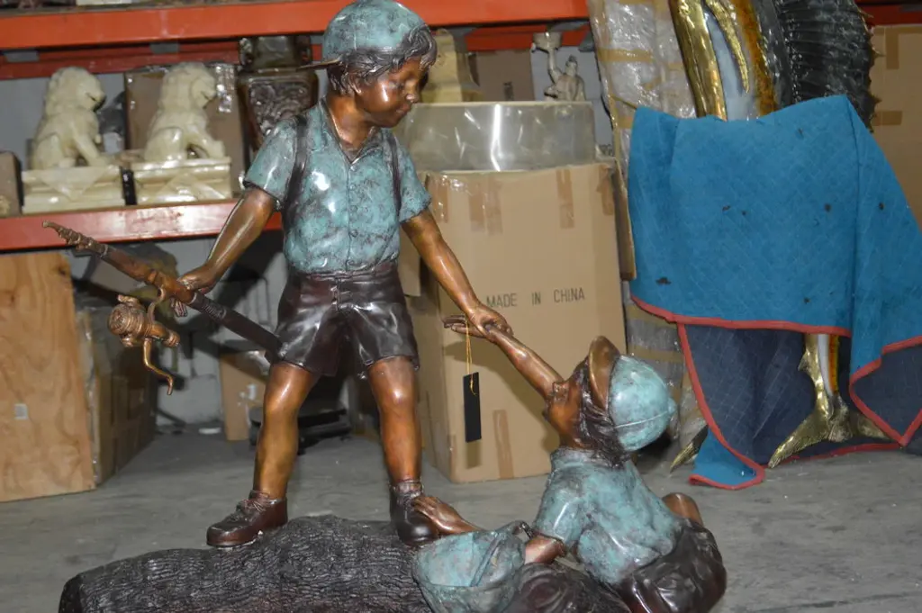 This Bronze Sculpture - Fountain of two little kids on a tree log fishing at the pond. Water spills out from the bucket that the kid is holding as well as from the end of the tree log with the use of a fountain pump (pump not included). This statue depicts childhood play in the old days (when kids did not have smartphones). The bronze tones are finished in a lacquer patina. This is a perfect addition to a garden, and reminds us of the simple things in life. Size: 53"L x 25"W x 47"H. Weight is: 99Lb