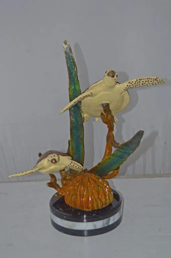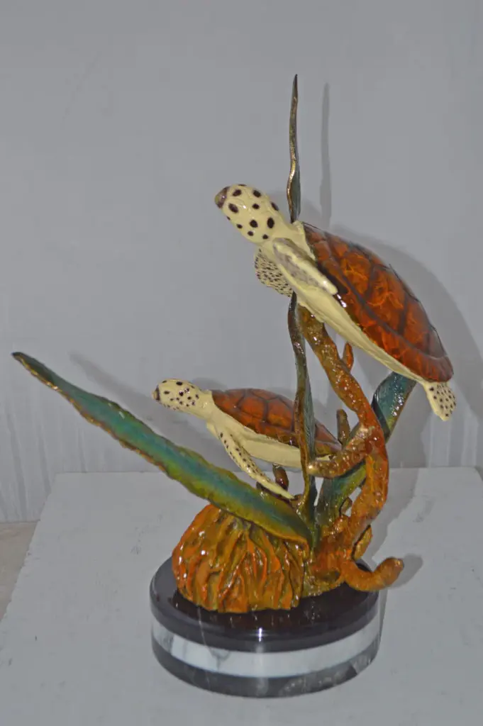 This Tabletop bronze statue represents a beautiful scene of the ocean, almost taken out of Finding Nemo Movie. The turtles are displayed with bright colors through the use of enameling over bronze. This bronze statue is cast in the traditional lost-wax method, which highlights the exceptionally fine detail and guarantees lasting heirloom beauty. The artist did not forget to incorporate specific designing of their faces and posture to ensure a realistic looking scene. This bronze statue would look adorable in any space of the home of any ocean life lover. Size: 12"L x 16"W x 19"H. Weight is: 22Lb