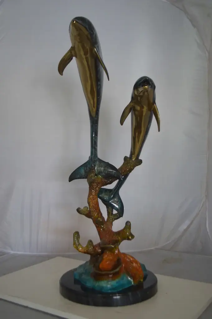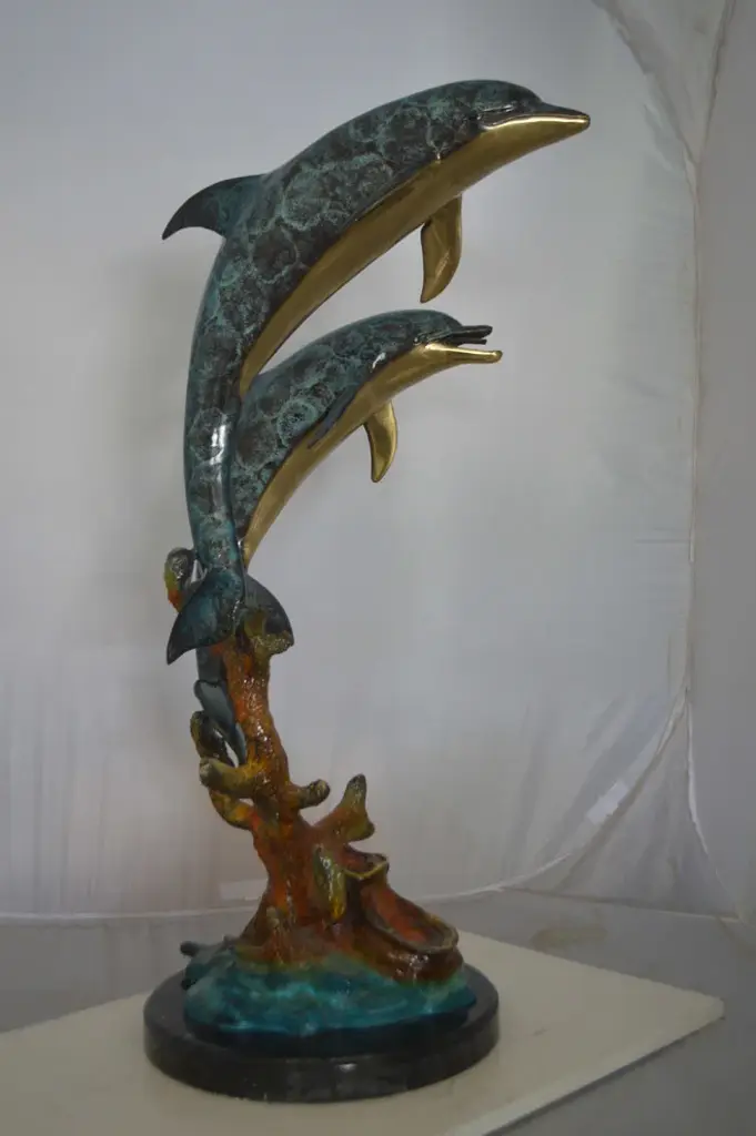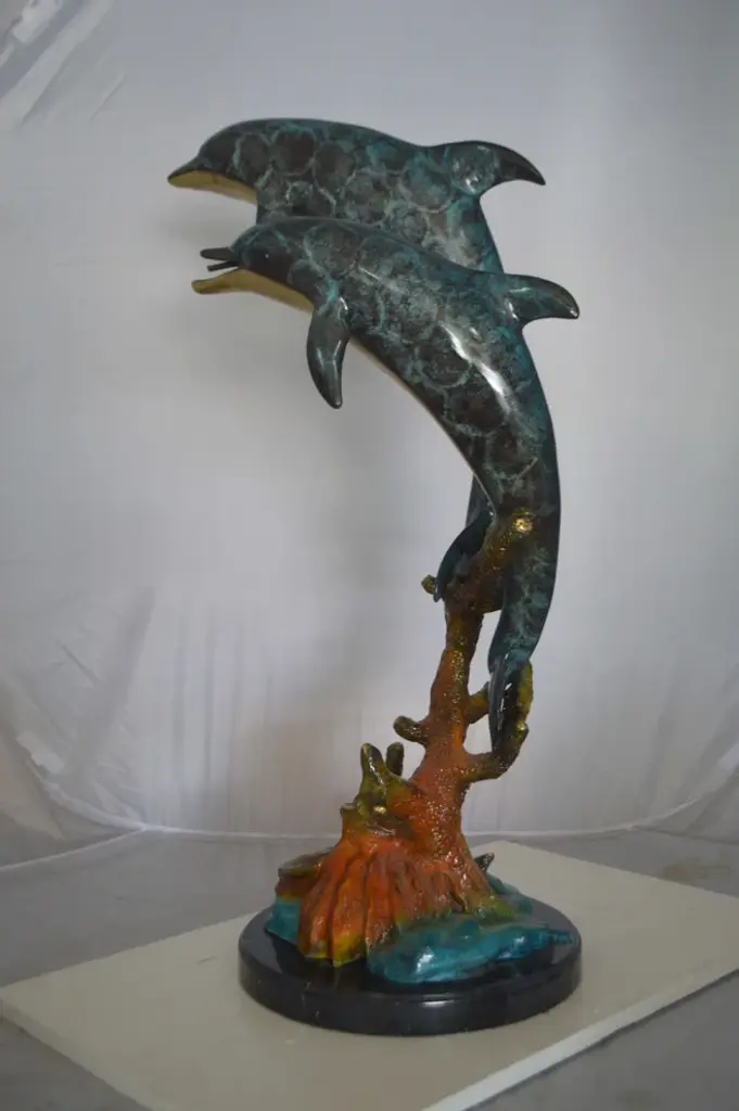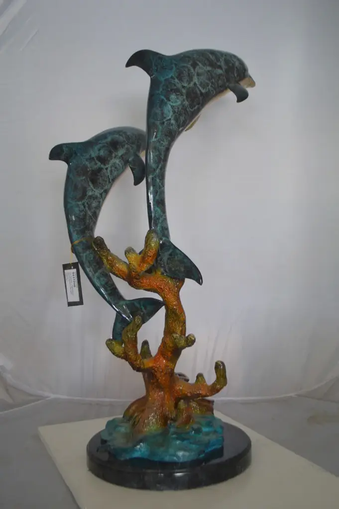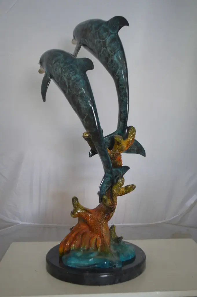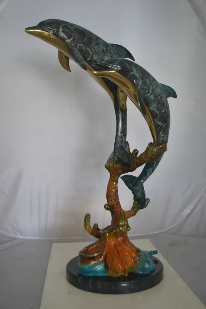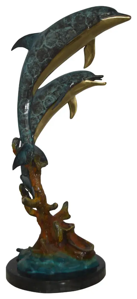 No lover of timeless sea lore and the mysteries of the deep sea can resist this incredibly detailed statue, fountain of two dolphins diving down to the bottom of the ocean. The fountain is equipped with a hose that sprays water out of the dolphin mouths, with the use of a fountain pump (pump is not included). Handcrafted in cast brass and finished with colors deeper than the ocean itself, this breathtaking expression of the world beneath the waves beautifies any space and enhances any decor. This impressive Bronze Statue will be a permanent fixture on the grounds of your estate for years to come (this statue may be available without the fountain features, please send us a message to find out if available in stock) Size: 19"L x 15"W x 36"H. Weight is: 86Lb