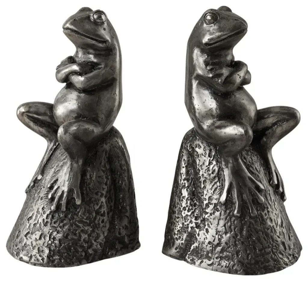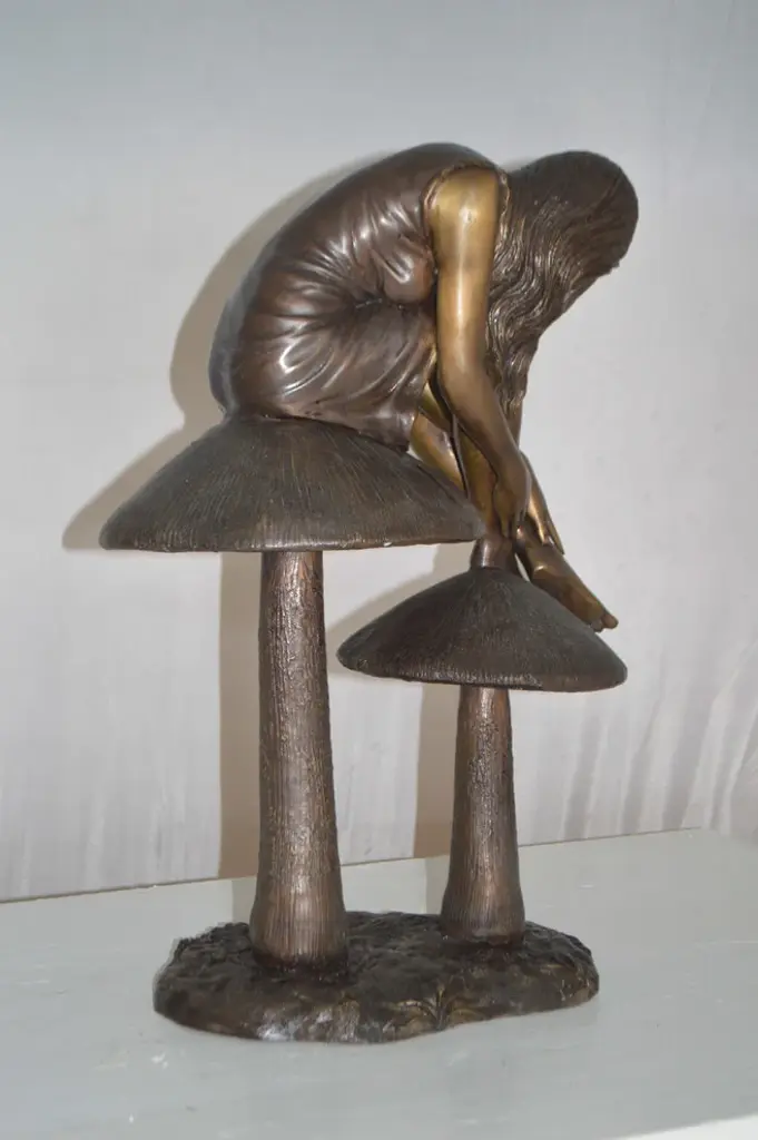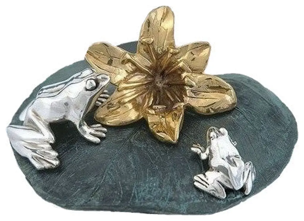 The "2 Frogs Balancing on Mushrooms" sculpture is a whimsical pair of tree frogs playing on mushrooms colored in verdigris and bronze patina. This pair will certainly complement any garden scenario.