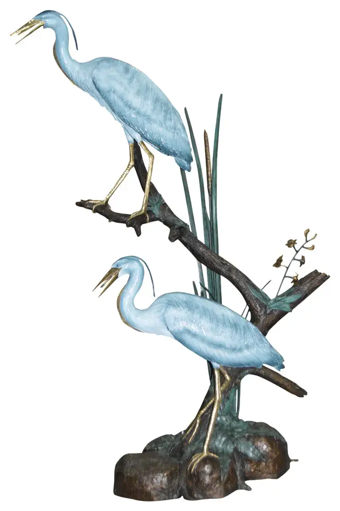 Surprise your garden guests with this large size outdoor/indoor Bronze fountain Statue of Three herons standing on a tree stump. Each one of the herons is equipped with a hose that sprays water out of their mouth, with the use of a fountain pump (pump is not included). Produced using superior quality bronze and a traditional casting method that yields pristine details. . The patina chosen for this Timeless Creation is stained in green and brown patina finish for preservation, 100% handmade and 100% bronze. This impressive Bronze Statue will be a permanent fixture on the grounds of your estate for years to come. Size: 36"L x 21"W x 64"H. Weight is: 99Lb