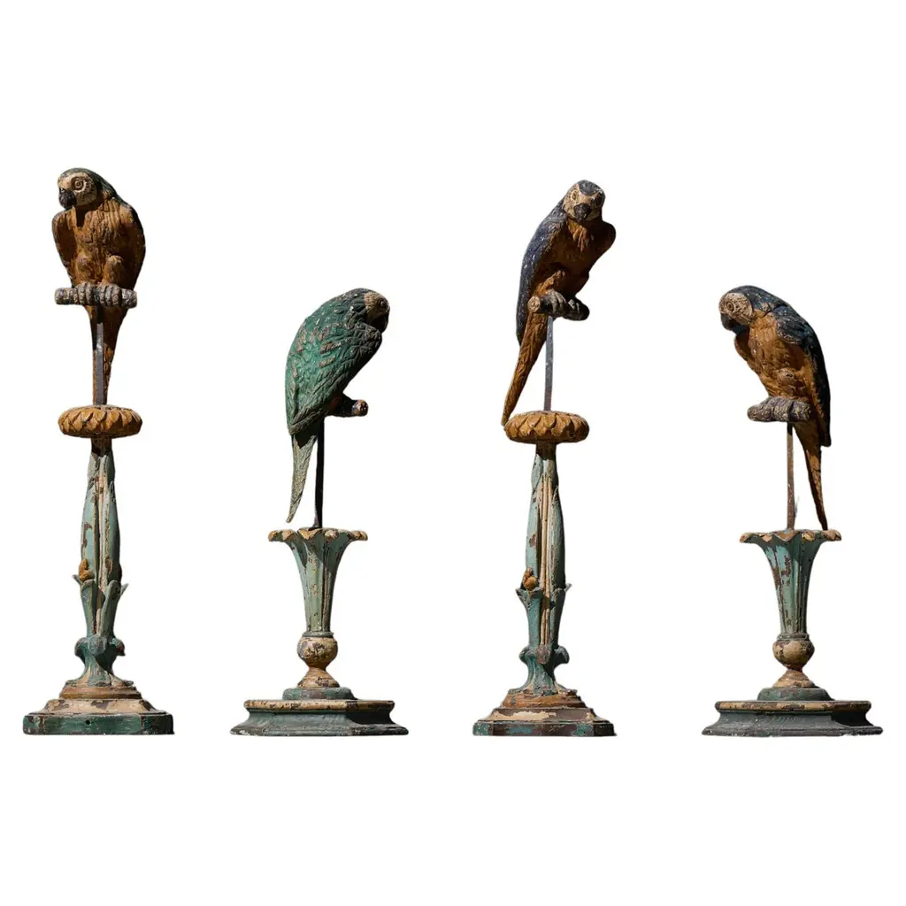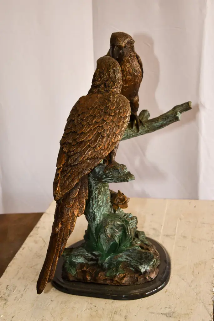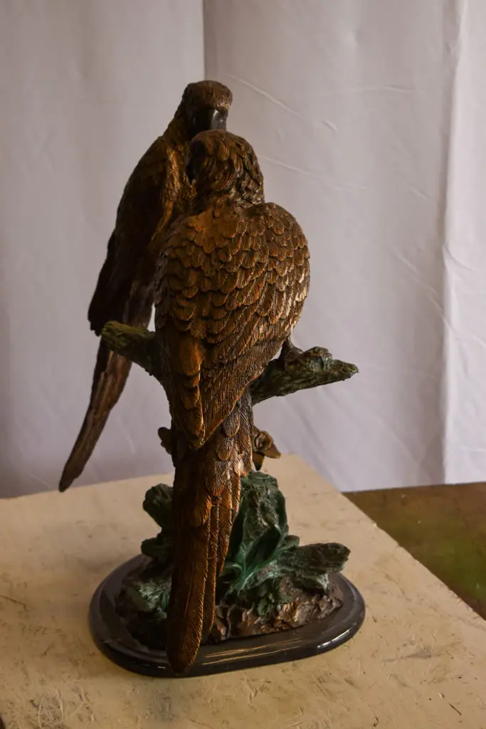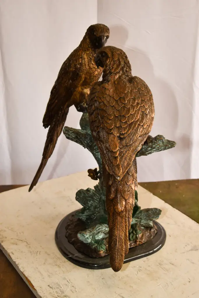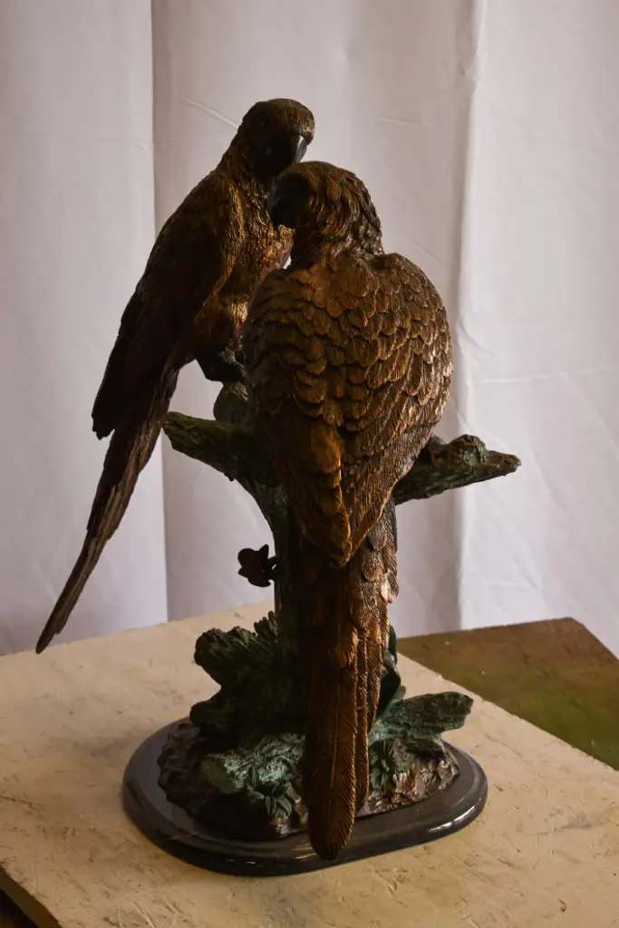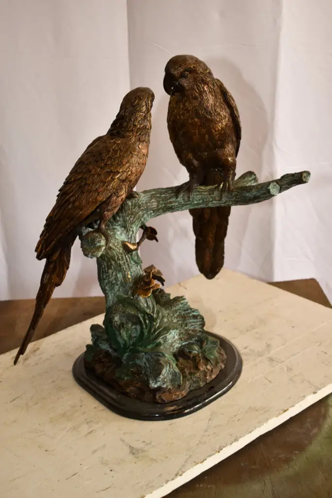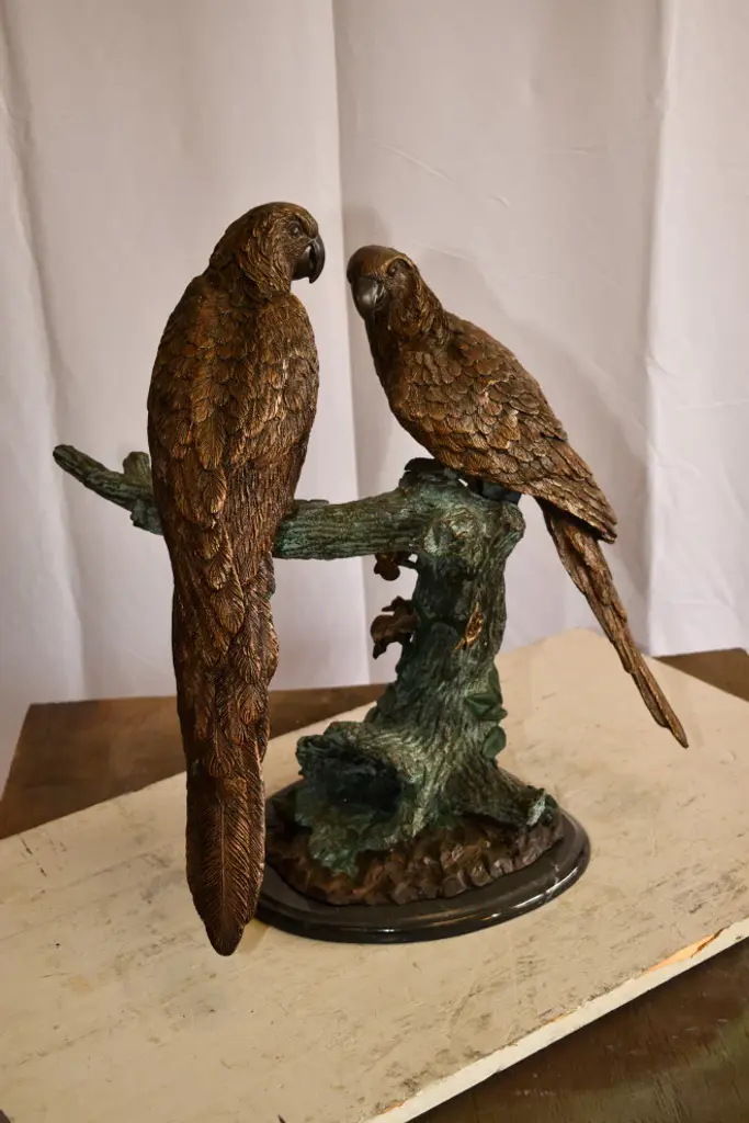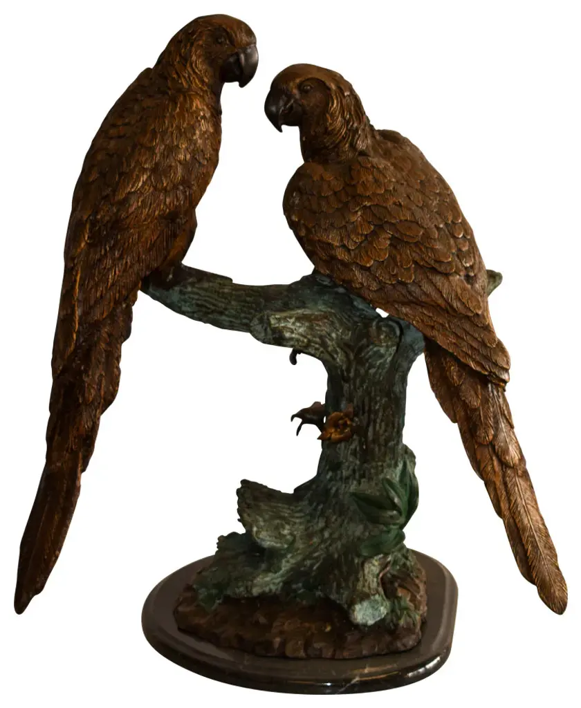 A pair of parrots made of bronzed metal perched on a stand with hand-painted finish. This extraordinary sculpture features a realistic tree trunk that supports two parrots rendered in detail. Each parrot is shown with marvelous detail to the feathers, beaks and eyes each with a unique expression and pose. Please note how these parrots capture in a delightful manner. Size: 13"L x 20"W x 23"H. Weight is: 35Lb