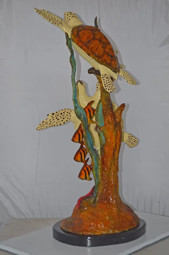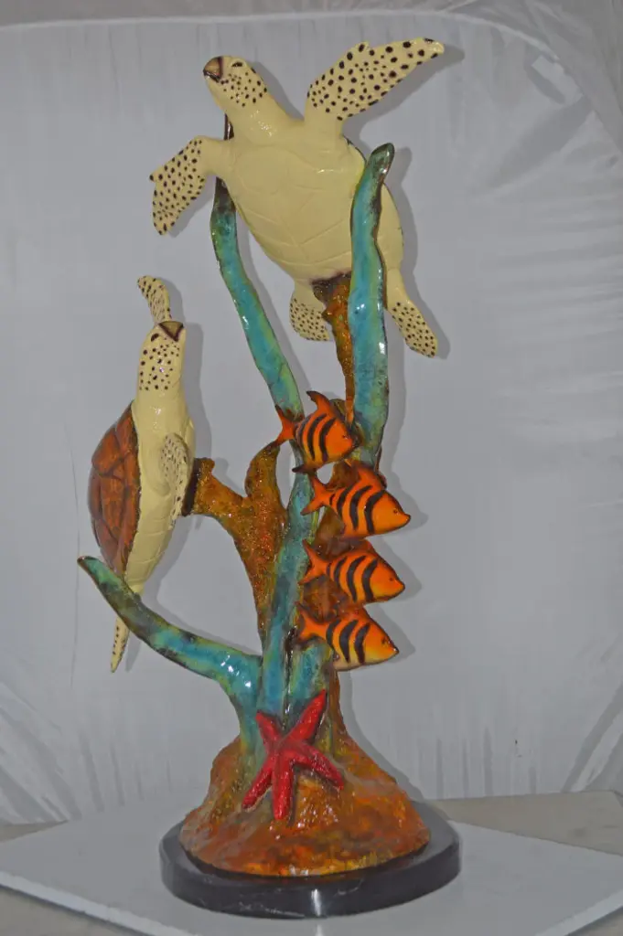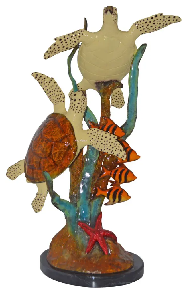 This large bronze statue represents a beautiful scene of the ocean, almost taken out of Finding Nemo Movie. The turtles and clownfish are displayed with bright colors through the use of enameling over bronze. This bronze statue is cast in the traditional lost-wax method, which highlights the exceptionally fine detail and guarantees lasting heirloom beauty. The artist did not forget to incorporate specific designing of their faces and posture to ensure a realistic looking scene. This bronze statue would look adorable in any space of the home of any ocean life lover. Size: 18"L x 31"W x 42"H. Weight is: 83Lb