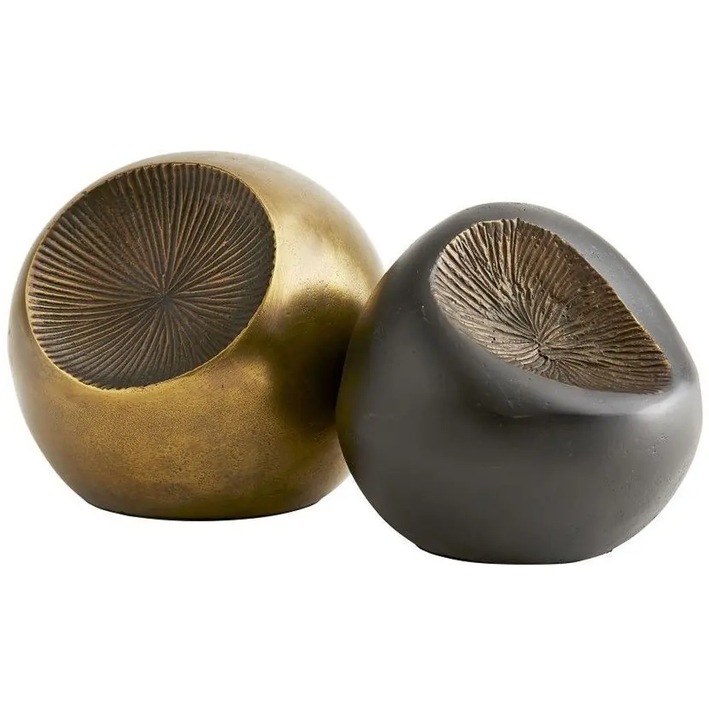 Add organic, sculptural appeal to interiors with the striated forms of the Uberto Sculpture Set of 2 from Arteriors. These two ball-shaped constructions of tough teak root evoke the rough sensibility of found objects. They are colored in contrasting ebony and natural hues, presenting an artisanal style without overpowering their environment.