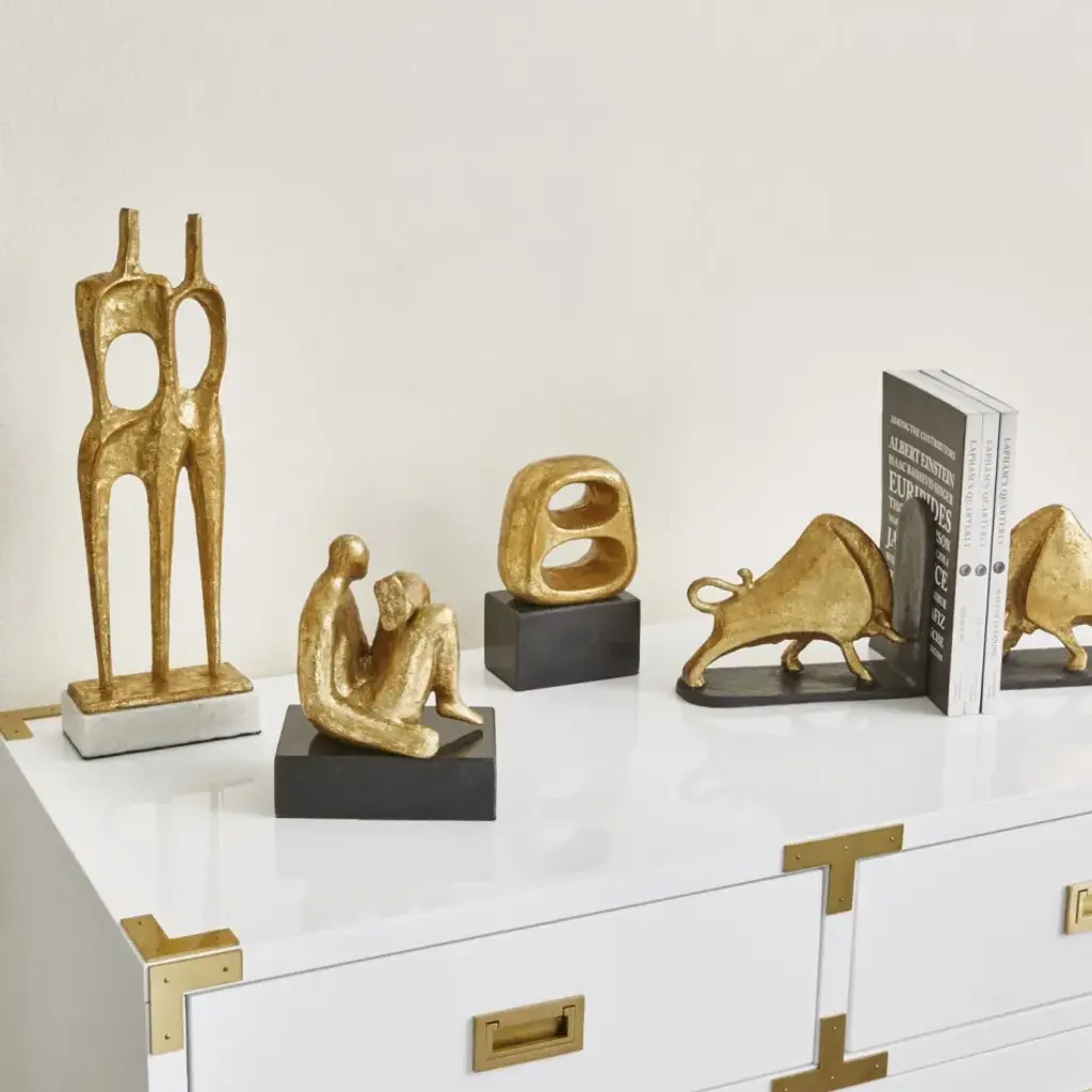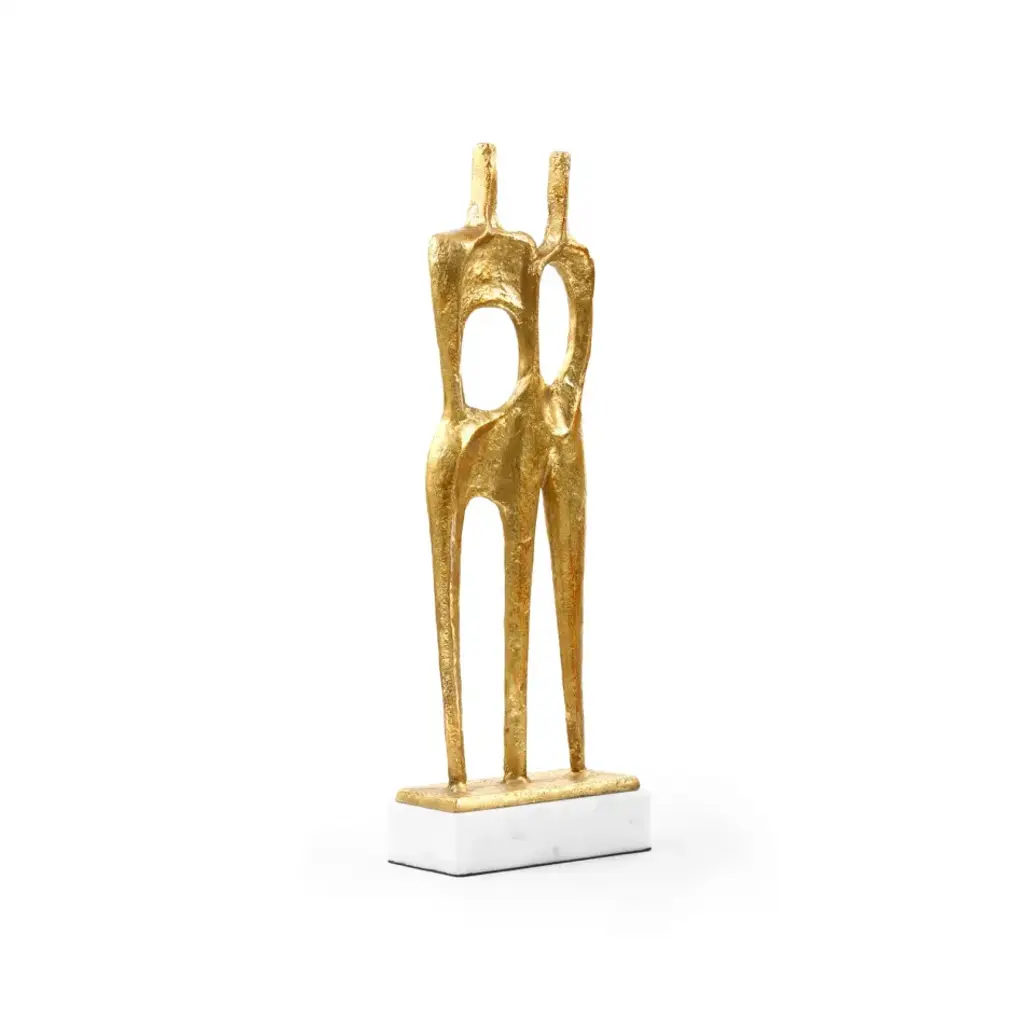 Two souls, one heart. The romantic Union Statue depicts two figures merging into one, giving new meaning to the phrase, “You complete me.” Communicating human emotion with artistic cachet, the petite piece is fashioned in the abstract style of Henry Moore and other post-WWI sculptors who put emphasis on form and sentiment. The singular duo is rendered in iron with a textured gold leaf finish. The slender silhouettes incorporate negative space within their gracefully curved outlines, playing with perspective and articulating a poetic visual language. Stood upon a pedestal of white marble, the Union is a modern masterpiece that makes for a perfect wedding gift or decorative object in your own home or office.