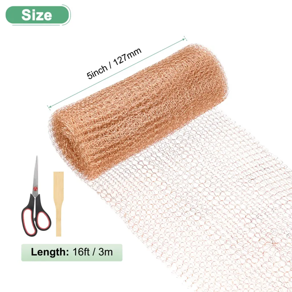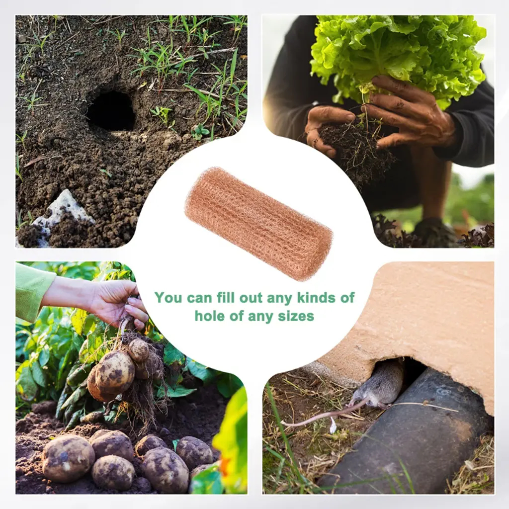 The high-grade copper mesh is flexible and has multiple applications. It can be used for small home projects and large agricultural uses. Specifically, it can serve as a block fabric or mouse hole filler to protect seedlings, vegetables, and fruits from pests. It also functions as a cleaning brush, filter, scrubber, wire sculpture, and for gift-wrapping. Made of copper mesh with ductility and plasticity, can effectively prevent pests from drilling or chewing, and accurately seal openings, holes, and cracks to avoid harm to various areas like plants, gardens, homes, kitchens, pipes, walls, and windows. Has a rust-proof, fire-proof, and waterproof structure, won't rust over time, and is easy to make into pure copper wire guardrail rolls. Offers sufficient lengths and widths to meet different needs, and can be cut with the provided scissors as desired and stuffed into vents, gutters, or small gaps using the wooden stick. This copper mesh screen is precisely cut by a machine and may have pointed edges. It is recommended to wear gloves when disassembling or using it to avoid getting hurt.