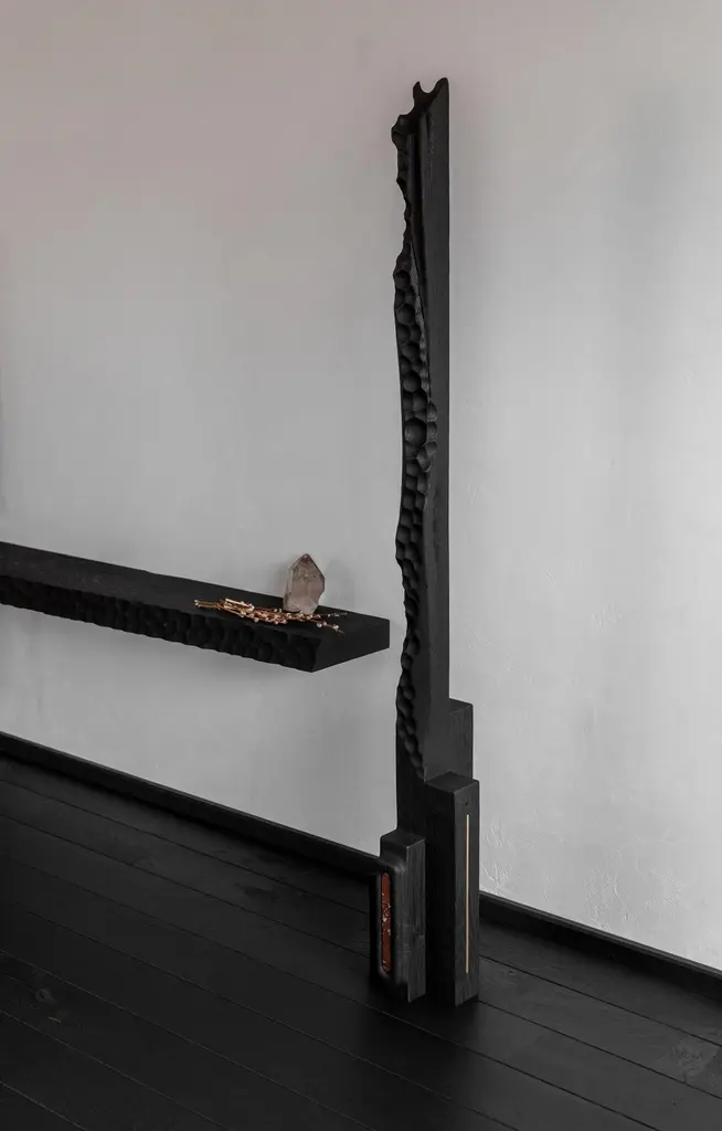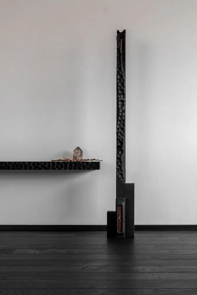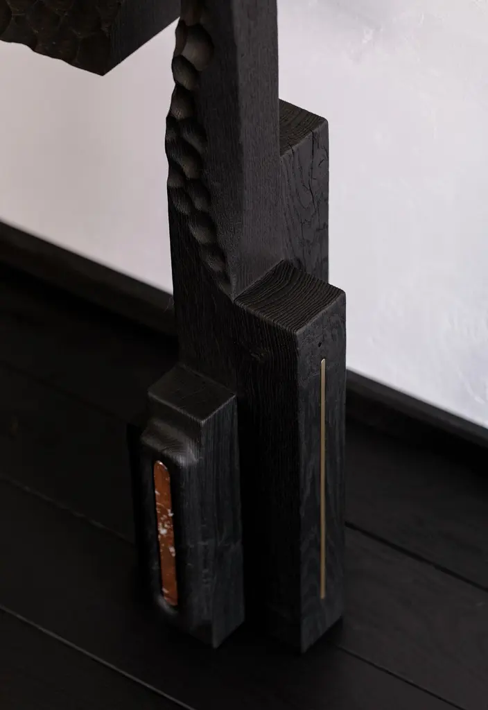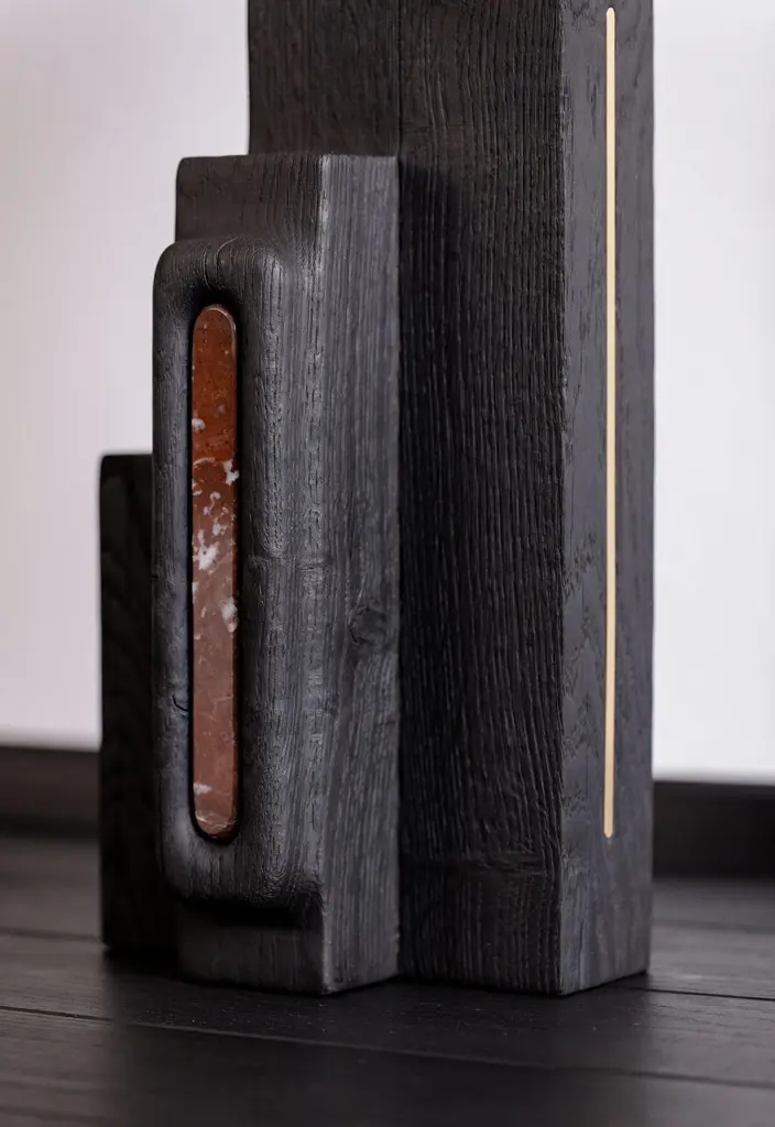 Unique roots 01 sculpture by Jeremy DescampsUnique pieceDimensions: 20 x 20 x 150 cmMaterials: Belgian burned oak, belgian red marble and brassJeremy Descamps Born in Namur, July 7, 1987 Always attracted to manual trades, he went on to study as a lathe miller and made it his profession for more than ten years. It was in 2016 that he used his technical skills and his sensitivity to make his first creations, which will remain in the private sphere. It was the interest that these creations aroused in his entourage that prompted him to take the plunge and embark on the LFN adventure. He therefore embarked on the creation of tailor-made furniture for private and professional alike. This has enabled him to have nice collaborations such as the one with the Hors Champs restaurant. He also creates an annual collection, ORIGIN, made up of a range of home accessories, produced in very small series. Today LFN is evolving.Custom-made creations give way to total and unconstrained creation in the world of fine art furniture. He decides to present his creations made of wood only under the "Shu sugi ban" technique to mark his identity, his DNA, his black country in deep black (= Charleroi)He learns the previous gestures to cut and shape stone, a material he is particularly fond of. Supported by the benevolence of a former stonemason well known in Belgian quarries, it is the energy of the past that resurfaces in his creationsBrass makes its entry, as well as copper.Jeremy is an artist whose main concern is to share, provide emotions, give meaning to objects, sublimate shades of black, textures.He meets people, in particular that of Caroline NOTTE, architect whose presentations are no longer to be made.From this meeting was born a collaboration since she offered to exhibit two creations in his famous house designed by Louis Herman De Koninck.A great introduction to the world of fine art furniture, as well as the various requests from the famous VILLAS magazine to appear in their issues.