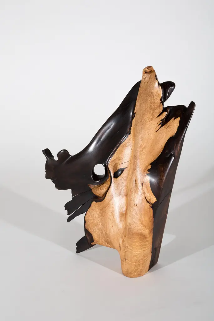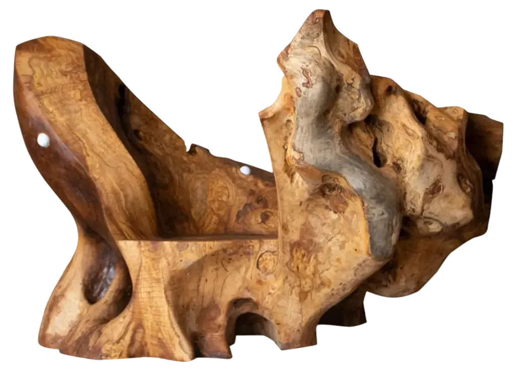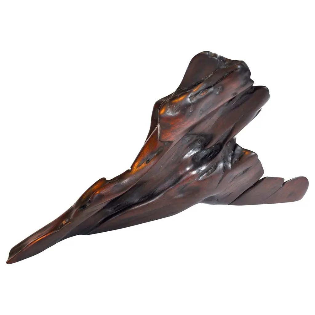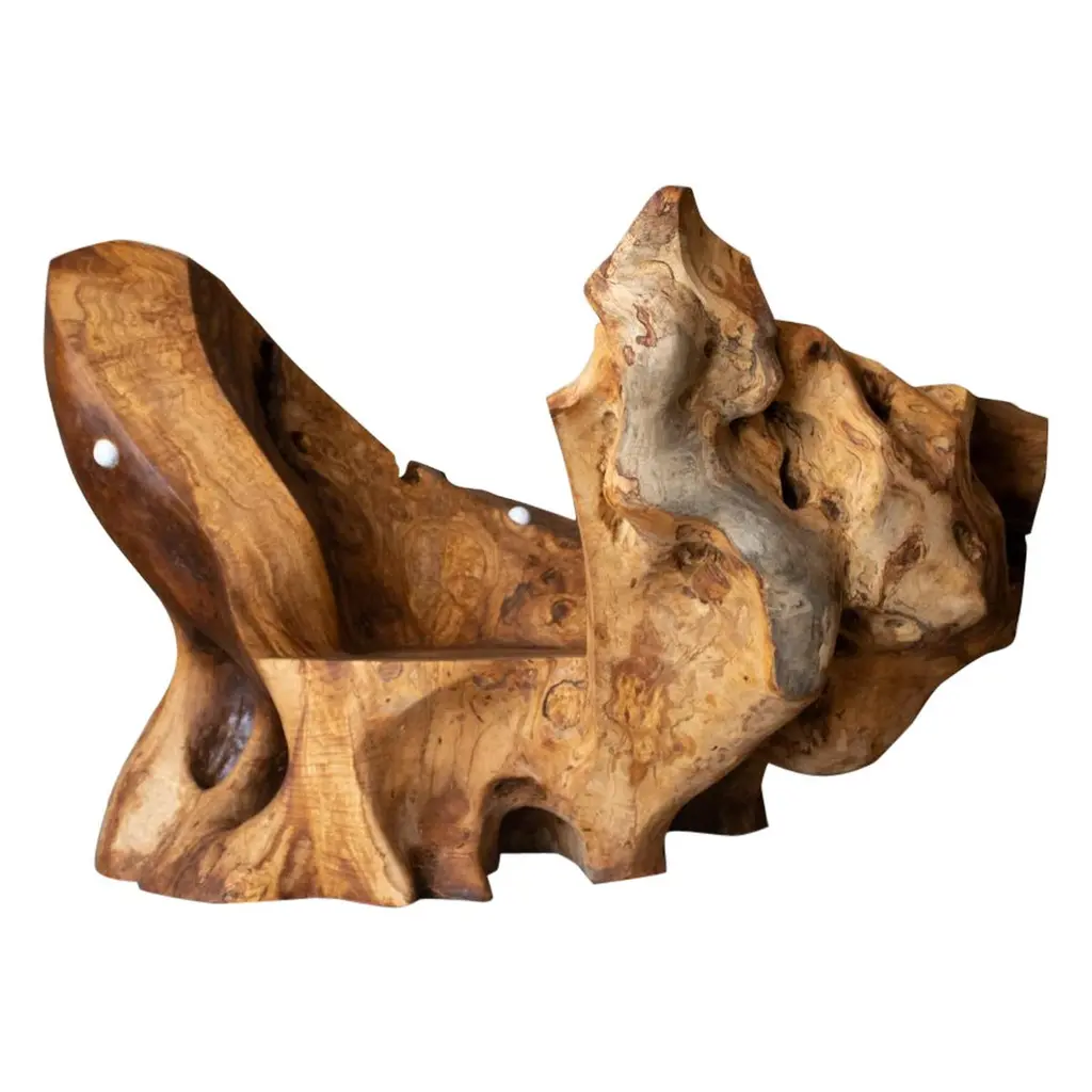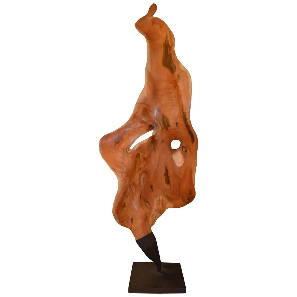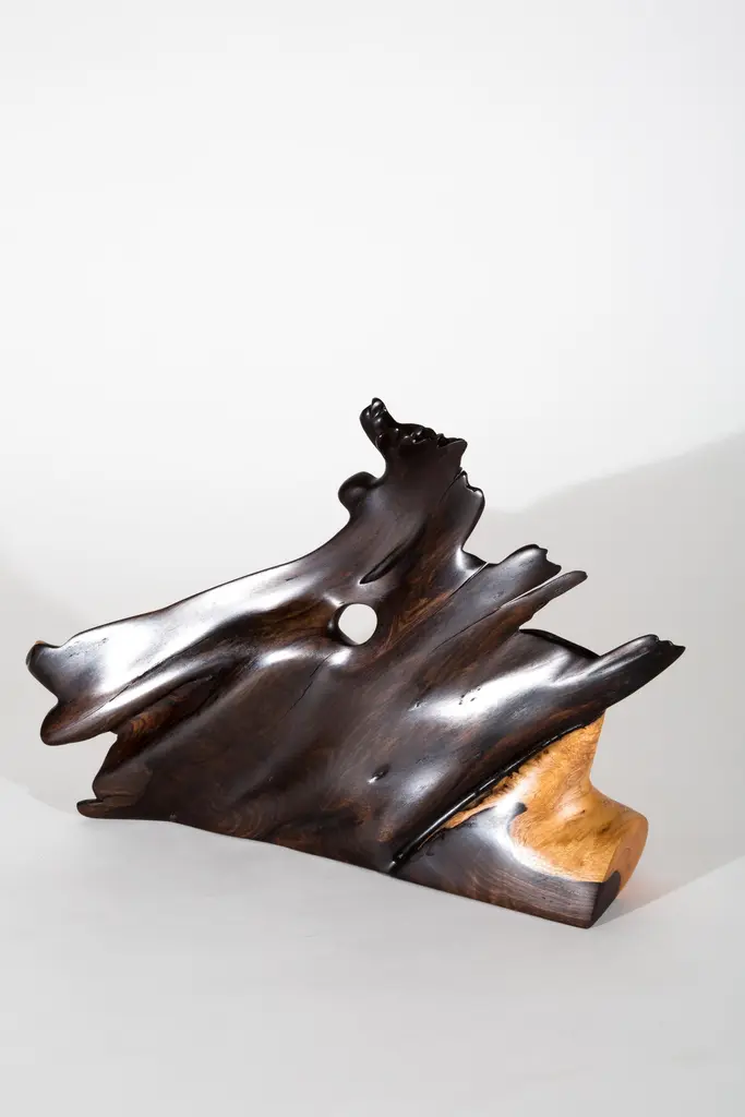 Unique sculpture signed by Jörg PietschmannMaterials: Tropical woodMeasures: H 31 x W 45 x D 9 cm In Pietschmann’s sculptures, trees that for centuries were part of a landscape and founded in primordial forces tell stories inscribed in the memory of their fibres.The forms Jörg Pietschmann pares from ancient trees are extensive and astonish with their physical presence, a combination of elegance and primeval nature. Pietschmann’s sculptures are monuments to the trees from which they derive.Being endowed with the ruggedness of primeval matter gives them a veritable vitality: figures that appear to have grown into their sculptural form of their own accord. But Pietschmann’s tangibly present bodies have undergone a considerable degree of metamorphosis.In order to generate these unique tree specimens he examines the tree’s morphology and intrinsic inner map until the courses of its grain, of a curve, knots and cracks concur with his projections. The exploratory process is accompanied by constant modification, giving at the start of each new piece no more than an intimation of the figure that will later emerge. In their completion, Pietschmann’s sculptures once more become universal form.Jörg Pietschmann`s workshop is situated on the countryside close to Hamburg. He works with indigenous timber as oak, lime tree, beech, poplar, olive tree and maple felled by the wind or human hand, together with tropical timber found on his travels.