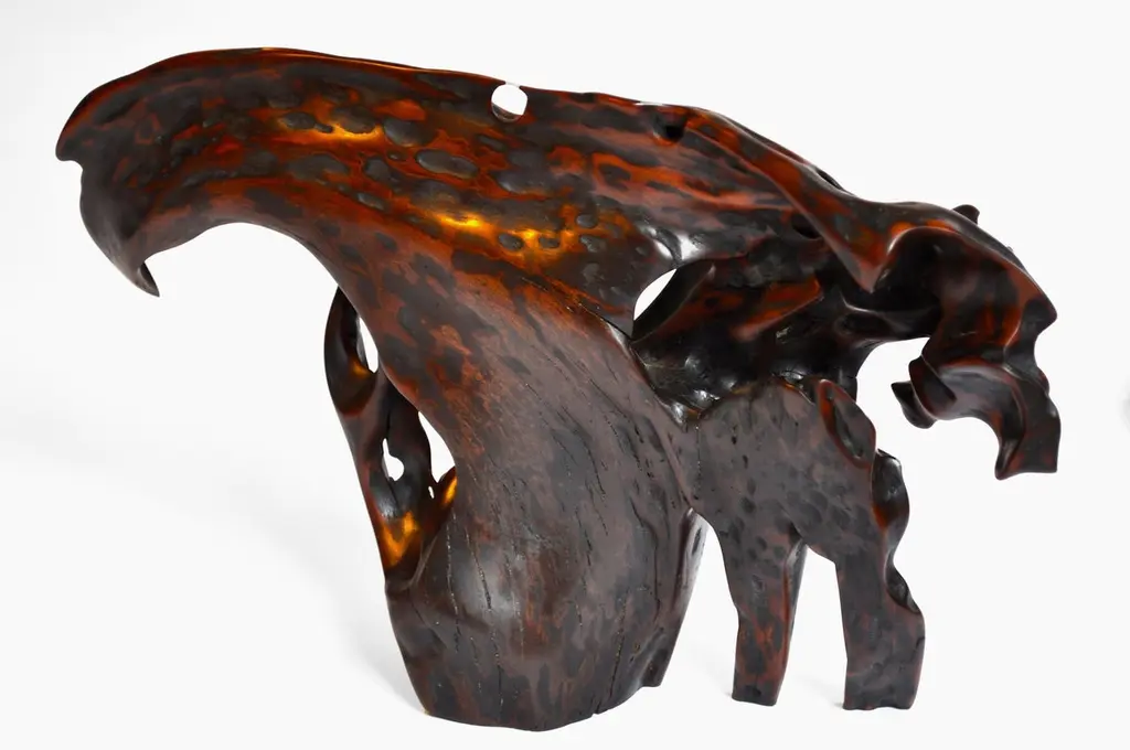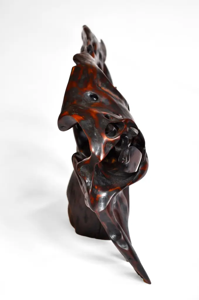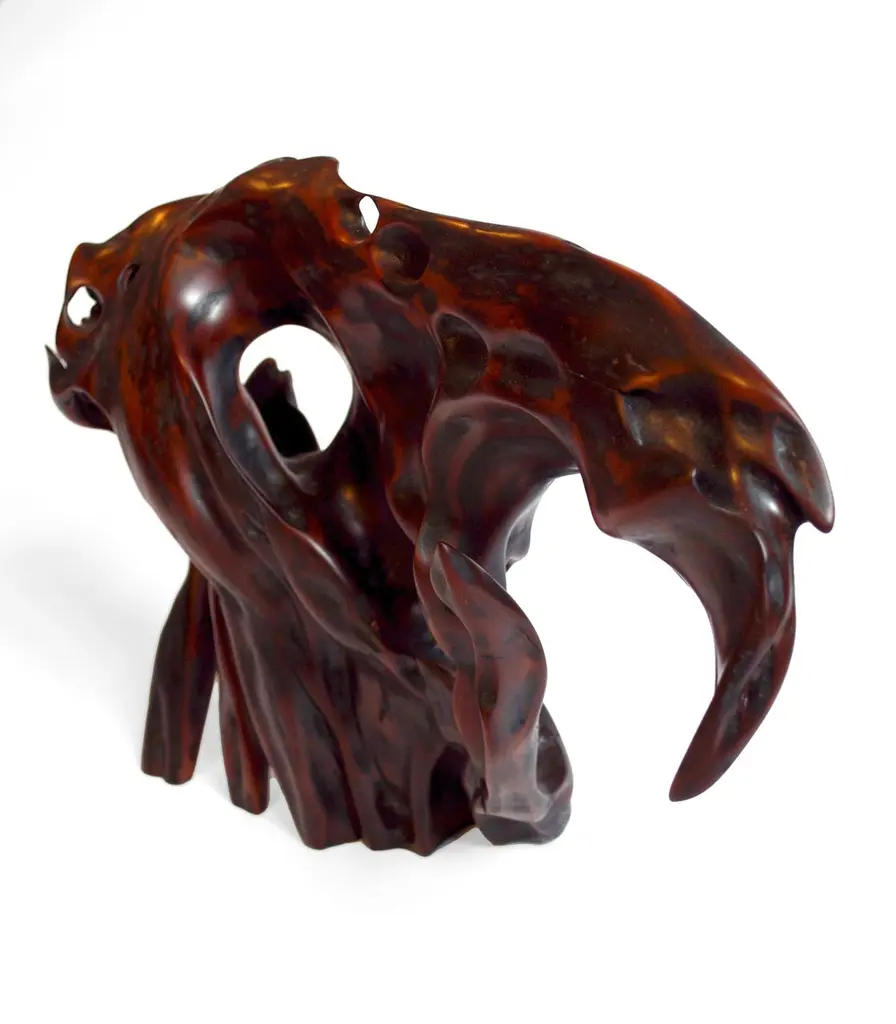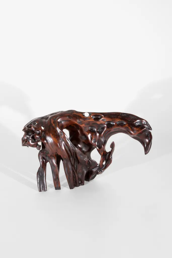 Unique sculpture signed by Jörg PietschmannMaterials: Tropical driftwoodMeasures: H 28 x W 46 x D 11 cmIn Pietschmann’s sculptures, trees that for centuries were part of a landscape and founded in primordial forces tell stories inscribed in the memory of their fibres.The forms Jörg Pietschmann pares from ancient trees are extensive and astonish with their physical presence, a combination of elegance and primeval nature. Pietschmann’s sculptures are monuments to the trees from which they derive.Being endowed with the ruggedness of primeval matter gives them a veritable vitality: figures that appear to have grown into their sculptural form of their own accord. But Pietschmann’s tangibly present bodies have undergone a considerable degree of metamorphosis.In order to generate these unique tree specimens he examines the tree’s morphology and intrinsic inner map until the courses of its grain, of a curve, knots and cracks concur with his projections. The exploratory process is accompanied by constant modification, giving at the start of each new piece no more than an intimation of the figure that will later emerge. In their completion, Pietschmann’s sculptures once more become universal form.Jörg Pietschmann`s workshop is situated on the countryside close to Hamburg. He works with indigenous timber as oak, lime tree, beech, poplar, olive tree and maple felled by the wind or human hand, together with tropical timber found on his travels.