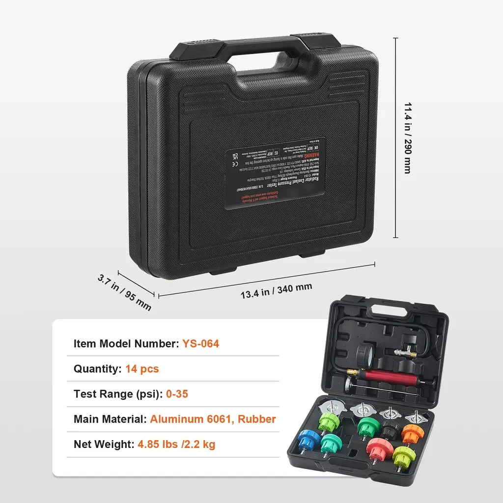 High Compatibility: Our 28-piece radiator coolant pressure tester and refill kit is designed for maximum compatibility, featuring 17 color-coded test caps and 3 test covers. / Our 14-piece radiator coolant pressure tester features a manual pressure pump, a thermometer, 4 metal adapters and 8 color coded testing caps. Identifying the right adapter for your vehicle has never been easier. This coolant pressure tester kit is your go-to solution for a wide range of Japanese, European, and American car models. Robust Hand Pump: Crafted with a robust aluminum pump and reinforced with dual rubber rings in the hose interface, our hand pump ensures exceptional airtightness and extended lifespan. With a testing pressure range of 0-35 psi, it delivers pinpoint accuracy every time. Compact and Organized: The toolbox of our 28pcs / 14pcs radiator pressure tester is compact and portable. The interior features precise slots to keep accessories neatly organized and prevent them from slipping during transport. Say goodbye to cluttered and messy tool storage. Upgraded Filling Valve (for 28pcs option): The pumping components with high-quality metal materials and reinforced the metal joint with double rubber rings. This not only enhances airtightness but also improves suction and vacuuming speed. The upgraded PU hose minimizes the risk of leakage, and we've even added a chain for easy handling. 2-in-1 Convenience (for 28pcs option): Our cooling system pressure tester kit doesn't just detect coolant leaks; it also facilitates quick coolant replacement. This dual functionality saves you time and money, making it the perfect tool for garages, repair shops, and DIY enthusiasts looking to test water tank pressure and fill antifreeze coolant. Color-coded Caps (for 14pcs option): With advanced features such as color-coded caps, the corresponding number is marked on the adapters and the box, identifying the right adapter for your vehicle has never been easier. Steel Cover Adapter (for 14pcs option): All the steel cap adapters are made of aluminum plate and steel, with high strength rubber, wear and corrosion resistance, good quality, long service life. Package Content 1 x Radiator Coolant Pressure Tester and Refill Kit (28 pcs) / 1 x Radiator Coolant Pressure Tester Kit (14 pcs)
