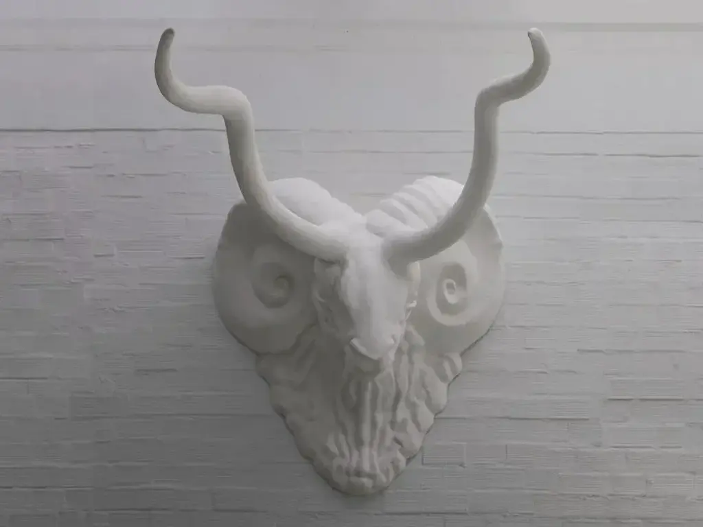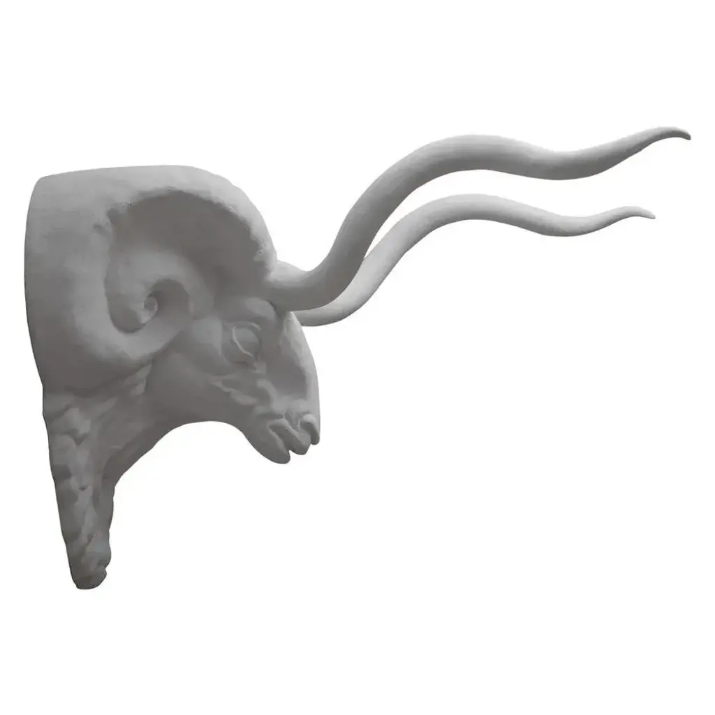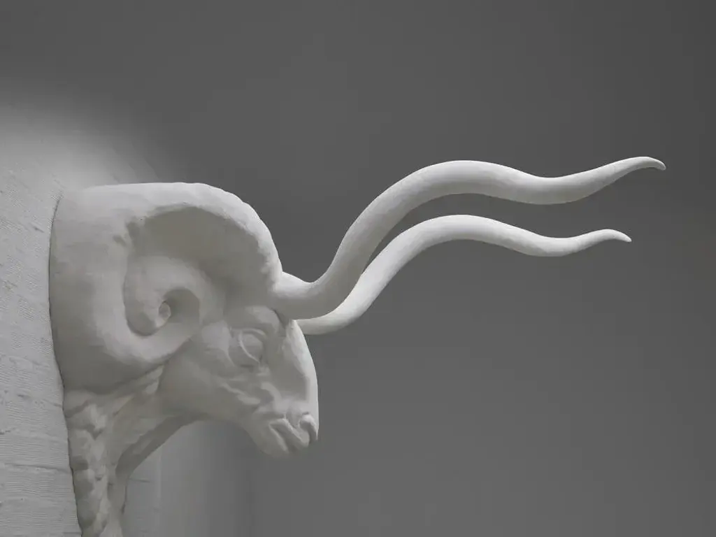 Uno sculpture by Imperfettolab Limited edition Dimensions: 176 x 240 x H 180 Materials: fiberglass A ram, symbol of genesis and rebirth, seems to contemplate the room from its privileged position, attracting all eyes to itself. A sculptural element with a decidedly imposing size and powerful expressiveness, which awakens the wall, communicating strength and personality to the surrounding space. In limited edition, certified and numbered.
