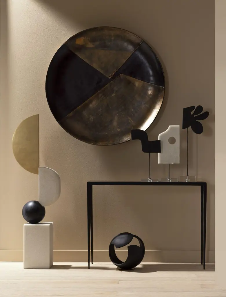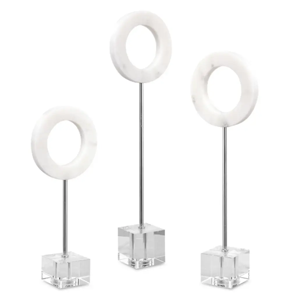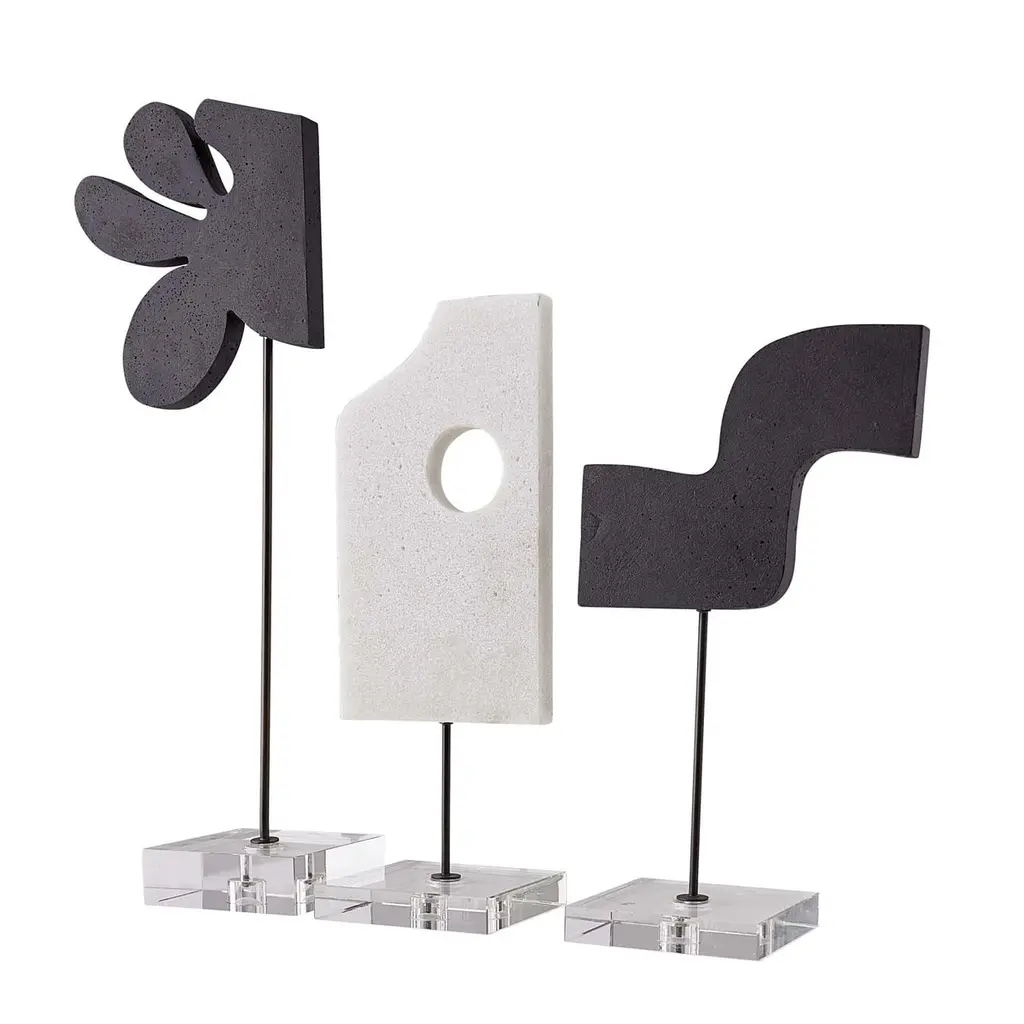 Creatively rooted in the expressive energy of abstract expressionism, this striking trio of Uri sculptures offers a compelling combination of form and contrast. Designed to be displayed together or separately, each sculpture features a distinctive silhouette that evokes movement and emotion. These gestural pieces are meticulously carved from a contrasting mix of charcoal and ivory ricestone composite, creating a bold interplay of tone and texture that captivates the eye.Each sculpture is mounted on a bronzed steel stem and set atop a clear crystal base, lending a refined, gallery-quality presence. Due to the handcrafted nature of the materials, finishes will vary, making each set beautifully unique.This high-quality set is currently on display in our London showroom and now forms part of our discontinued collection. While it may show minimal signs of handling, it remains in excellent condition. Please note that the original packaging is not included.Perfect for those seeking a distinctive, artistic addition to their space, this sculptural trio blends modern sophistication with timeless appeal. As it is no longer available to order, this is a rare opportunity to acquire a unique showpiece. Once it's gone, it’s truly gone.