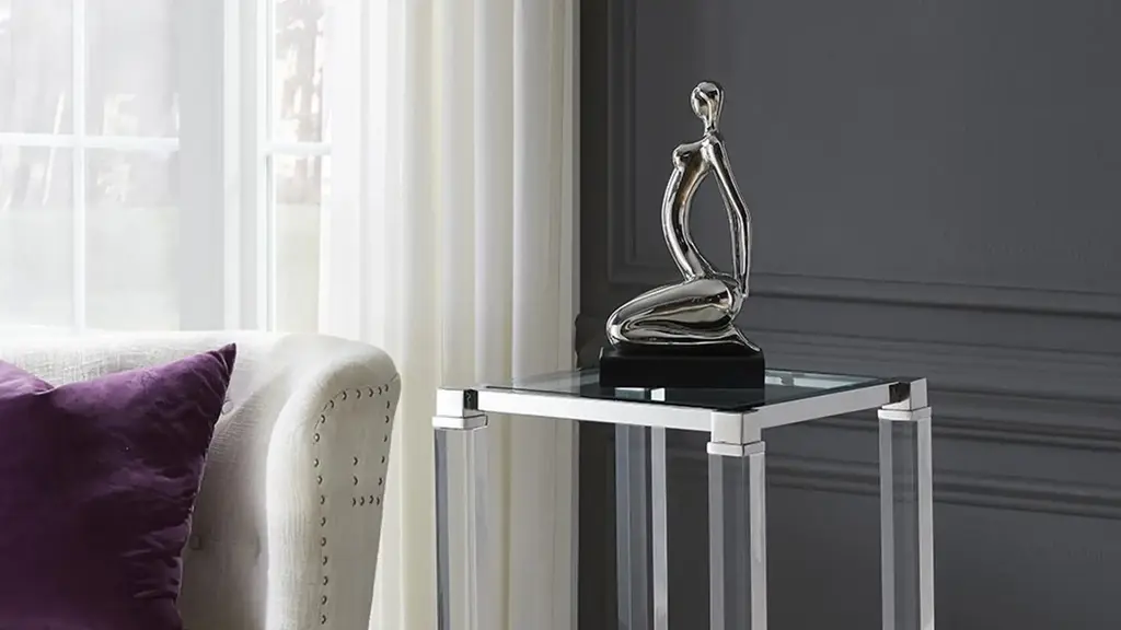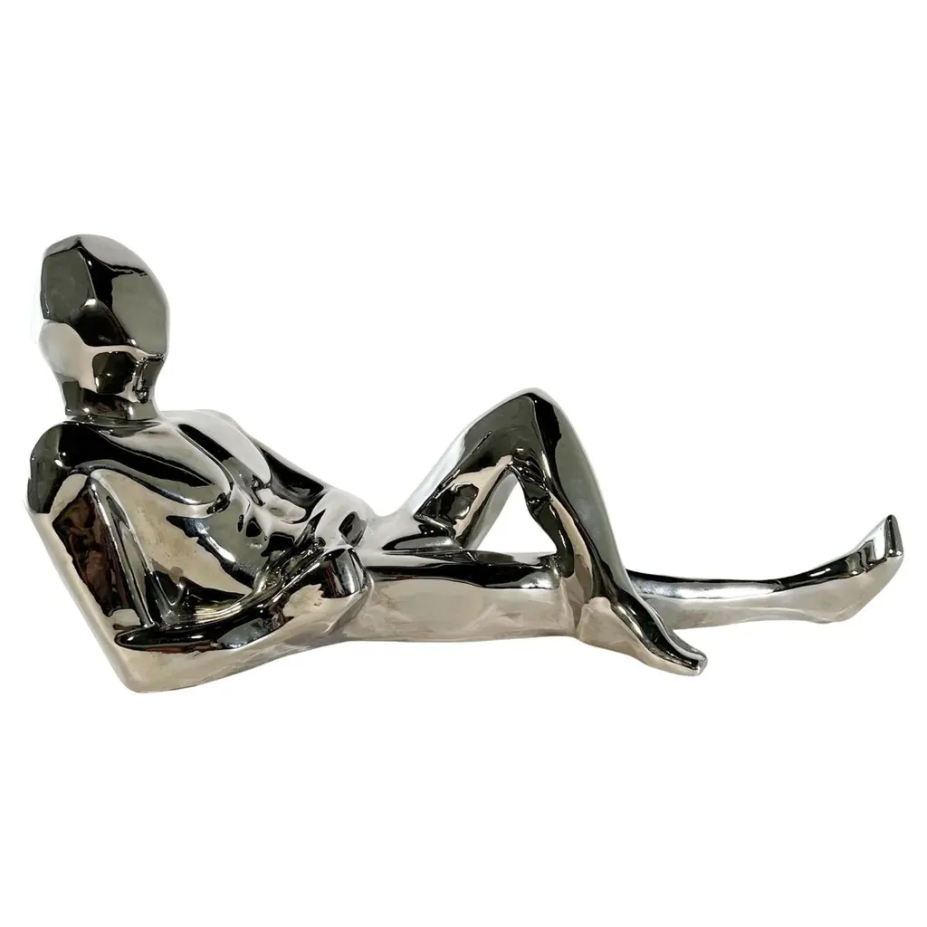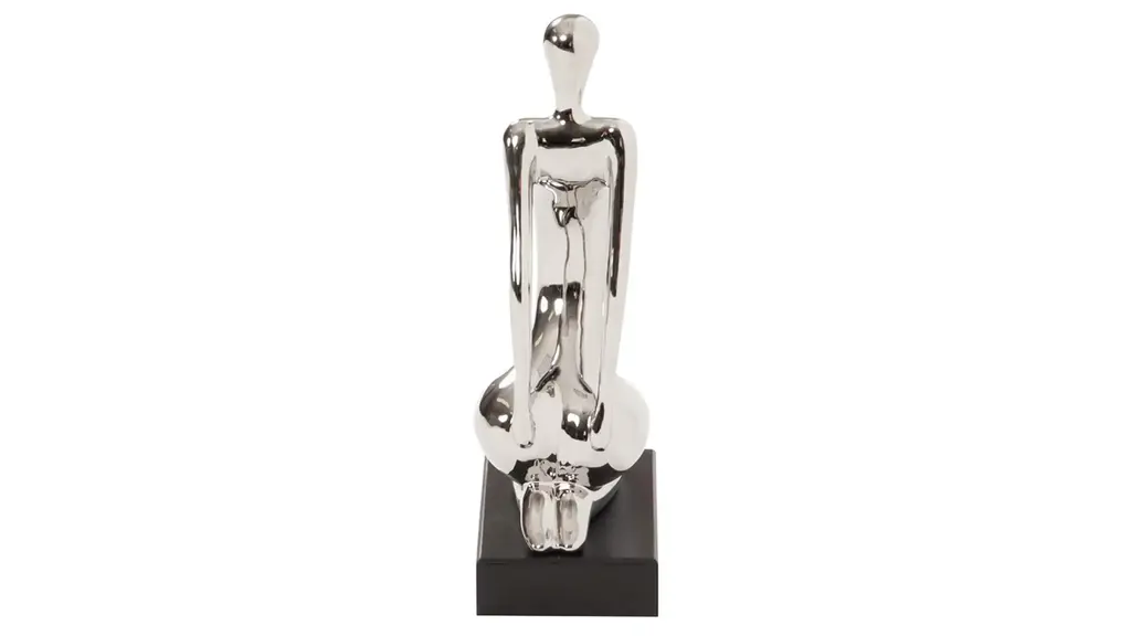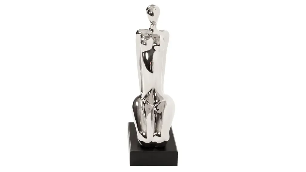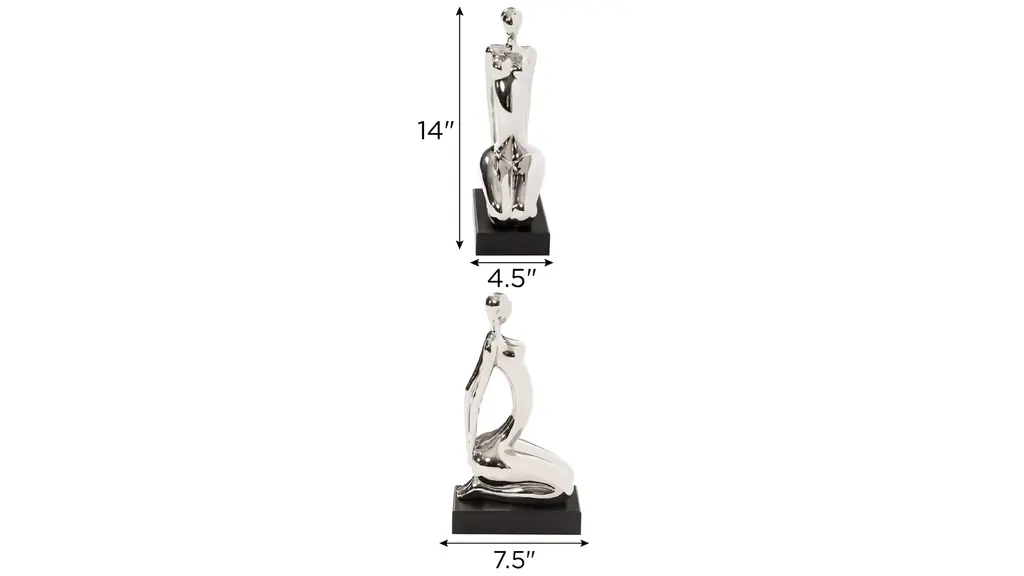 The Ustrasana Posed Yoga Figure features an abstract Yogi in a graceful Ustrasana Variation Yoga pose. She is fashioned from ceramic and finished in an electroplated nickel so metallic it has a mirrored effect. She is set on a black platform. Pair with the Mermaid Posed Sculpture for a complete look. The bottom of the sculpture is padded so as not to damage your surfaces.