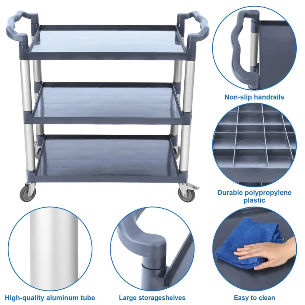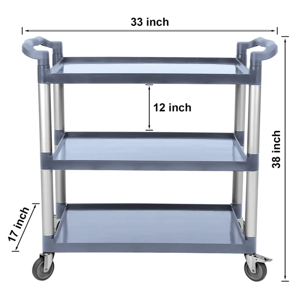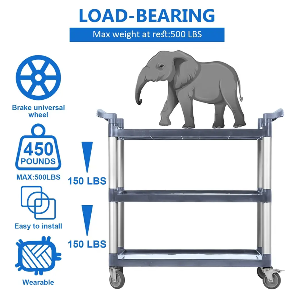 Durable Construction with Rust-Resistant MaterialsThis 3-tier utility cart is crafted from advanced aluminum and high-density plastic, combining strength with lightweight maneuverability. The materials are rust, dent, and chip resistant, ensuring long-lasting durability even with daily use in busy environments. Each side features non-slip handrails, providing a secure grip for easy pushing or pulling, while the sturdy build guarantees reliable performance for years to come.Ample 3-Tier Storage with 450lbs Total CapacityDesigned with three spacious tiers, the cart offers generous storage space for a variety of items. Each shelf supports up to 150lbs, allowing a total load capacity of 450lbs¡ªperfect for storing dishes, tools, books, toys, or supplies. With 12 inches of height between layers, there¡¯s plenty of room for taller items, making organization efficient and accessible whether in a kitchen, garage, or office.Smooth, Quiet Mobility with 4-Inch Rubber WheelsEquipped with four 4-inch super mute rubber wheels, the cart glides effortlessly across any surface¡ªfrom hardwood floors to concrete. The wheels ensure quiet operation, preventing noise disturbances in offices or kitchens, and their soft rubber material protects floors from scratches or scuffs. The swivel design allows for easy maneuvering around corners or tight spaces, enhancing convenience during transport.Quick and Hassle-Free AssemblySetting up the cart is a breeze, thanks to included complete accessories and detailed operating instructions. All necessary parts and tools are provided, allowing for straightforward assembly that can be completed in just minutes. No advanced technical skills are required, so you can start using the cart right away to organize and transport items.Versatile Design for Multiple EnvironmentsThis heavy-duty rolling cart is designed to fit seamlessly into various settings, including restaurants, garages, offices, warehouses, factories, and kitchens. Its compact size ensures it doesn¡¯t take up excess space, while its robust build and ample storage make it suitable for both personal and commercial use. Whether organizing kitchen supplies, transporting tools, or storing office materials, it adapts effortlessly to meet diverse needs.