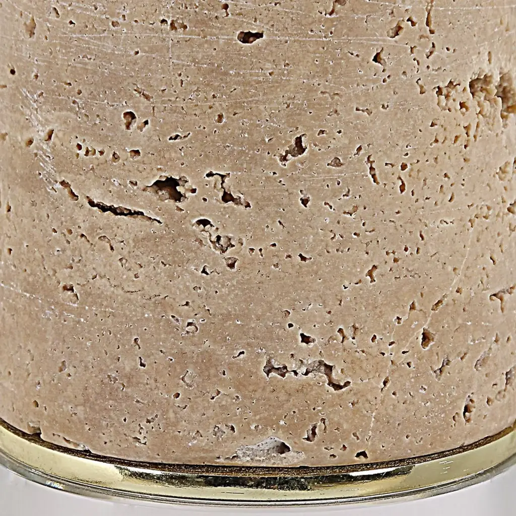 Bring refined architectural beauty to your interior with the Stoney Point Sculptures, Set of 2. These vertically poised forms are crafted from natural beige unfilled travertine, offering a warm, textural presence. Elevated atop thick clear crystal bases and bisected by a sleek steel disc in light antique brass, each piece balances organic material with industrial precision. Key Features: Set of two sculptural accents in graduated heights for visual depth. Beige unfilled travertine bodies exude organic elegance. Clear crystal bases provide elevated clarity and stability. Antique brass steel discs add sleek architectural contrast. Dimensions: Large – 3" W x 20" H x 3" D, Small – 3" W x 16" H x 3" D