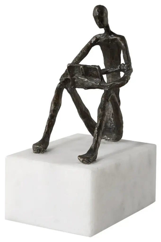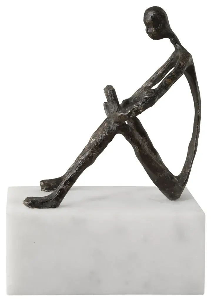 This Sculpture Captures The Essence Of Tranquility As It Depicts A Figure In A Relaxed Seated Position, Engrossed In The Simple Pleasure Of Reading. The Cast Iron Figure Is Finished In Dark Brown, Enriched With Bronze Highlights, And Sits Atop A White Marble Base. This Visually Stunning Piece Effortlessly Complements Any Space.