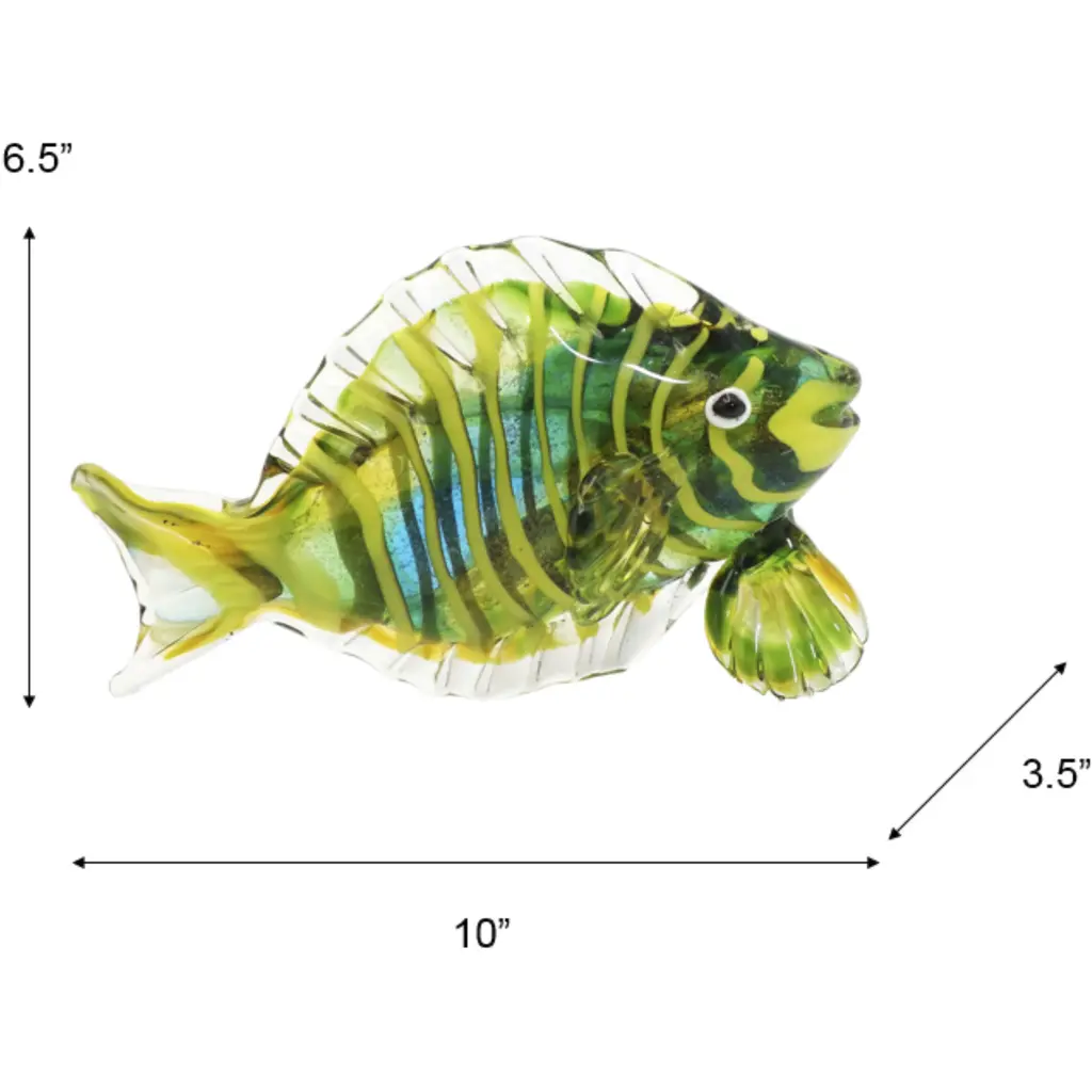 Our Varadero Fish Handcrafted Art Glass Figurine Is a delightful addition to the decor in your home or office. The whimsical fish features a clear glass body that is infused with a light green base, and highlighted with dark green freeform striping and splashes of yellow and blue throughout. His expressive eyes feature bold block pupils, giving the figurine its very realistic look. His meticulously textured fins are clear with infusions of matching grain and yellow. They also serve as the figurines base. A true conversation starter in any room, our Varadero fish handcrafted art glass figurine is an excellent gift for any occasion whose recipient will proudly display for many years.
