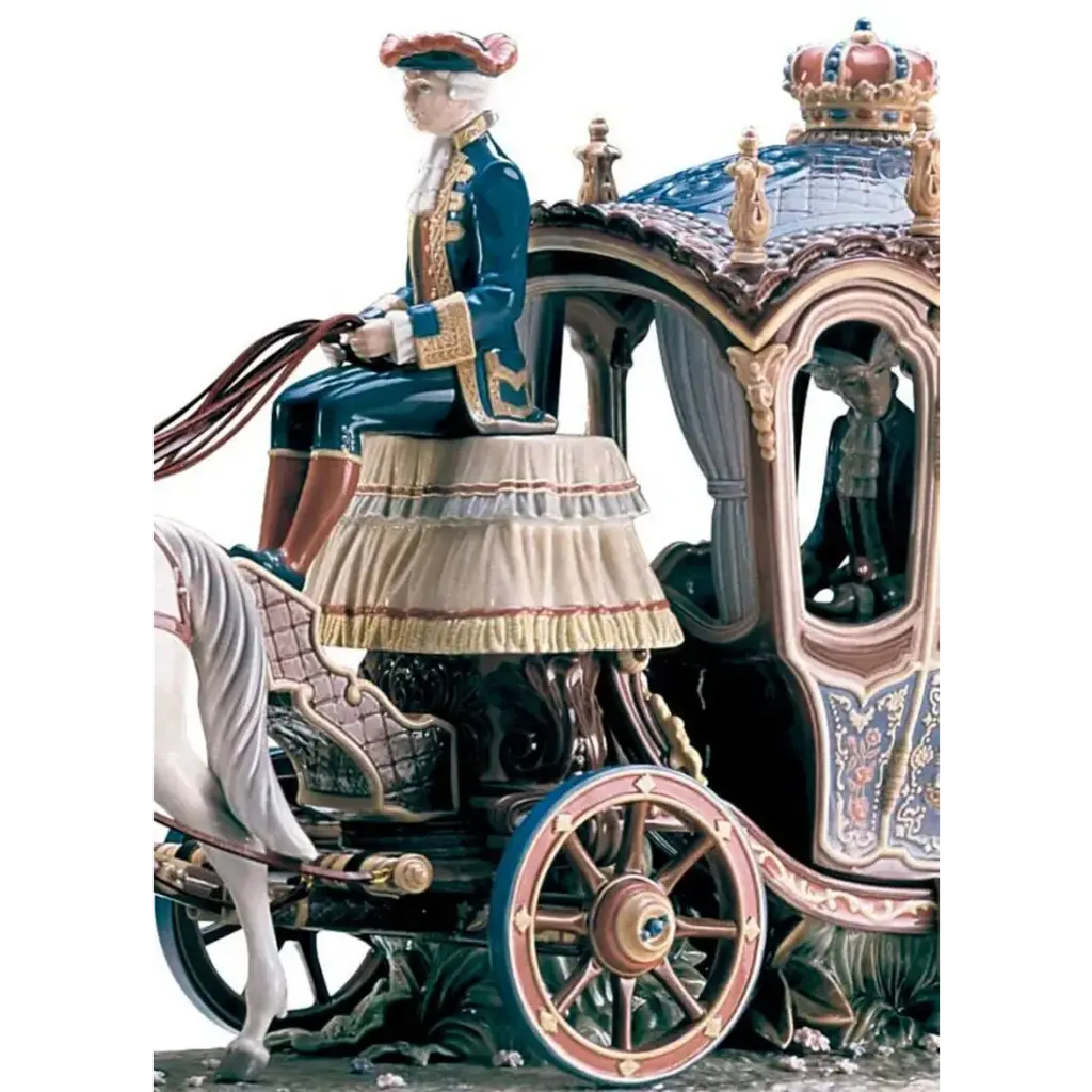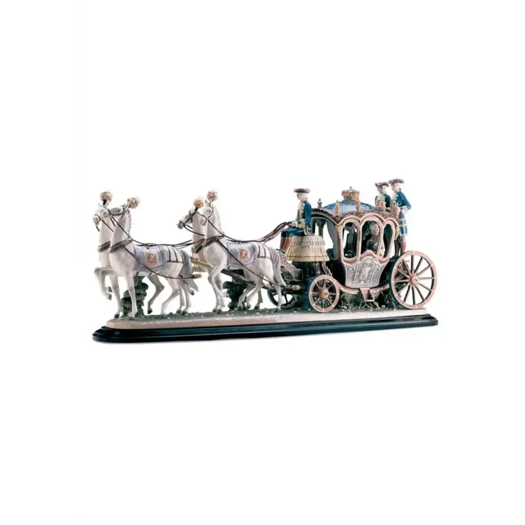 Limited edition gloss finish porcelain sculpture of a XVIII century carriage drawn by four white horses. An iconic Spanish brand, Lladro is a world leader in the creation of porcelain art. Started by brothers Juan, Jose and Vicente Lladro in 1953, the ceramic figurines were initially inspired by the works of great European manufacturers like Meissen and Sevres. Over time, a unique style was forged, consisting of elongated lines, a revolutionary single-firing method, and soft pastel tones.