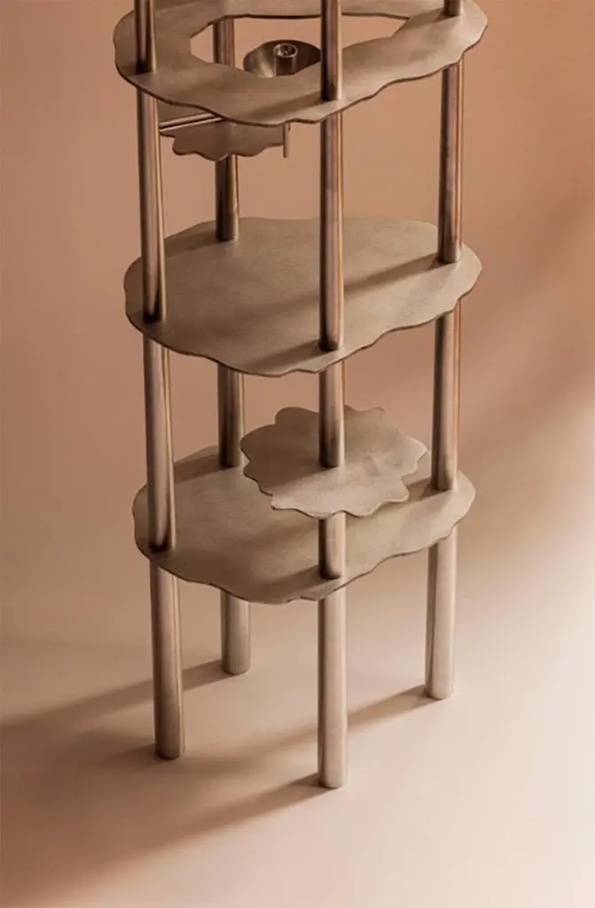 Velora is the name of a functional aluminum sculpture that explores the tension between lightness and solidity, between the domestic and the cosmic. Like an elegant ruin from a future that never arrived, the piece is anchored in the retrofuturistic nostalgia of the 1970s—evoking floating forms, ritual columns, and a materiality that veils the everyday with a renewed sense of reverence.