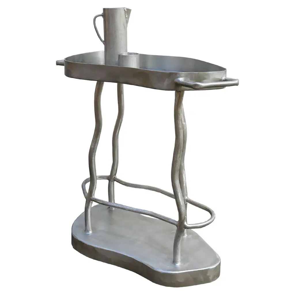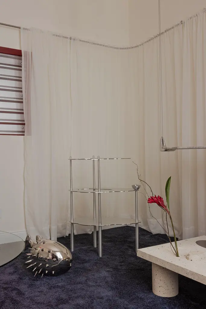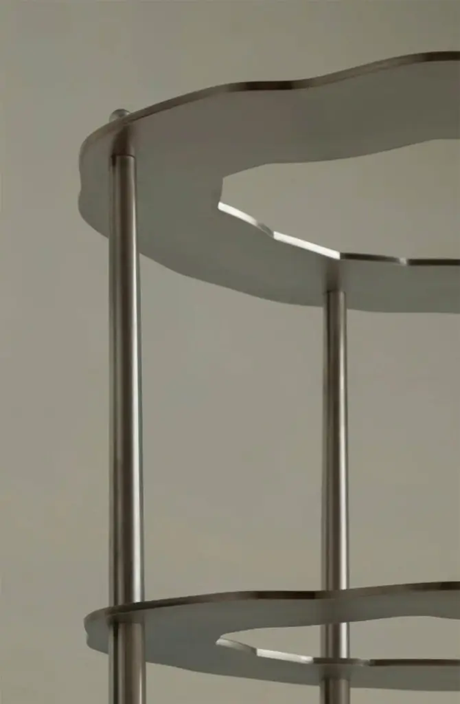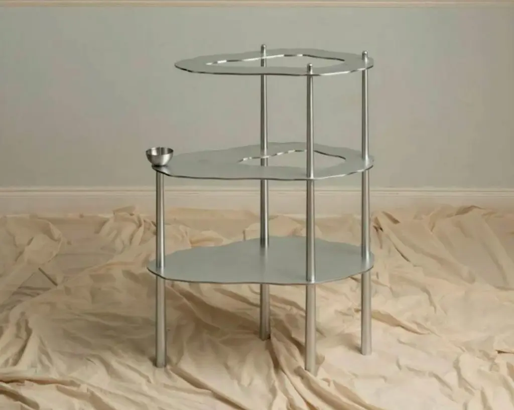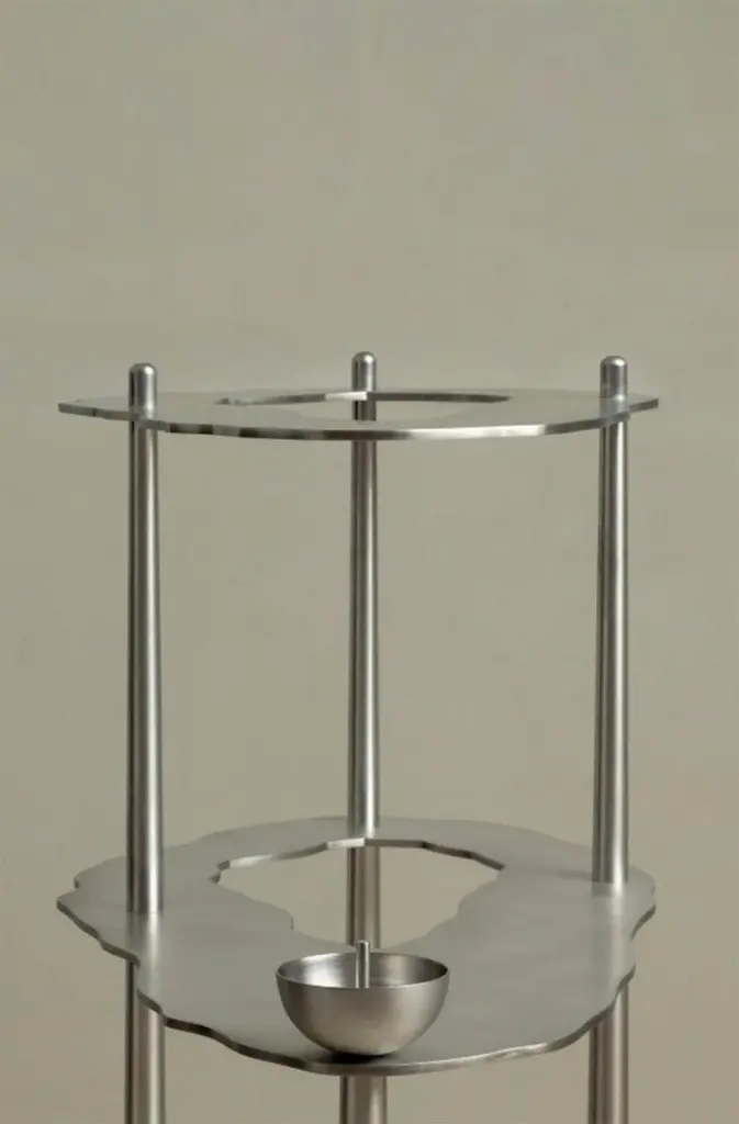 Velora is the name of a functional aluminum sculpture that explores the tension between lightness and solidity, between the domestic and the cosmic. Like an elegant ruin from a future that never arrived, the piece is anchored in the retrofuturistic nostalgia of the 1970s—evoking floating forms, ritual columns, and a materiality that veils the everyday with a renewed sense of reverence.