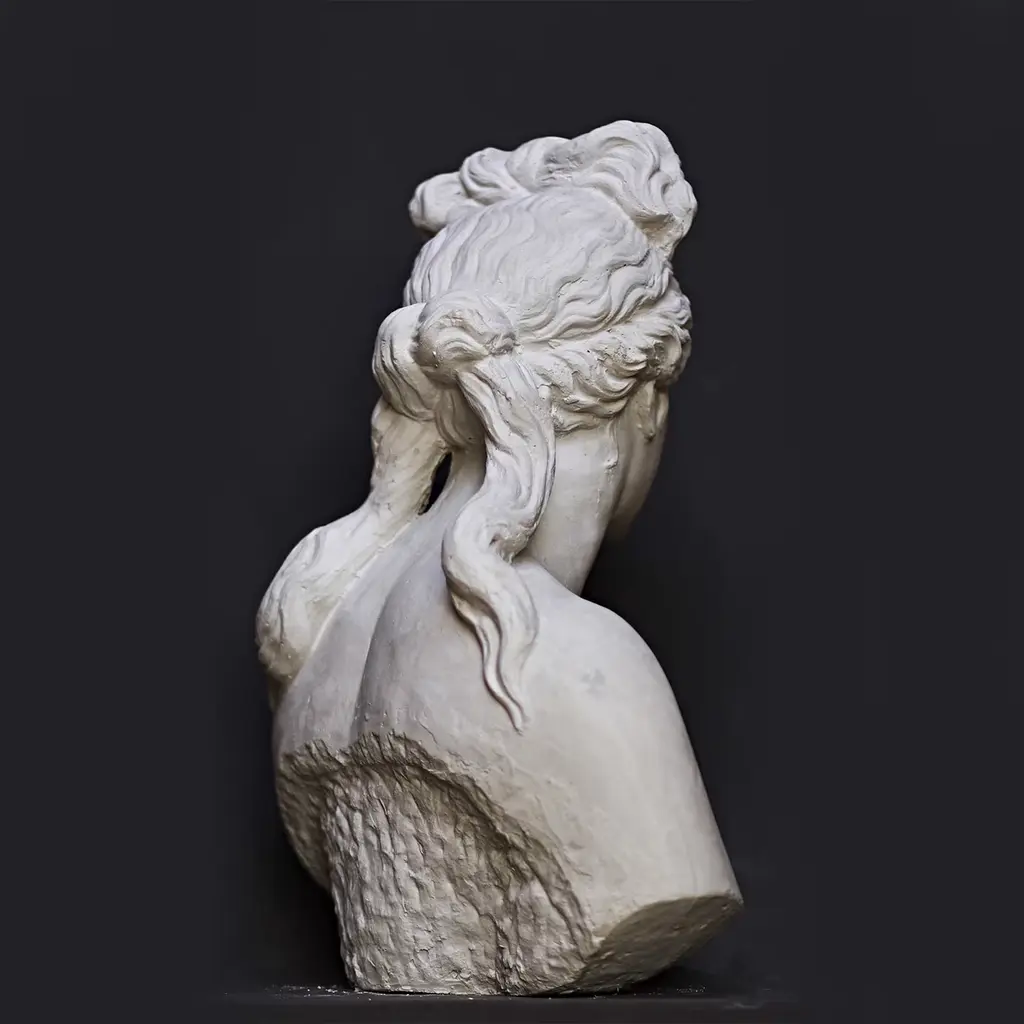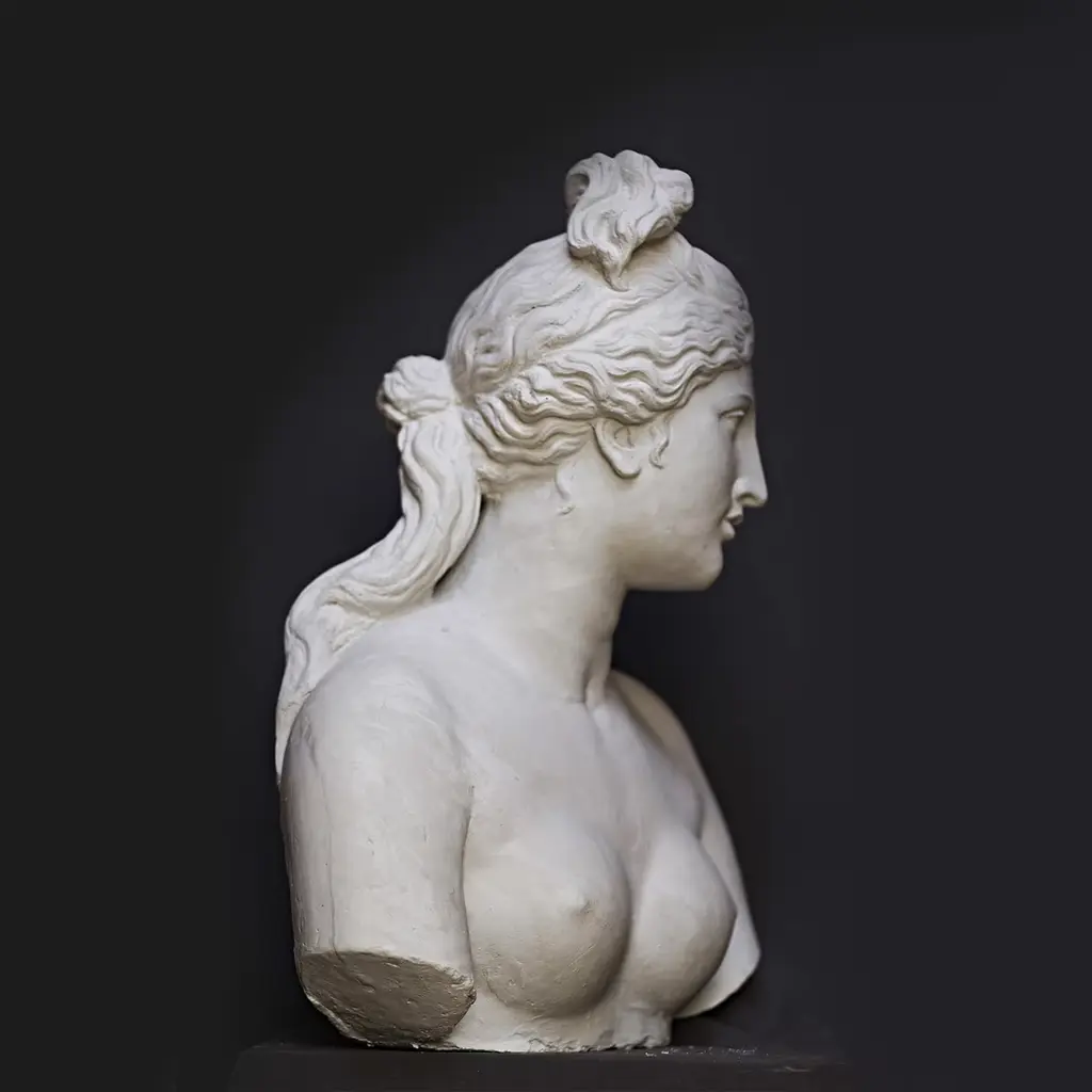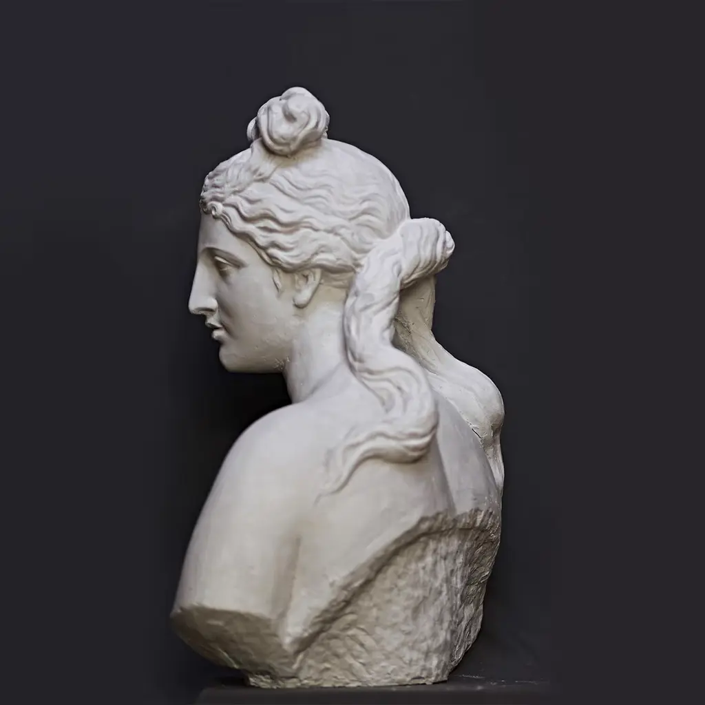 A detail from the renowned marble masterpiece Venere Capitolina dating back to the 2nd century B.C.E. currently housed in the Musei Capitolini in Rome, this bust is a faithful reproduction of unbelievable charm. Goddess Venus is depicted with her hair tied in an intricate hairstyle rich in braids with locks falling on her head and neck. It is a singular piece entirely crafted by hand in Florence.