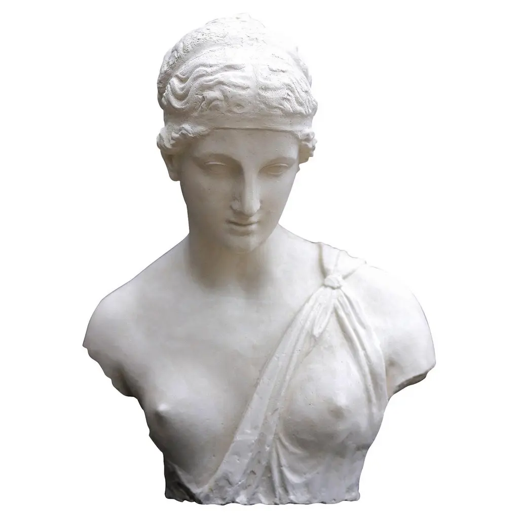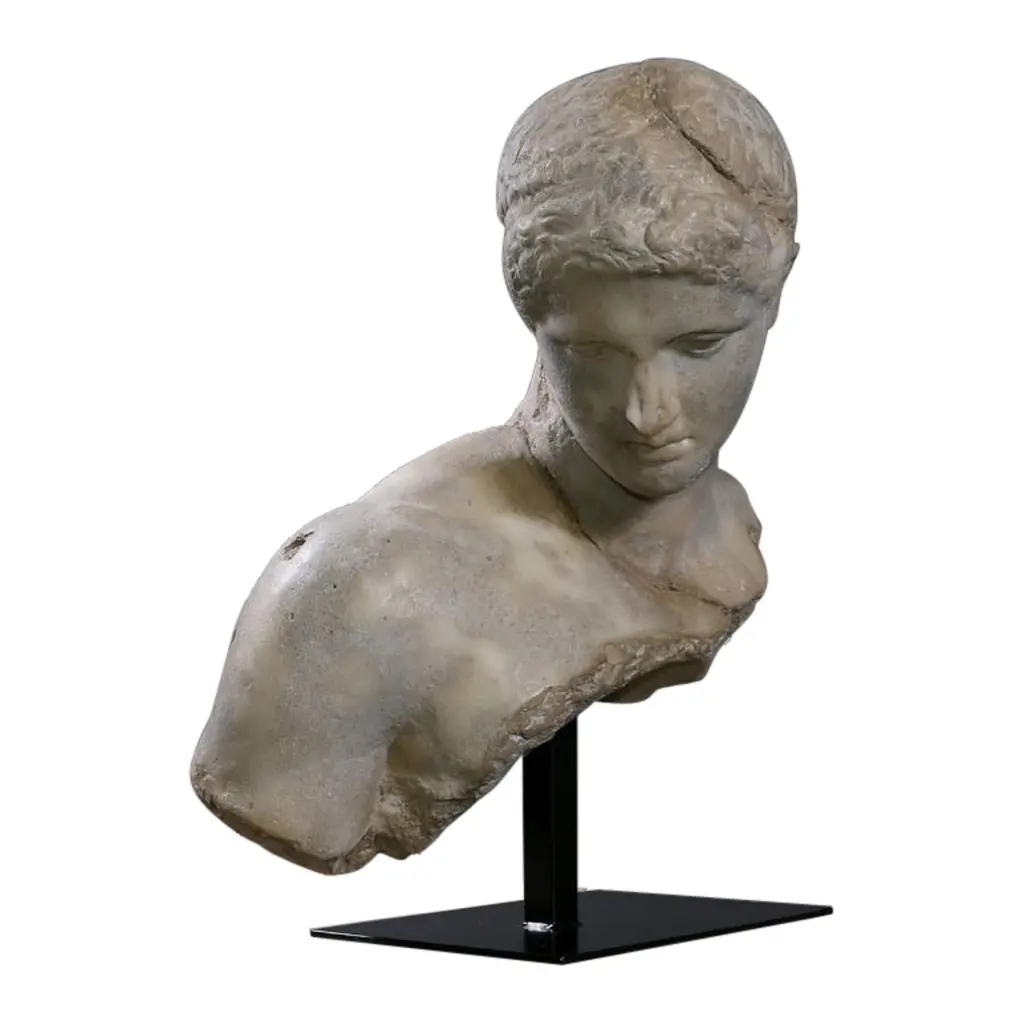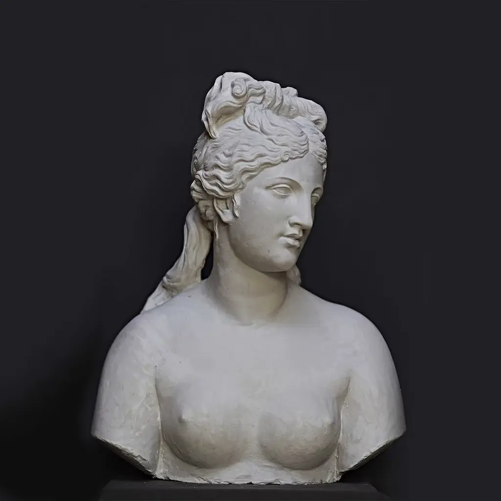 A detail from the renowned marble masterpiece Venere Capitolina dating back to the 2nd century B.C.E. currently housed in the Musei Capitolini in Rome, this bust is a faithful reproduction of unbelievable charm. Goddess Venus is depicted with her hair tied in an intricate hairstyle rich in braids with locks falling on her head and neck. It is a singular piece entirely crafted by hand in Florence.