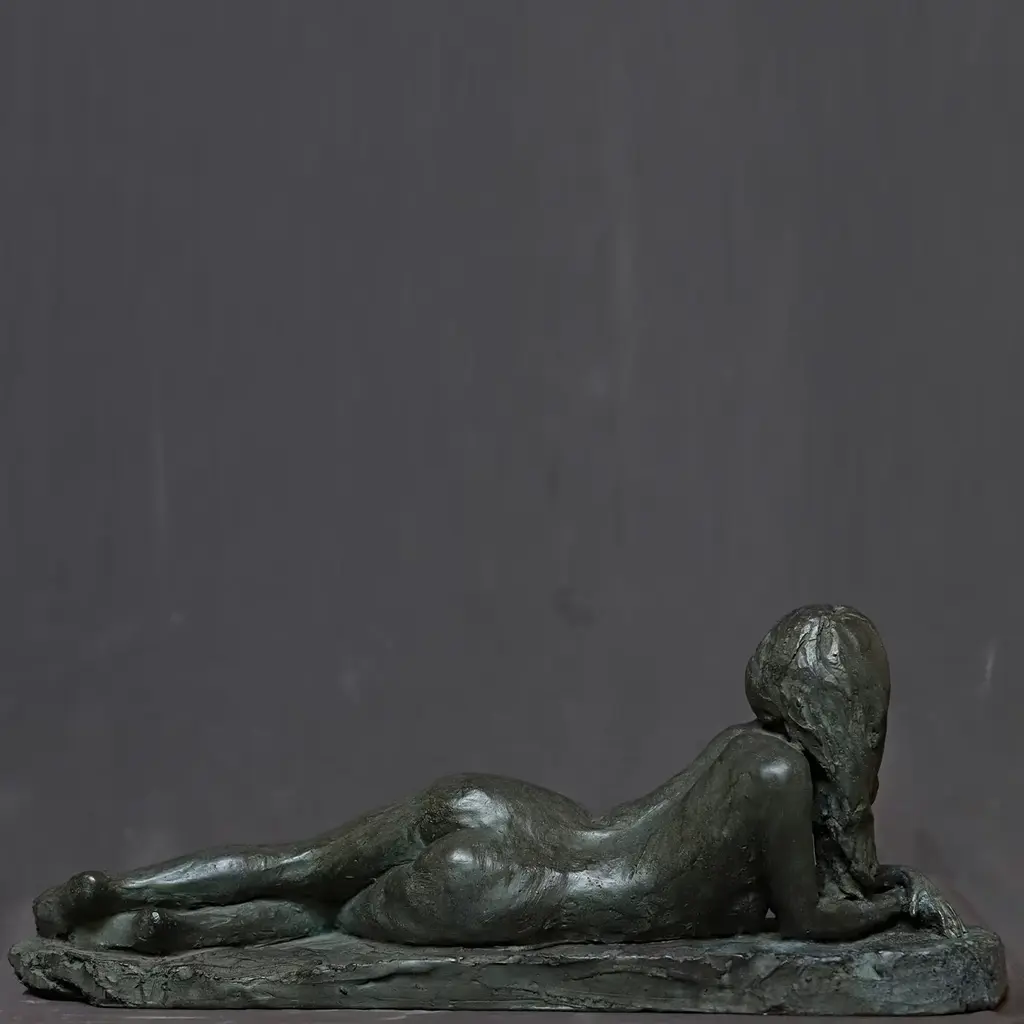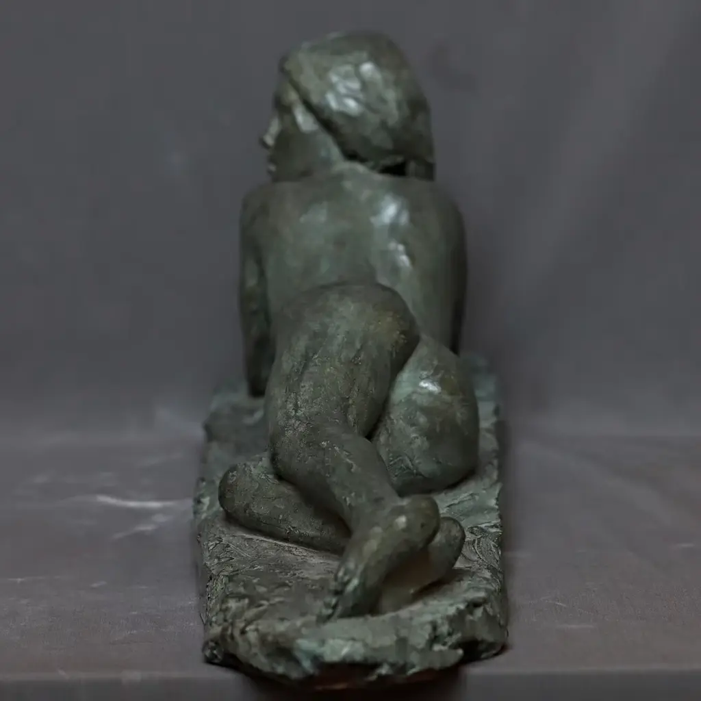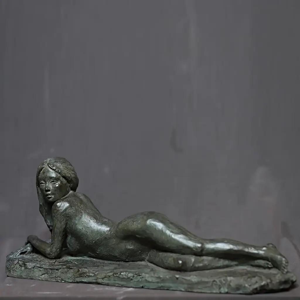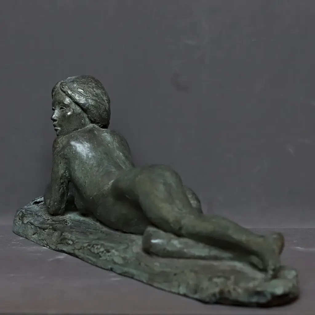 A life masterpiece fashioned of bronze and molded by the hands of sculptor Raffaello Romanelli, this sculpture depicts a nude woman laying on her side with her arms delicately crossed across her bosom. The sinuosity of her body and any other detail, including her fleshly lips, is masterfully rendered thanks to the lost-wax casting technique. Each piece is numbered and signed by the artist.