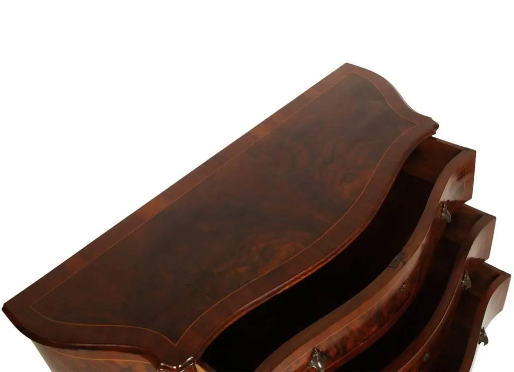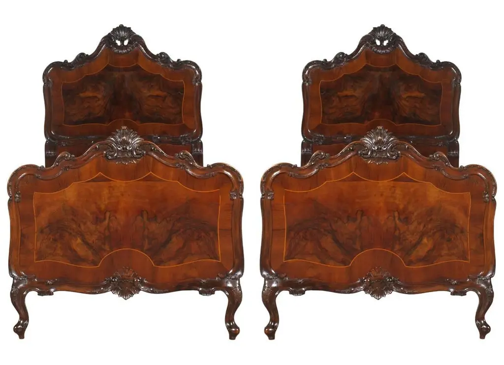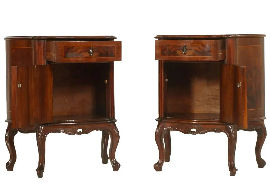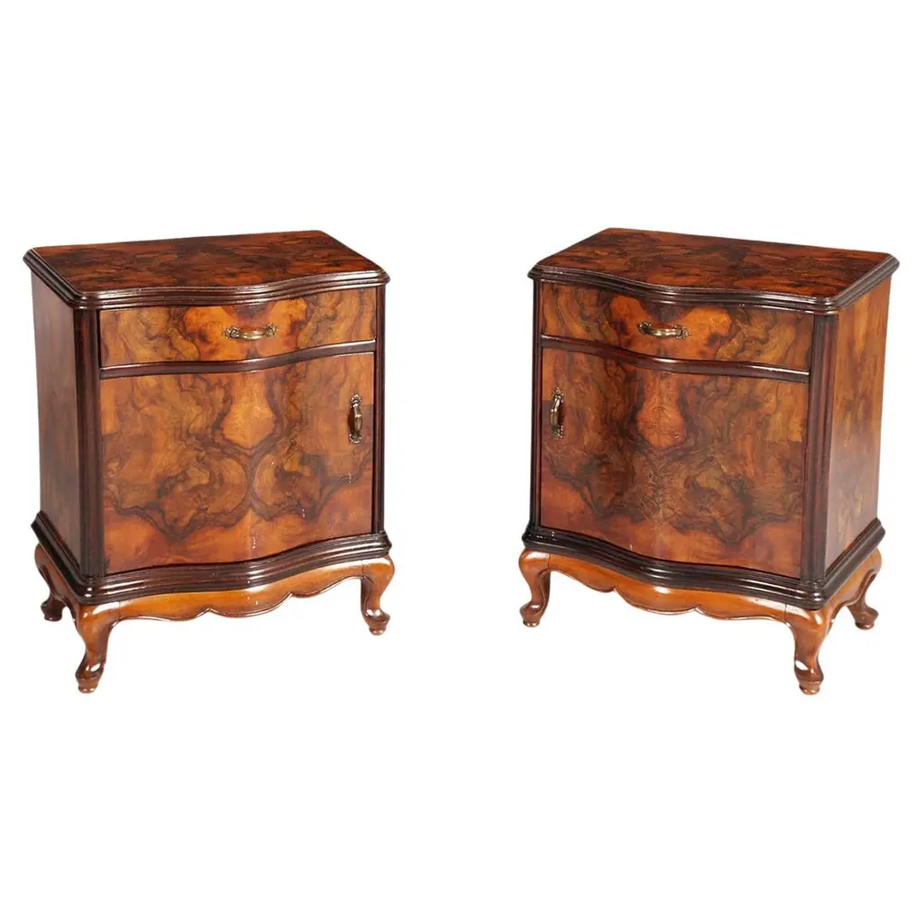 Early 20th century Venetian baroque pair of spectacular and refined nightsatnds, in hand-carved walnut and burl walnut fillet inlay , period 1930s, by Testolini & Salviati Jesorum; polished with wax.Measure in cm H 76 W 55 D 36.ABOUT TESTOLINI BROTHERS-TESTOLINI FRERESFratelli Testolini saw its birth as a carpentry-cabinetmaking company; its owners were not ordinary personalities and immediately began to introduce new fashions in furnishings. The period chosen was not among the most propitious - shortly thereafter there would be the uprisings of 1848 and the famous revolt of Manin and the Republic of San Marco -, but the Testolini were not discouraged and serenely continued their production, seizing immediately the fresh artistic eclecticism that invaded the world from the mid-19th century, starting to conceive and produce original and imaginative models.Venice increasingly became a destination for rich international tourism and the Testolini Brothers began to diversify and expand their production, covering all branches of applied arts. Towards the end of the century their production was very varied: furniture, furnishing accessories, porcelain, textiles, lace, wrought iron, sculptures in both marble and wood, mosaics, micromosaics, glass, embossed metal objects and photographic material.About Testolini-SalviatiFrom OADI, observatory for the decorative arts in Italy. N. 14 December 2016The Testolini Brothers saw their birth in Venice in 1847. The company grew and became strong their position in the market in a period of enormous cultural and productive ferment for the lagoon capital Venice.The reputation of the company grew thanks to the partnership established with the company since the dawn Antonio Salviati, founded in London in 1866 by Antonio Salviati, the diplomat Sir Austen Henry Layard and the historian William Drake8. This bond was further strengthened in 1896, when for a period of economic stagnation the Salviati, the Testolini, the Jesurum and other smaller companies operating in Venice, decided to merge under the name of Salviati & Co. Jesurum Important to note is that, although formally Testolini the Brothers see disappear from the header your name, the latter from that year is still reported in all commercial guides just below the principal name, with the specification of their production of artistic furniture, given that further shows how the company and its activities were important.As we have said before, the Testolini creations were also spread globally and such furnishings have a certain success among the most visible audience: a flashy example is the pair of chairs of our interest once present, along with Other furnishings of Testolini, in the castle of Moulbaox in Belgium, owned by the important family of Counts of Ursel and although purchased when the Brother Testolini had ceased their activity, they had to have a huge resonance of the pair of armchairs chosen by Marilin Monroe for his Home of Los Angeles and immortalized with her by Allan Grant in July 1962, to accompany the article centred on her by Richard Meryman13.
