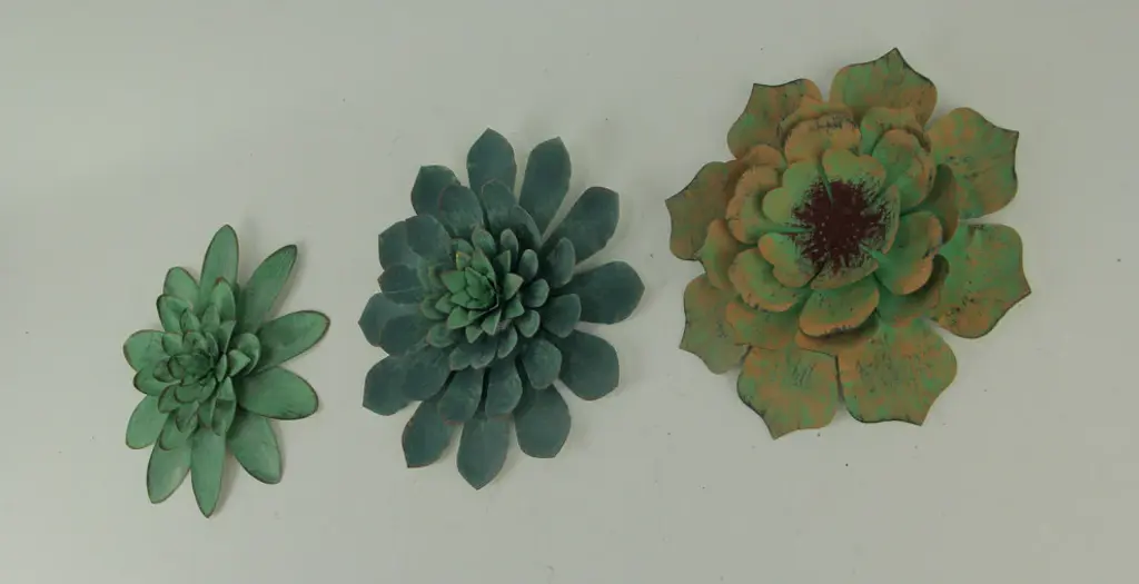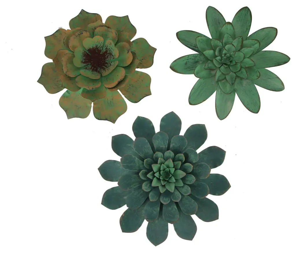 LG: 9.5 inch Diameter, 1.5 inch Deep / MD: 9 inch Diameter, 1.5 inch Deep / SM: 8.5 inch Diameter, 1.5 inch DeepBeautifully Sculpted of Metal in a Design Reminiscent of Large Scale Tropical Blooms with a Keyhole Mounting Hanger On the BackBeautiful Green, Blue and Rust Patina Finish Gives it a Delicate and Eye-Catching Vintage LookUse as Part of a Table Centerpiece or Create Your Own Cluster On the Wall and Create a Visually Stunning Focal PointAdds a Simply Elegant Burst of Floral Excitement to Any RoomThese uniquely beautiful succulent flower sculptures will make your walls bloom with beauty. The metal sculptures are inspired by tropical blossoms you might see in gardens. Between the delightful design and the eye-catching blue, green and rust-like patina, they are nothing less than stunning. Use the set as part of a table centerpiece or display it on a wall with other decorative items and create stunning focal point you won''t be able to take your eyes off of. Make your walls bloom with visual excitement, these tropical succulent sculptures are perfect for anyone with an eye for the unusual and a modern sense of style. Small: 8.5 inch diameter by 1.5 inch deep. Medium: 9 inch diameter by 1.5 inch deep. Large: 9.5 inch diameter by 1.5 inch deep.