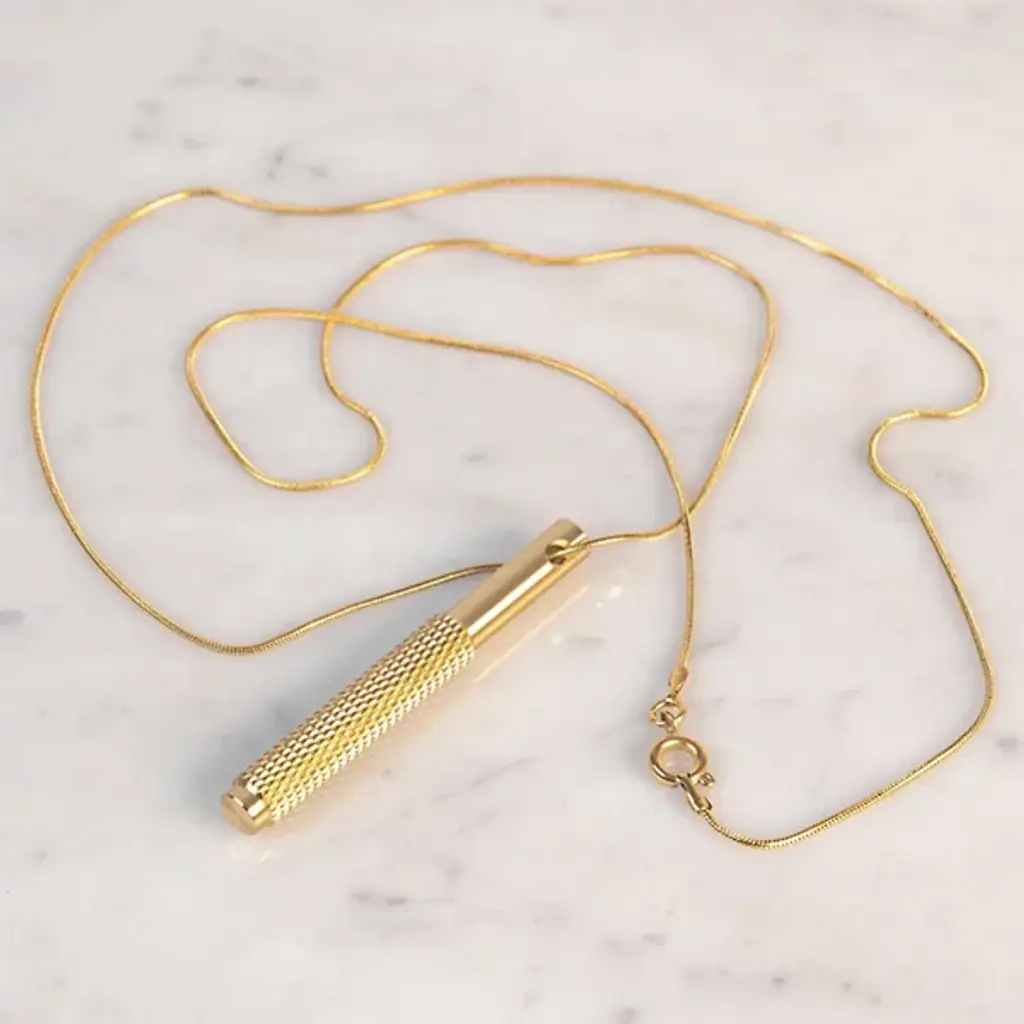 Add bold simplicity to your accessories with the Vertical Necklace by Buster + Punch. Composed of fine metal, this necklace features a slender, cylindrical pendant for an architectural, artisanal, modern look. The pendant is meticulously crafted to highlight the texture of the metal. The pendant hangs vertically from an uncluttered, streamlined look.