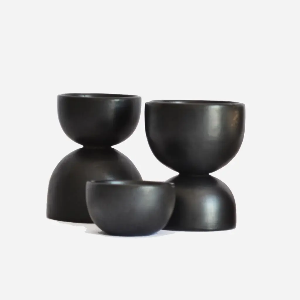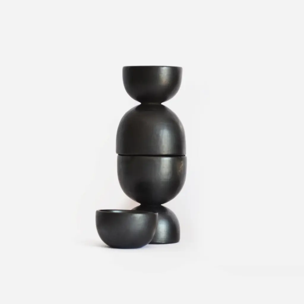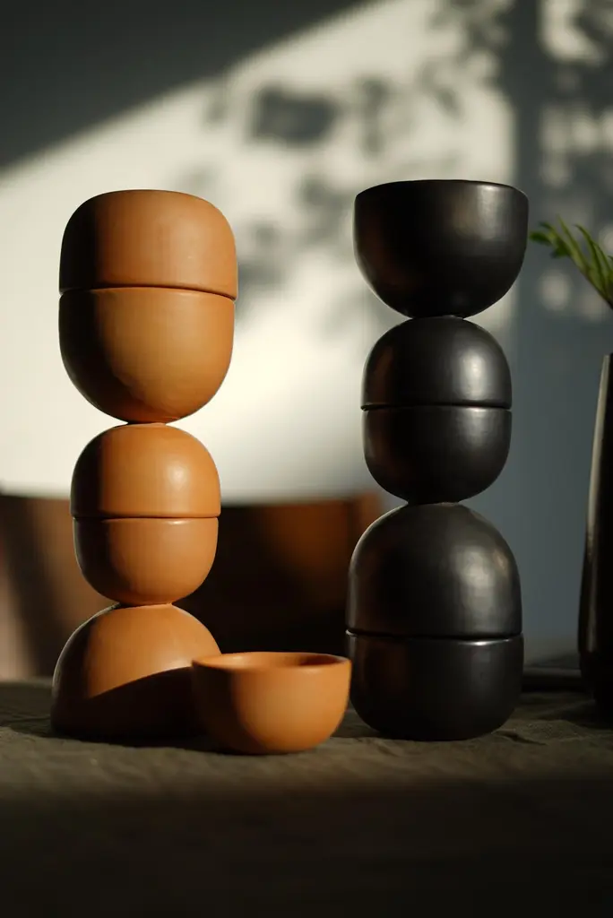 Castañas (chestnuts) is a sculpture made of a series of cups.The individual pieces can be rearranged to create different shapes, and can also be used as drinking cups for a coffee or mezcal.The towers are a celebration of a natural material, a clay local to Oaxaca, which is finished in two different ways to create contrasting colours.