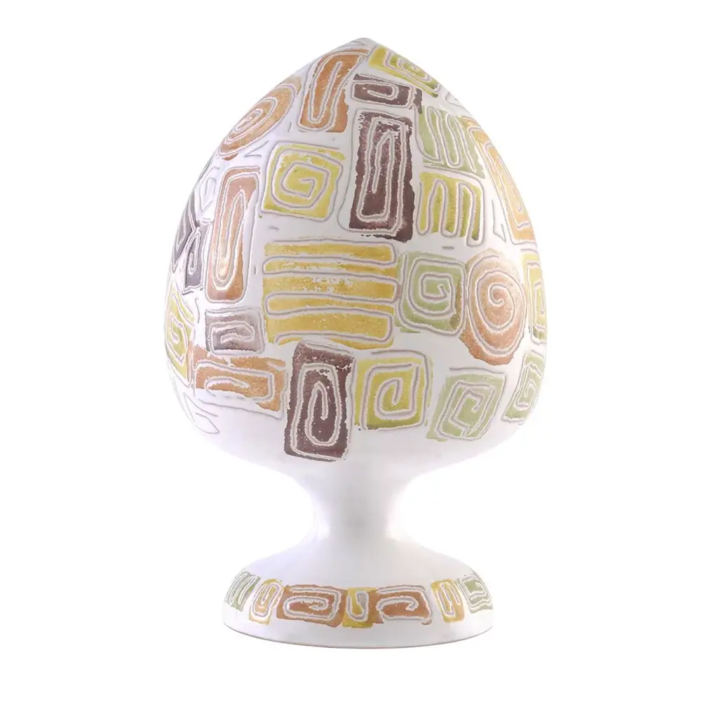 This stunning ceramic sculpture is a modern interpretation of a "pumo" (from the Latin "pomum" - fruit), a traditional object with a deep-rooted symbolism of wealth and rebirth in the Apulia region. Shaped like a flower bud about to blossom, it showcases dainty, finely painted vertical stripes in vibrant nuances such as yellow, red, and orange that is enhanced by the transparent glaze.