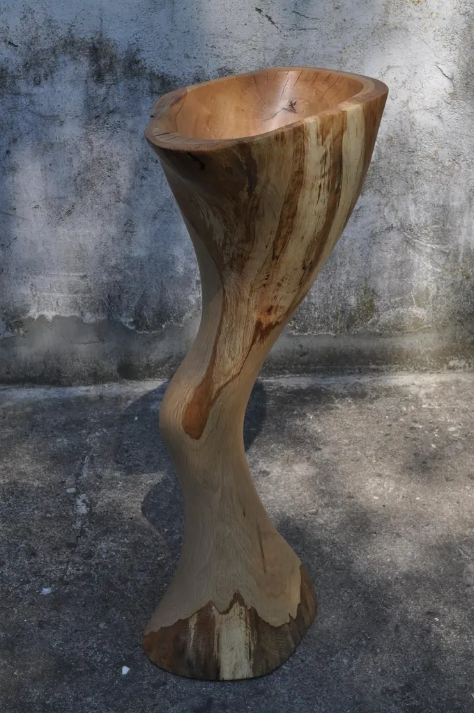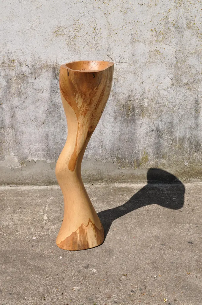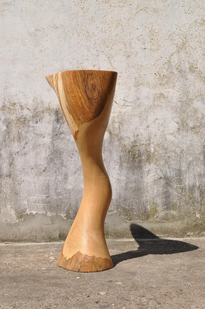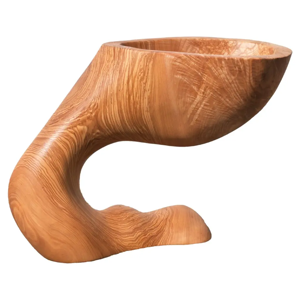 Vessel 1366 by Jörg PietschmannDimensions: D 30 x W 61 x H 111 cm Materials: oak. Finish: polished oil finish.Carved out of from a curved oak trunk.In Pietschmann’s sculptures, trees that for centuries were part of a landscape and founded in primordial forces tell stories inscribed in the memory of their fibers.The forms Jörg Pietschmann pares from ancient trees are extensive and astonishing with their physical presence, a combination of elegance and primeval nature. Pietschmann’s sculptures are monuments to the trees from which they derive.Being endowed with the ruggedness of primeval matter gives them a veritable vitality: figures that appear to have grown into the sculptural form of their own accord. But Pietschmann’s tangibly present bodies have undergone a considerable degree of metamorphosis.In order to generate these unique tree specimens, he examines the tree’s morphology and intrinsic inner map until the courses of its grain, of a curve, knots, and cracks concur with his projections. The exploratory process is accompanied by constant modification, giving at the start of each new piece no more than an intimation of the figure that will later emerge. In their completion, Pietschmann’s sculptures once more become a universal form.