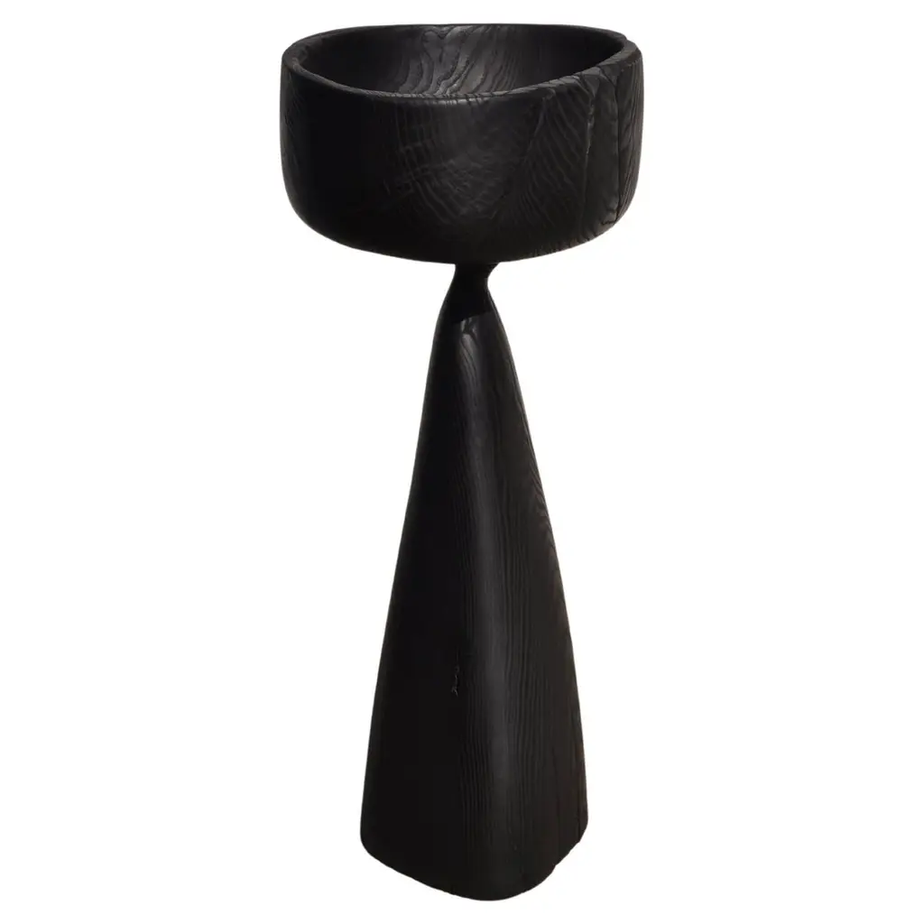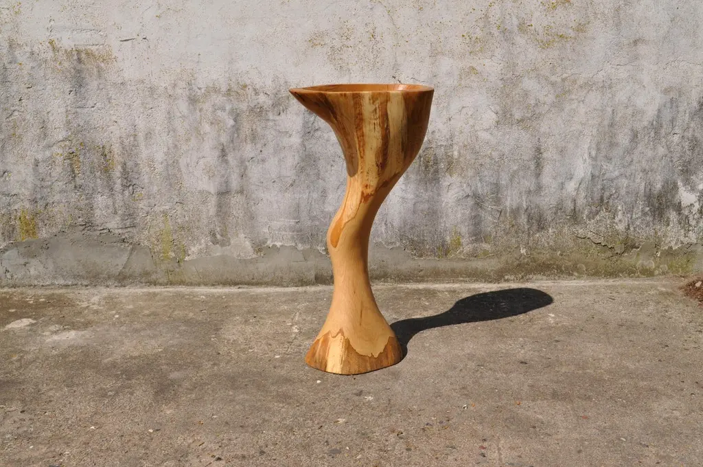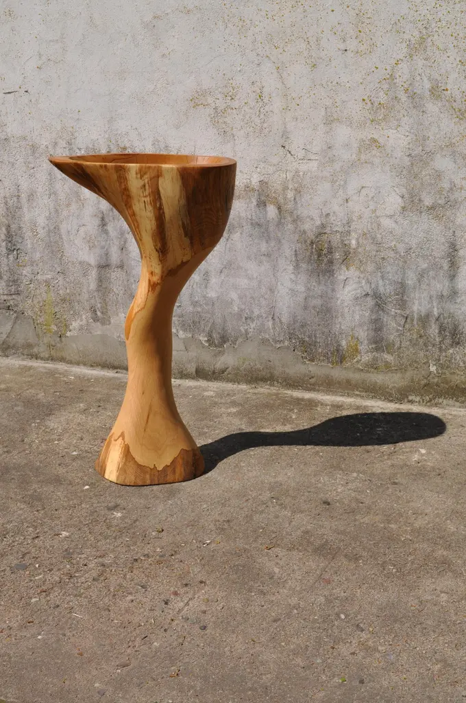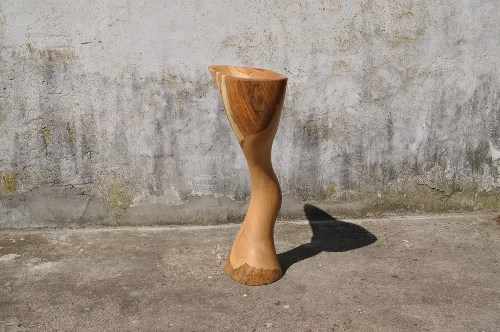 Vessel 1366 by Jörg PietschmannDimensions: D 30 x W 61 x H 111 cm Materials: oak. Finish: polished oil finish.Carved out of from a curved oak trunk.In Pietschmann’s sculptures, trees that for centuries were part of a landscape and founded in primordial forces tell stories inscribed in the memory of their fibers.The forms Jörg Pietschmann pares from ancient trees are extensive and astonishing with their physical presence, a combination of elegance and primeval nature. Pietschmann’s sculptures are monuments to the trees from which they derive.Being endowed with the ruggedness of primeval matter gives them a veritable vitality: figures that appear to have grown into the sculptural form of their own accord. But Pietschmann’s tangibly present bodies have undergone a considerable degree of metamorphosis.In order to generate these unique tree specimens, he examines the tree’s morphology and intrinsic inner map until the courses of its grain, of a curve, knots, and cracks concur with his projections. The exploratory process is accompanied by constant modification, giving at the start of each new piece no more than an intimation of the figure that will later emerge. In their completion, Pietschmann’s sculptures once more become a universal form.