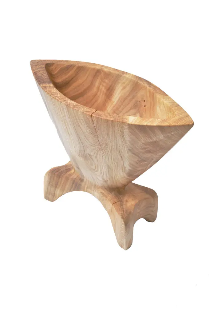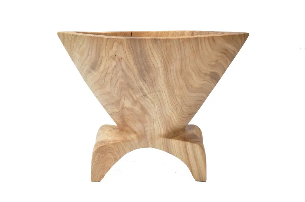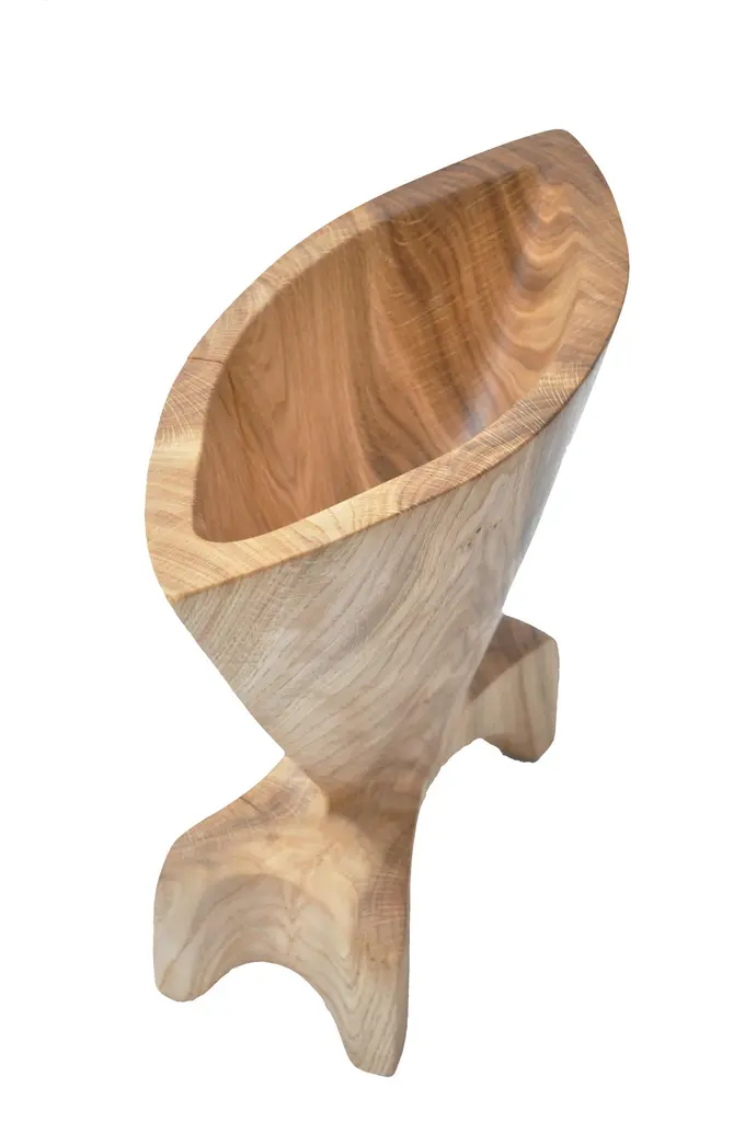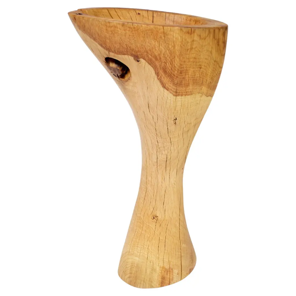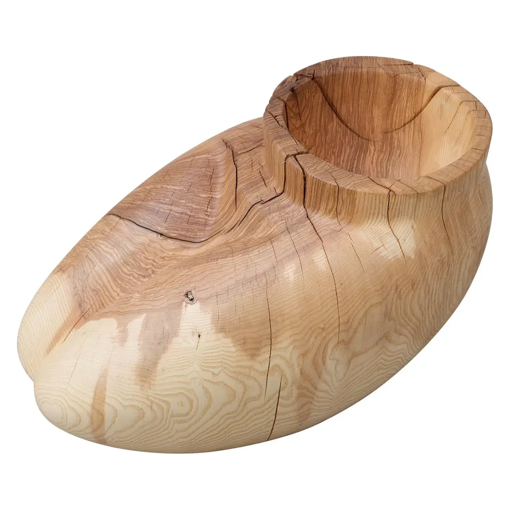 Vessel 1618 by Jörg PietschmannDimensions: D 19 x W 45 x H 37 cm Materials: oak.Finish: polished oil finish.In Pietschmann’s sculptures, trees that for centuries were part of a landscape and founded in primordial forces tell stories inscribed in the memory of their fibers.The forms Jörg Pietschmann pares from ancient trees are extensive and astonishing with their physical presence, a combination of elegance and primeval nature. Pietschmann’s sculptures are monuments to the trees from which they derive.Being endowed with the ruggedness of primeval matter gives them a veritable vitality: figures that appear to have grown into the sculptural form of their own accord. But Pietschmann’s tangibly present bodies have undergone a considerable degree of metamorphosis.In order to generate these unique tree specimens, he examines the tree’s morphology and intrinsic inner map until the courses of its grain, of a curve, knots, and cracks concur with his projections. The exploratory process is accompanied by constant modification, giving at the start of each new piece no more than an intimation of the figure that will later emerge. In their completion, Pietschmann’s sculptures once more become a universal form.
