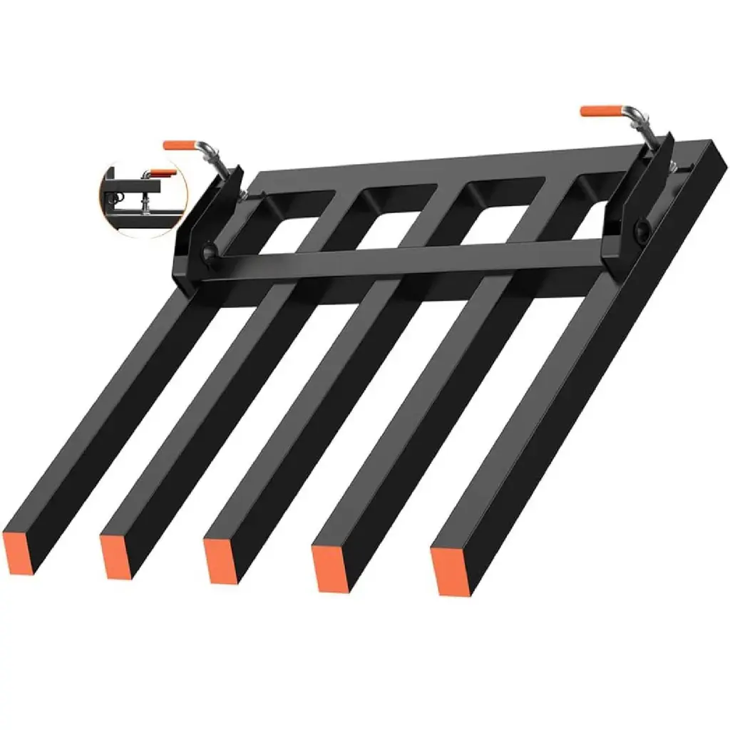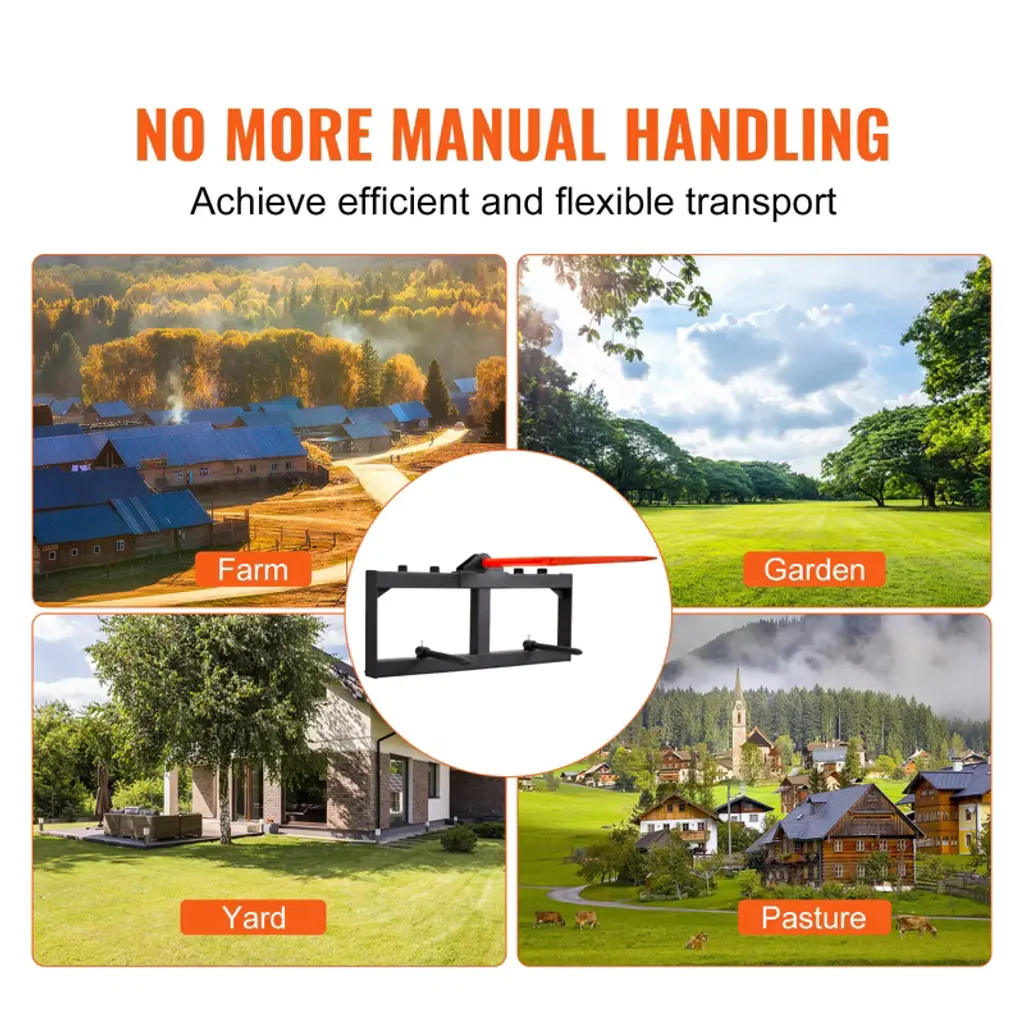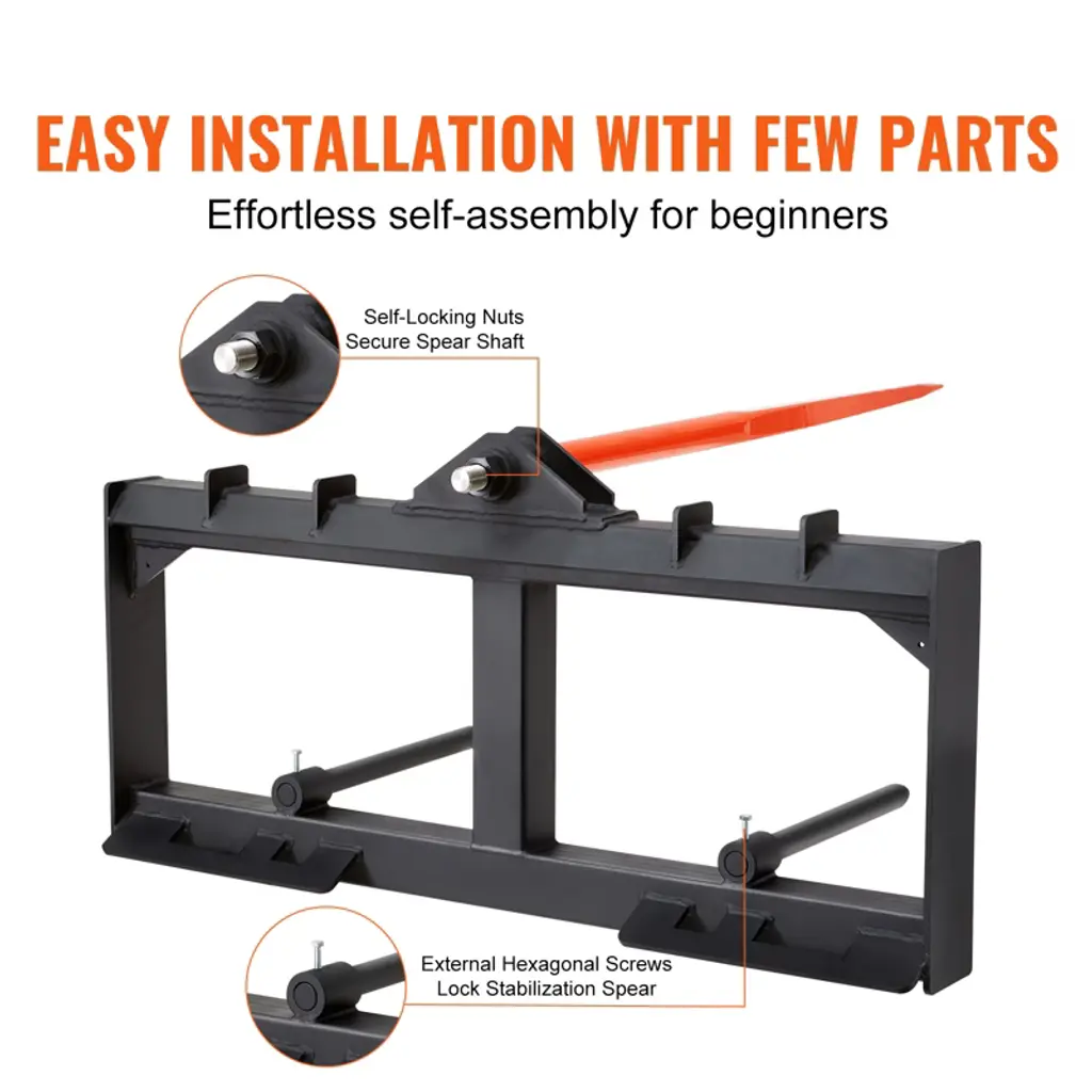 Feature: 1600 LBS High Load Capacity: VEVOR hay spear boasts an impressive 1600 lbs load capacity. With an enhanced 2.36" diameter, 1.18" thread diameter, and 2.05" thread length, it ensures stability, even when dealing with large hay bales, preventing tipping. Premium Spring Steel: The bale spear shaft is crafted from high-strength spring steel material with a powder coating, making it robust, and resistant to bending, breakage, and corrosion. The 49" shaft effortlessly penetrates thick hay stacks, ensuring long-lasting durability. Universal Compatibility: Our hay bale spear is compatible with most skid steer loaders and tractors with a quick attach system. Its precise measurements ensure a hassle-free fit, eliminating compatibility concerns. Easy Installation: With fewer components and straightforward assembly, even beginners can install the tractor hay spears effortlessly. The included self-locking nuts and external hex screws secure the long spears, ensuring safe and worry-free usage. Effortless Handling: Manual handling of hay is labor-intensive and time-consuming. With the VEVOR hay forks for tractor, you can efficiently move hay, greatly improving work efficiency. It's ideal for agricultural, landscaping, yard, and pasture applications, saving you time and effort. Package Content: 1 x Hay Spear 1 x User Manual