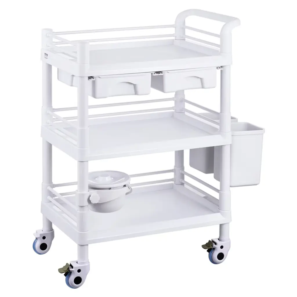 Feature: Dual-Layer & Dual Drawers: Featuring a two-tier structure, this laboratory utility cart offers ample room for equipment. Its protective rail guard prevents items from sliding off. With two stainless steel drawers, it's effortless to organize documents and prevent dust buildup. Reliable Quality: Crafted from sturdy stainless steel, this lab cart is known for its easy cleaning. This robust material simplifies your daily tasks, ensuring both functionality and ease. Four Universal Wheels: Equipped with four 360° wheels, including two with foot brakes, this rolling cart allows easy transportation of tools or items. Say goodbye to the hassle of moving heavy objects. User-Friendly Handle: A comfortable grip on the top shelf facilitates smooth movement, enhancing usability and convenience. Wide Applications: Ideal for laboratories, spas, beauty salons, as well as various environments like cafeterias, janitorial rooms, hotels, and offices. Wherever you need it, this cart offers convenience. Package Content 1 x Lab Medical Cart 1 x Bucket
