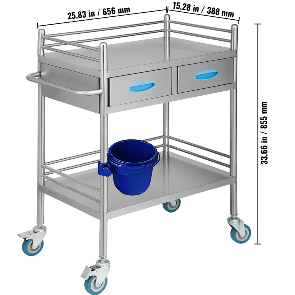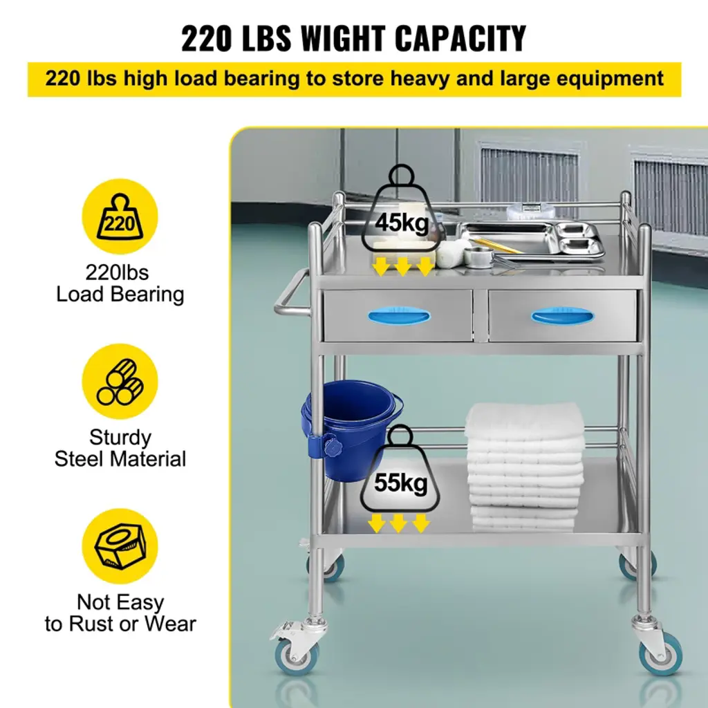 Vevor Lab Serving Cart, 2 Layers Stainless Steel Utility Rolling Cart, Medical Cart With Two Drawers, Dental Utility Cart